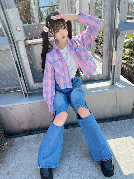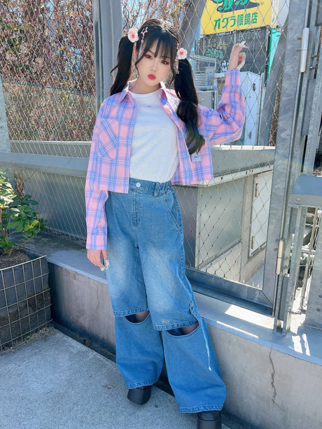 ピンクチェック×デニムが目を引くかわいさ👀