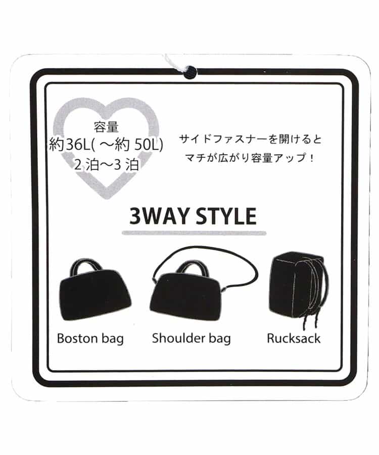 マチが広がる仕様で、荷物が増えてもOK。マックスで50Lの容量があるので、2~3泊の旅行にぴったり。リュックサックとして背負うことも可能です。本体容量・最小約36L・最大約50Lショルダーベルト付き対象年齢:6歳以上変形の恐れがありますので、火気には近づけない下さい。素材の特性上、汗や水等で色落ちや色移行する可能性があります。この商品は洗えません。装飾品は無理に引っ張ると破損する恐れがあります。小さな部品がありますので、小さなお子様が誤って飲み込まないように注意してください。用途以外に使用しないでください。過度の重量物を入れてのご使用はご遠慮ください。販売元:株式会社スニフ