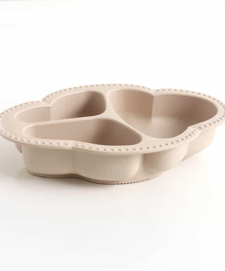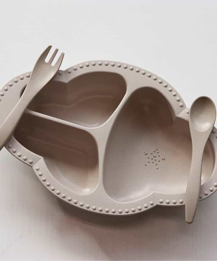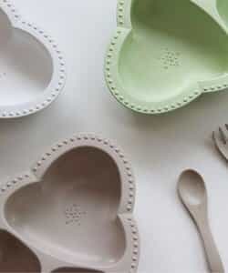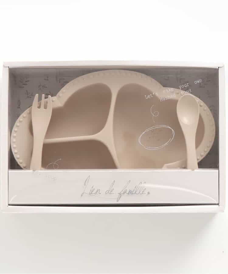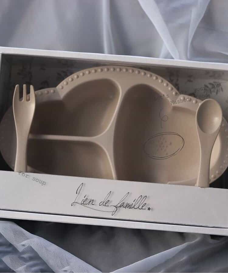 コンセプトは「大人と一緒に囲む食卓」。インテリアに馴染む、Lienならではの大人なデザインの食器。食べやすさにもこだわったつくりで、食材をすりつぶすことができる突起付き。自然素材でエコにも配慮。