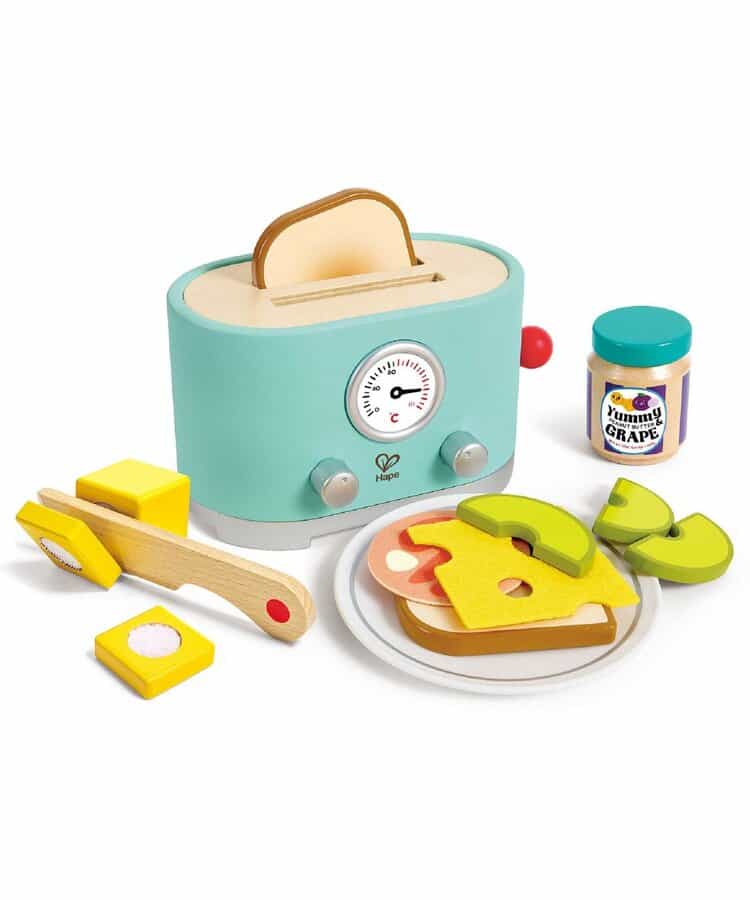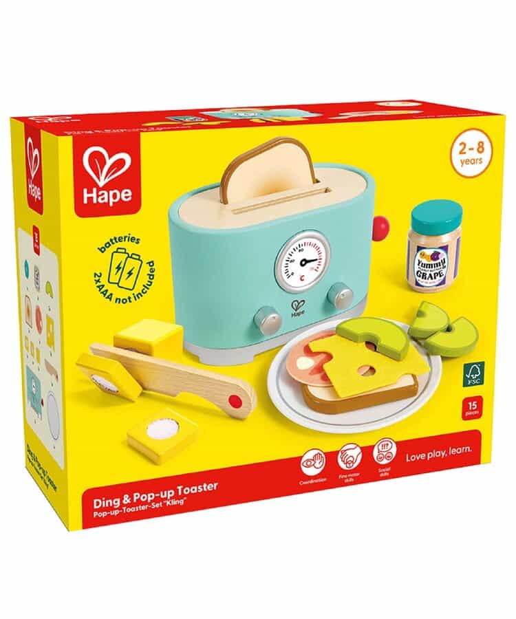 パンが飛び出す!楽しいトースターセット!●パンをトースターにセットしてレバーを下げたら準備完了!タイマーの音が鳴り出し、しばらくするとポンっという音と一緒にパンが勢いよく飛び出します。●お皿に乗せてジャムを塗ったり、ハムやチーズをのせたり、ごっこ遊びを楽しむ小物がたっぷり入ったセットです。【HAPE】世界60か国以上で愛されるヨーロッパ生まれおもちゃ。遊びを通して学び、育てることをモットーにして生まれた優れたデザインと高い品質から、様々な賞や高い評価を得ています。