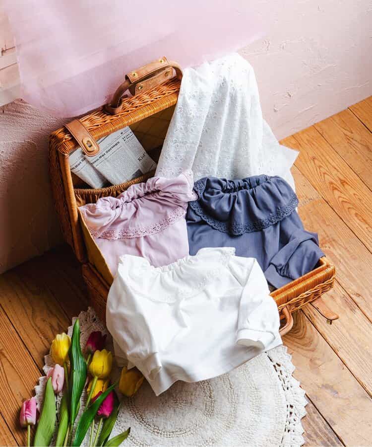 衿フリルの端にはさりげないテープレースをあしらい、1枚でも自然におしゃれを楽しめます。