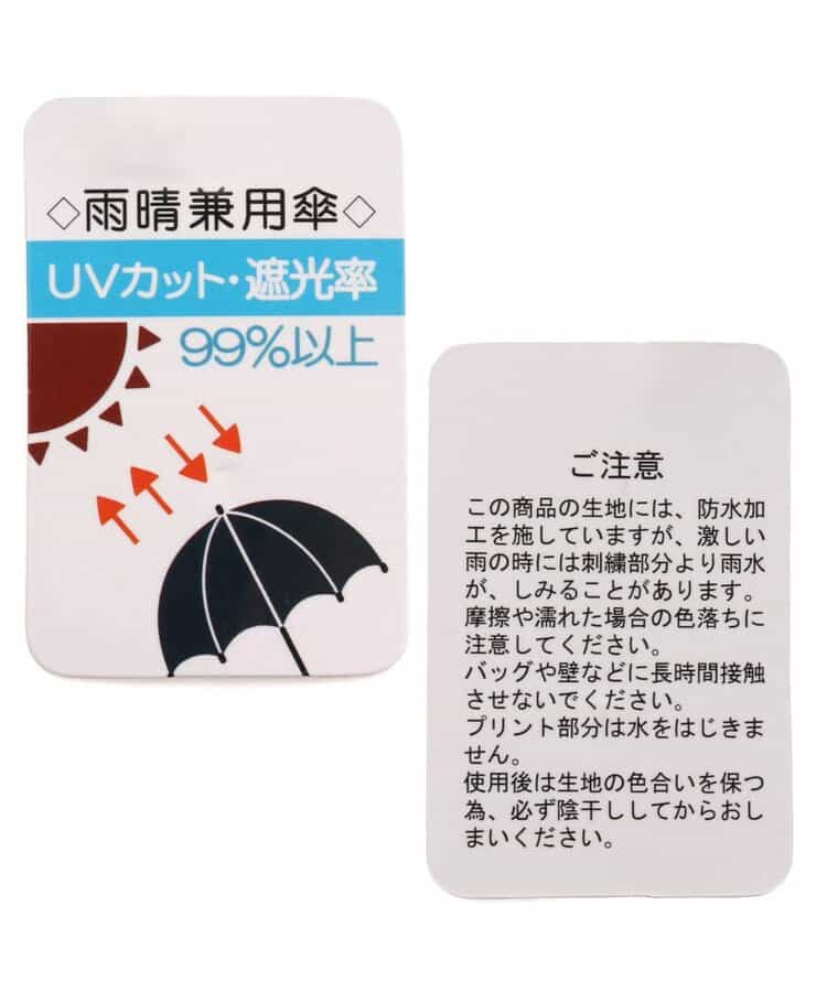 雨の日もお気に入りの傘で気分アップ!晴雨兼用なので、日傘としてもお使いいただけます。雨の日も、日差しが気になる日もこれ1本あれば安心◎お揃いのレインコートはこちら >>折り畳み傘タイプはこちら >><お取り扱いのご注意>[傘]○お子様がご使用の際には、保護者の方が正しい使い方をご指導のうえ使用して下さい。○製品には尖った部分があります。使用時や開閉の際は周囲にあたらないように周囲の安全を十分に確認のうえご使用下さい。特にジャンプ式傘をご使用の場合は、顔や身体から離して開閉を行って下さい。○ステッキがわりや傘で物をたたく、投げるなど乱暴な扱いはお避け下さい。破損の原因となります。○強風時は、破損する恐れがありますので、使用をおやめください。○手元や傘骨が壊れた場合は、怪我や事故につながる恐れがあるため、使用を中止して下さい。○傘骨にグラスファイバーを使用している場合は、以下の点をご注意の上、ご使用下さい。・グラスファイバー部分には素手で触らないでください。・傷ついたり、ささくれたグラスファイバーに触れると、手や指にガラス繊維のとげが刺さることがあり、危険です。・傘骨に強い衝撃や圧迫を与えないでください。・表面に傷が付いた場合、劣化した場合、変形した場合は、ご使用をおやめください。ガラス繊維の先端が表面から飛び出すことがあります。※傘の先端(石突き)は、商品によりサイズでデザインが異なる場合がございます。