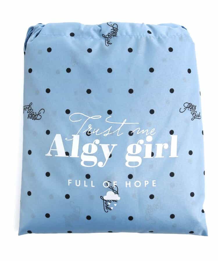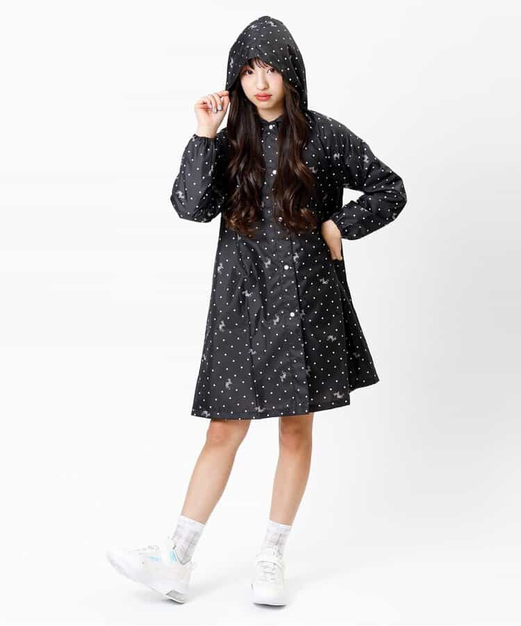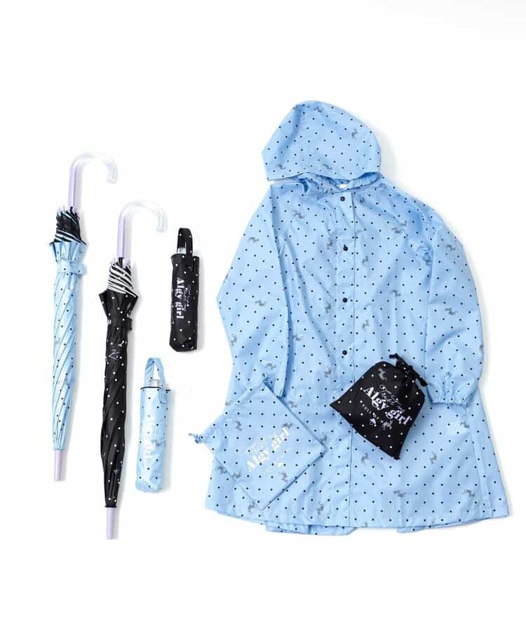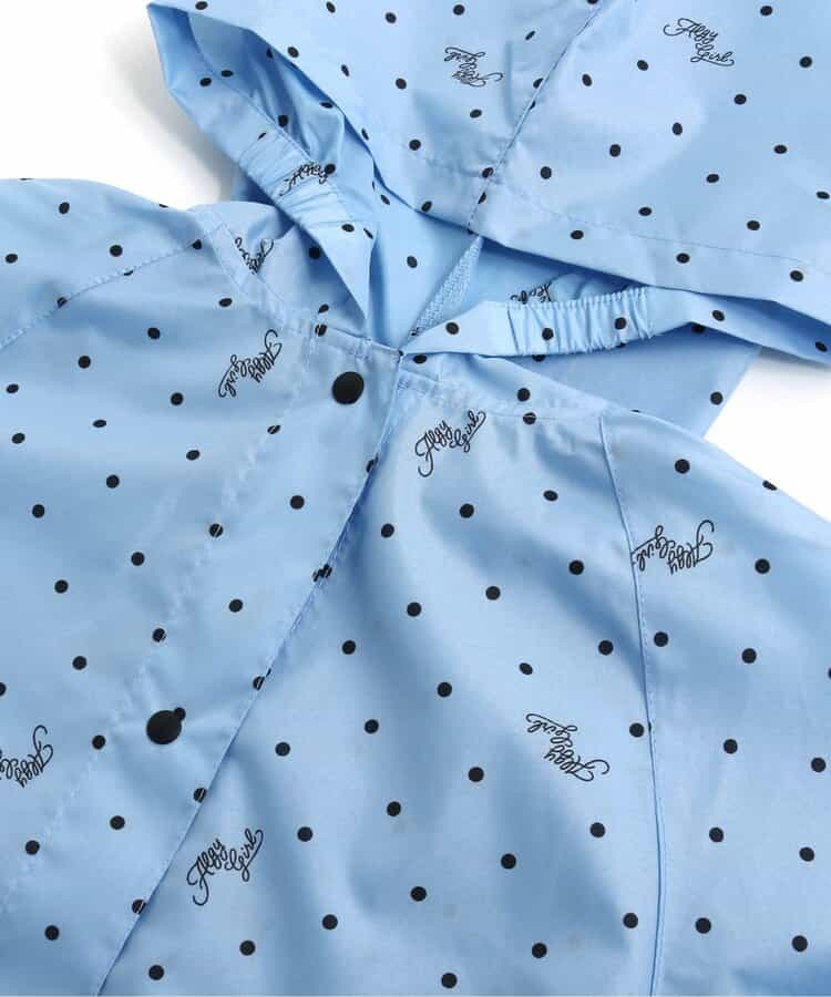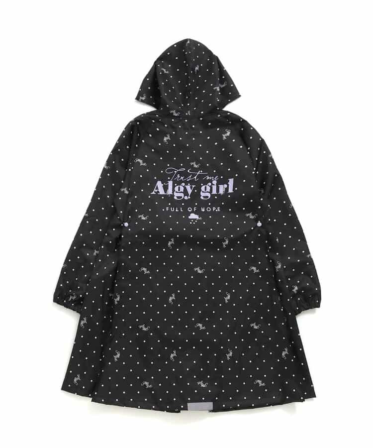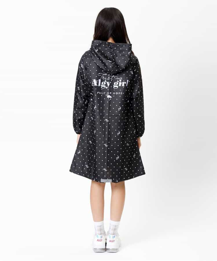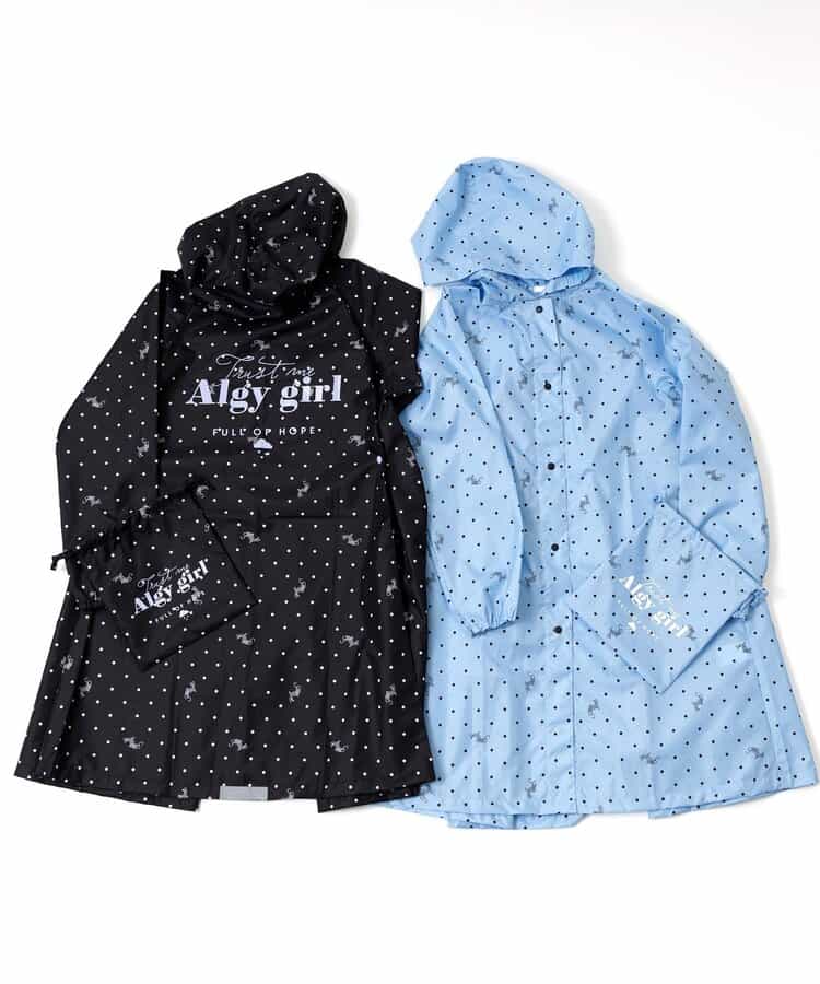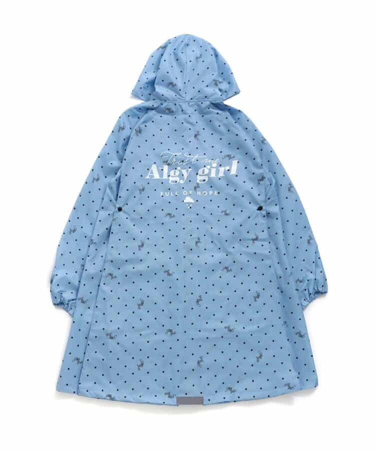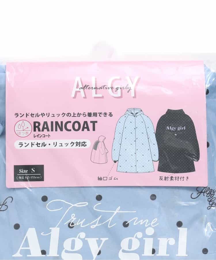 ALGY(アルジー)のレイングッズ「ALGYソウガラレインコート」は、流行に敏感な女のコの日常を可愛く、甘く彩るデザインが人気!お揃いの傘はこちら >>お揃いの折り畳み傘はこちら >><お取り扱いのご注意><撥水・防水加工の取り扱いのご注意>○撥水加工及び防水加工は永久的なものではありません。ご使用中の摩擦や汚れの付着、又は洗濯を繰り返す事により効果が低下します。○効果が低下してきた際はクリーニング店に撥水加工を依頼して下さい。または、市販の防水スプレーを使用して下さい。○完全防水ではありませんので、強い雨での長時間使用はお避け下さい。縫い目及び布部分より水が中へ入る場合がありますので、ご注意下さい。○直射日光等、光の強い所に長時間放置しないで下さい。変色の恐れが有ります。○火気や暖房器具のもとへ近づけないで下さい。