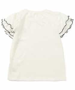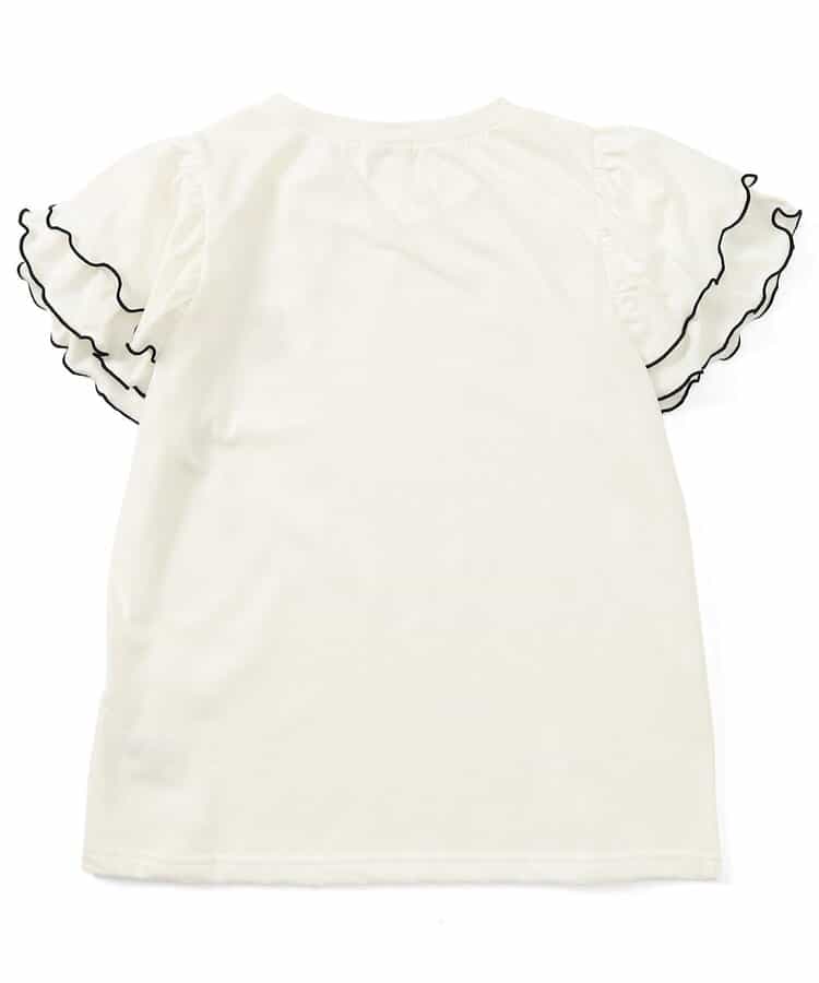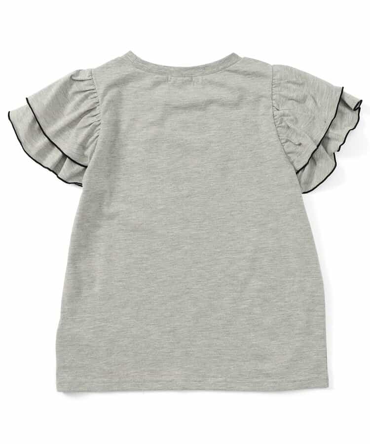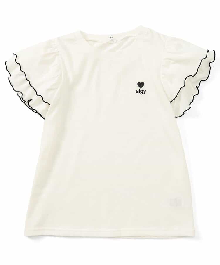 袖のフリルがかわいいです。 身長140センチでXSにしました。 サイズ感ちょうどいいです。 フロントは胸のワンポイントだけのシンプルなデザインですが、袖のフリルがボリューミーでいま流行りのビスチェのインナーとかにも最適です!