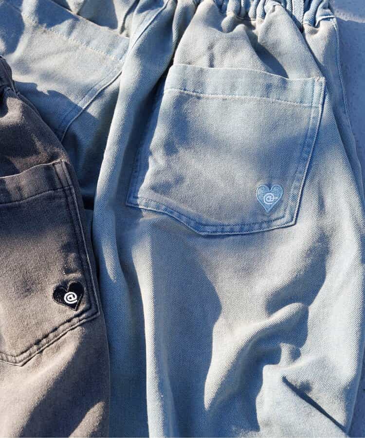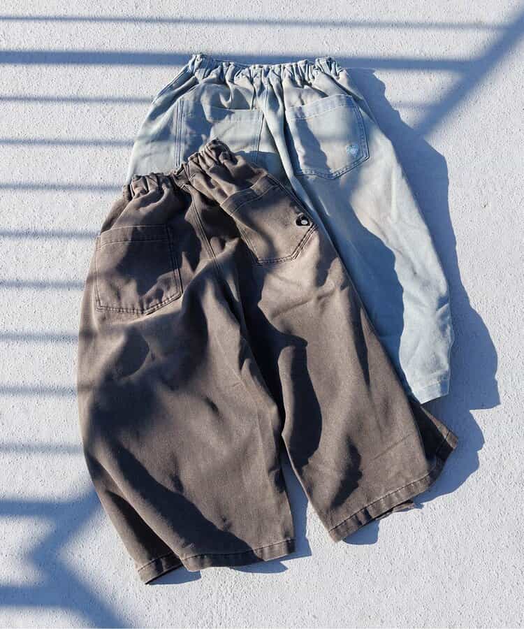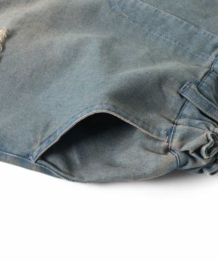 この商品はユーズド感を出す為、製品洗い・製品染め・ブリーチ(脱色)・生地切れ・糸切れ等の2次加工を施しております。