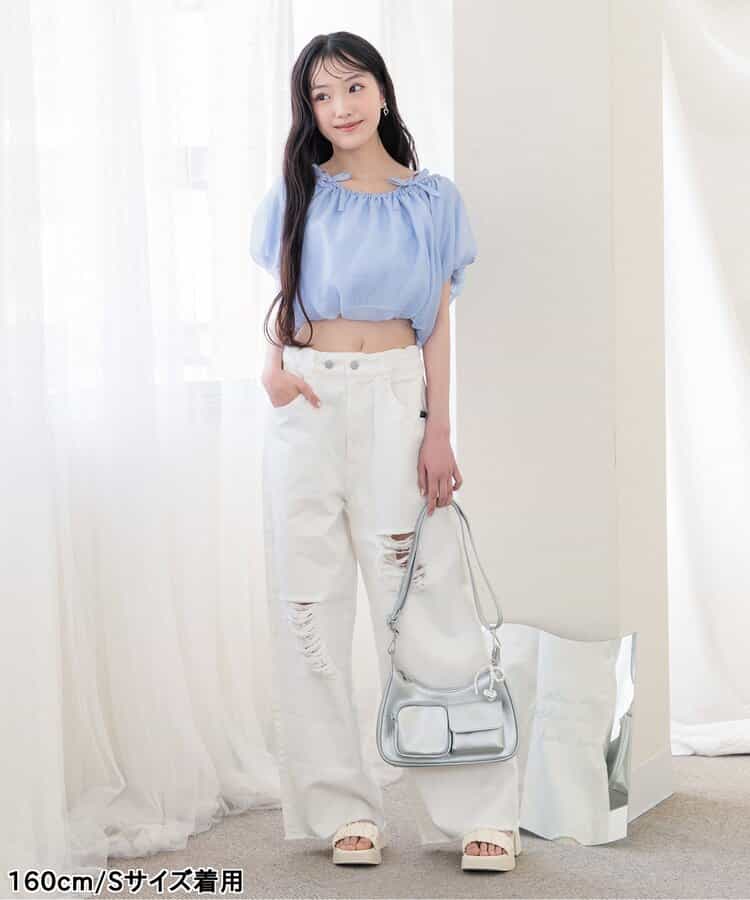 【6/19(木)21:00~販売】algy(アルジー)のシャツ・ブラウス「2WAYオフショルブラウス」。肩を見せずに半袖ブラウスとしても、肩を出してオフショルブラウスとしても可愛く着られる2WAY仕様。肩紐はアジャスター付きで、着方に合わせて長さ調節可能◎少し光沢のあるシフォン生地が高見えする、夏のおでかけにぴったりのブラウスです。【 algy ーアルジー ー 】『おしゃれを楽しみたいティーンズのリアルクローズ』着たい 欲しい トレンド・・・全部そろう小中学生向けブランドです。