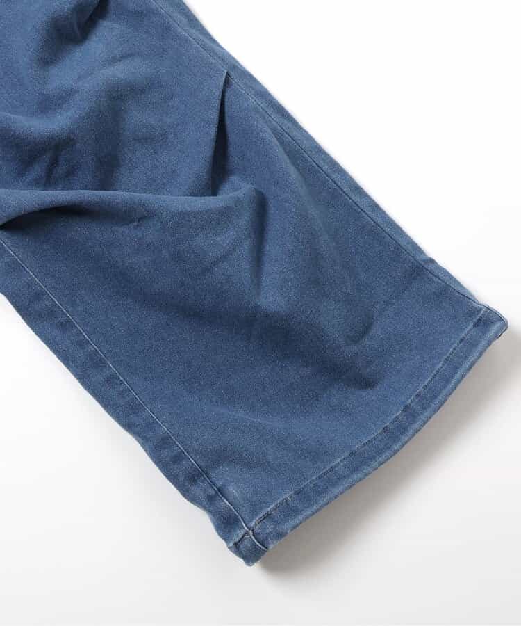 この商品はユーズド感を出す為、製品洗い・製品染め・ブリーチ(脱色)・生地切れ・糸切れ等の2次加工を施しております。