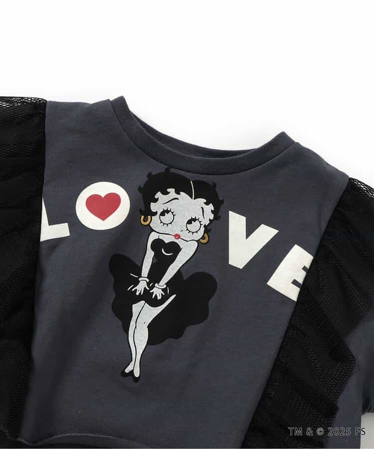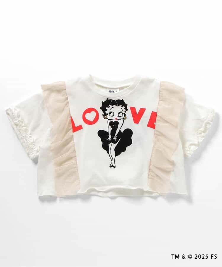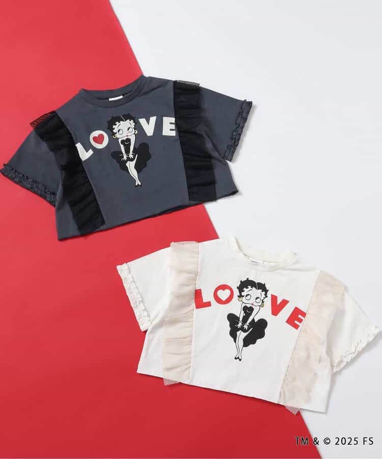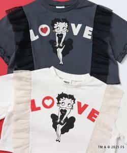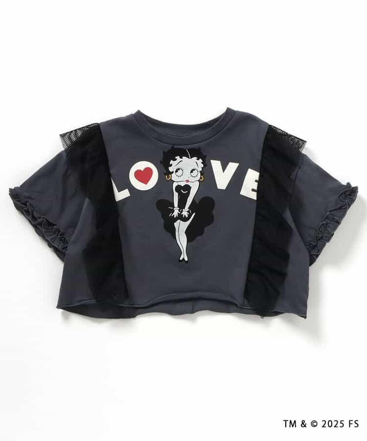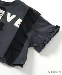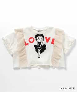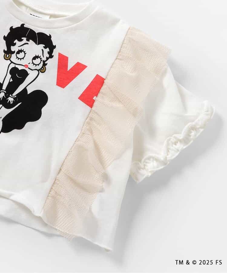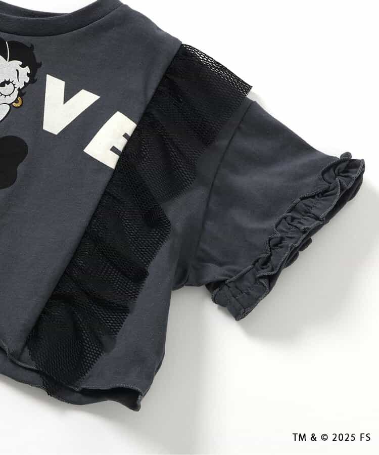 【Betty Boop (TM)】ベティーちゃんや「LOVE」のプリントが目を惹くデザインのTシャツは、メッシュ素材のフリル付きで存在感抜群!袖部分やバックプリントにも注目◎短めの着丈でどんなボトムスともバランスよく着ていただけます♪ゆったりワイドなシルエットなので暑い夏もストレスフリー◎お出かけにもおすすめアイテムです♪