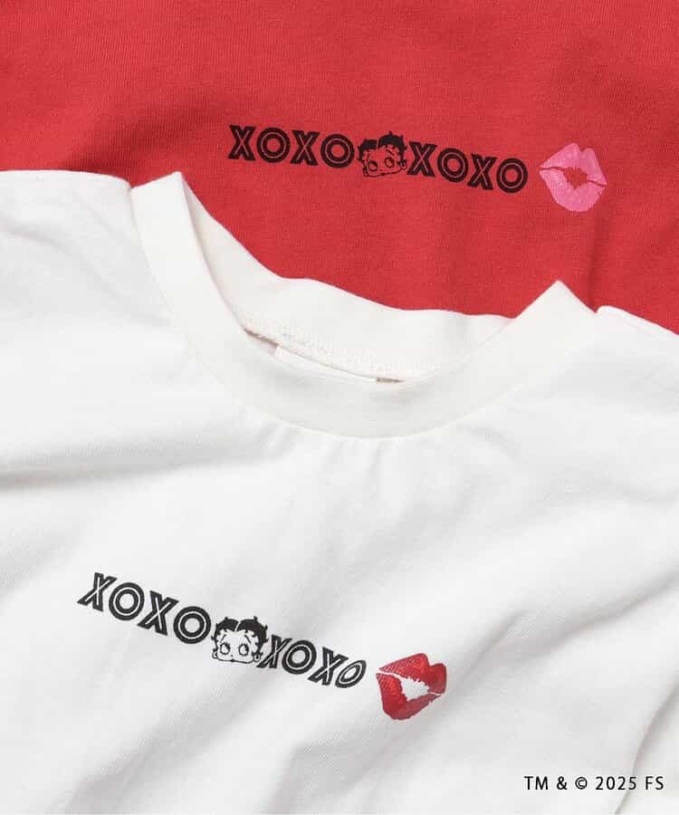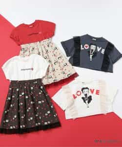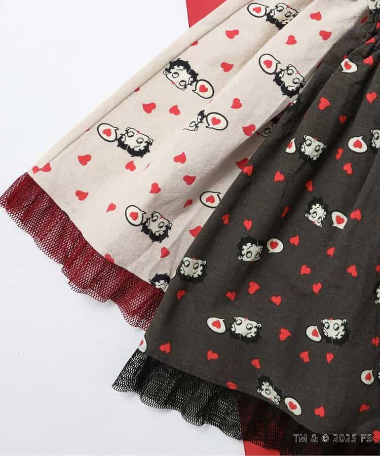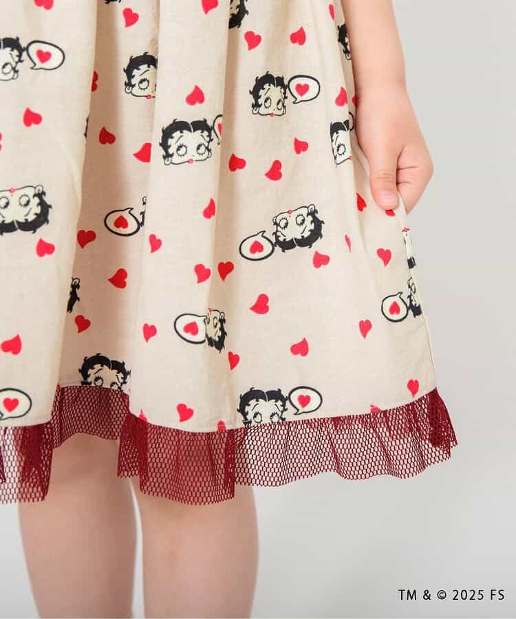 【Betty Boop (TM)】主役級のワンピースが登場♪ベティーちゃん×ハートの総柄はインパクト大!ウエストの切替でスタイルUPも叶っちゃう・・♪お袖のふんわりとしたシルエットや、裾のメッシュ素材のフリルなど細かいところもこだわりポイント◎トップスはカットソー素材で夏のお出かけにピッタリ♪おともだちや姉妹でリンクコーデもおすすめです!