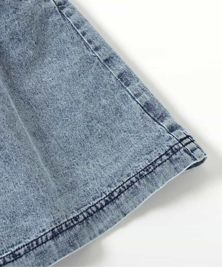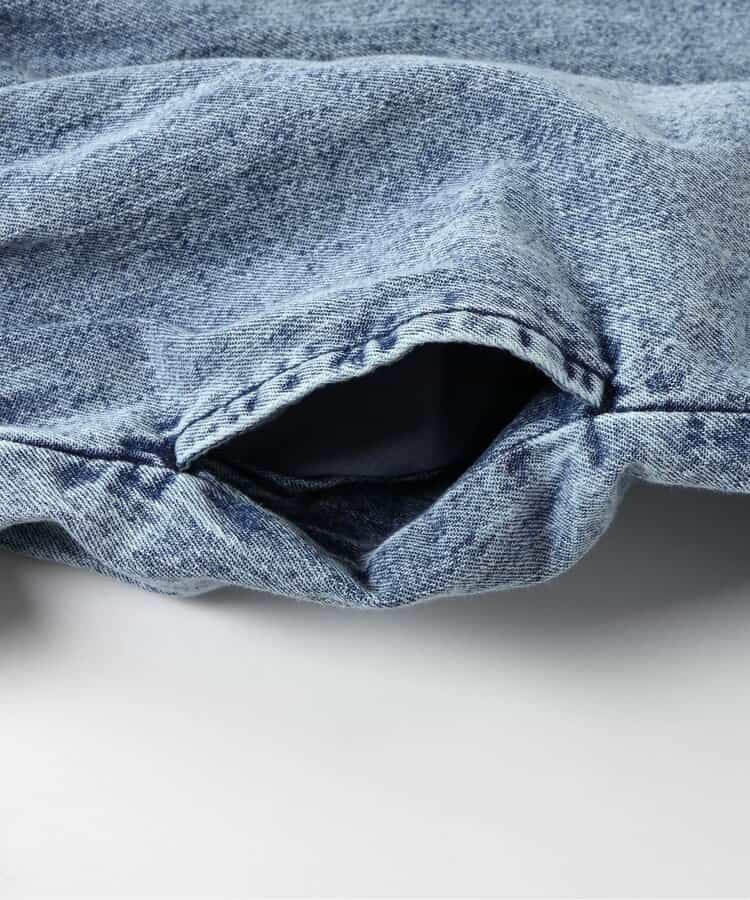 この商品はユーズド感を出す為、製品洗い・製品染め・ブリーチ(脱色)・生地切れ・糸切れ等の2次加工を施しております。