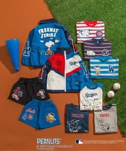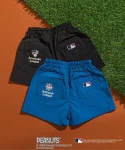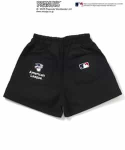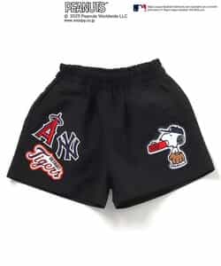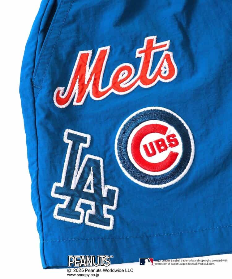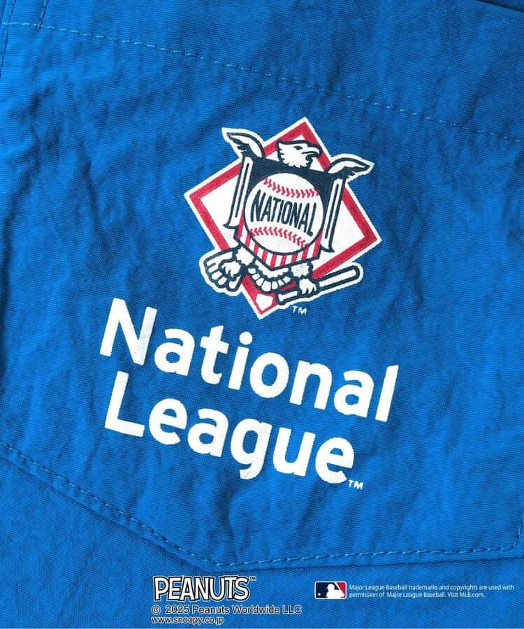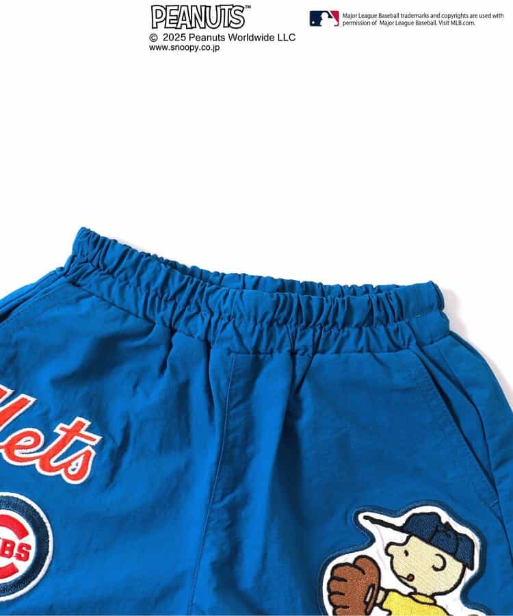 【2/20(木)21時~発売】 【PEANUTS×MLB】 アメリカン・リーグとナショナル・リーグの刺繍が目を惹く、動きやすいワイドな4分丈のハーフパンツ。 スヌーピーやチャーリー・ブラウンも野球をエンジョイ♪ 同素材のジャケットとセットでの着こなしもおすすめ!