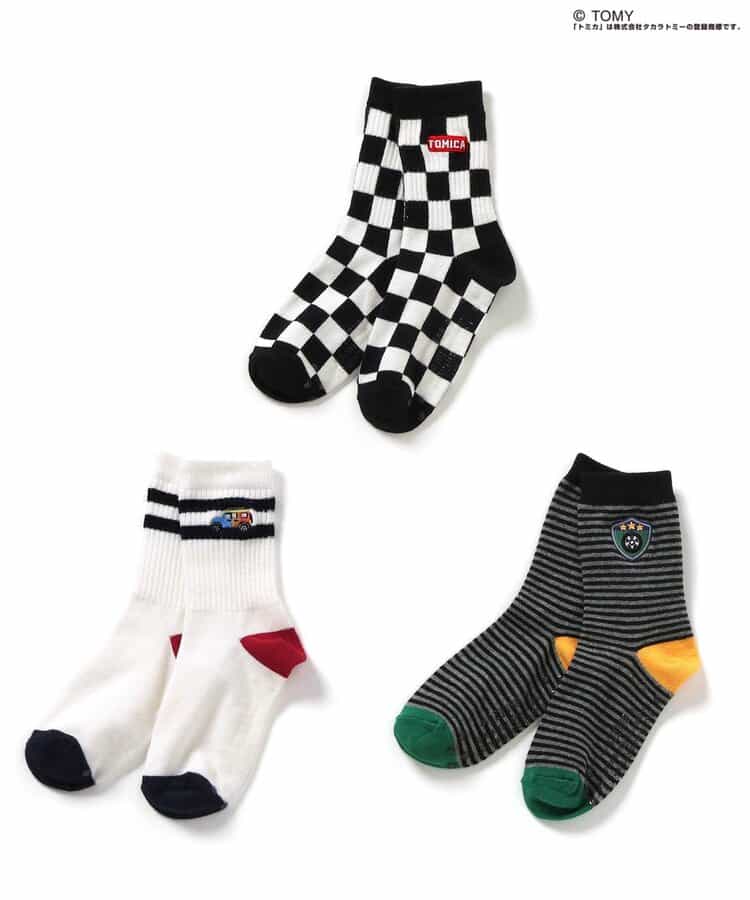 【TOMICA】ソックスが3セット入ったソックスギフトセット♪3色すべて違った柄と刺繍ワッペンがデザインされており、毎日気分でお好きなソックスを選ぶのも楽しそう・・!★もちろん、きょうだいでおそろいも◎お友だちへのギフトにもおすすめです!大人サイズもあるので、親子でおそろいができちゃうのもうれしい!靴下のSS・S・10-12cm・13-15cm、タイツの70-80cm・80-90cm・90-100cmには基本的に靴下に滑り止め加工がございます。(一部除外あり)