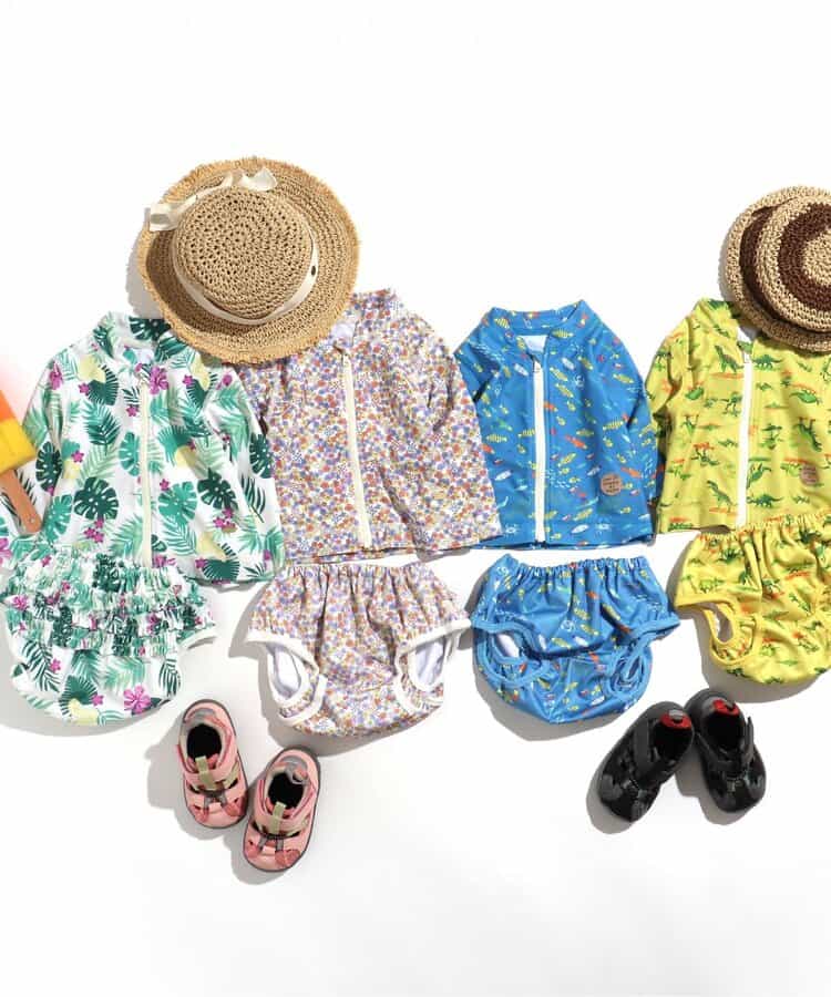 【BREEZEのスイムウェア】新しくベビー用の水遊びセットが登場!実際に子育てをしているママ・パパの声をもとに実現!パンツ部分は横漏れ防止・防水仕様・イージーケアで洗いやすいようにと、素材や生地にこだわりました!