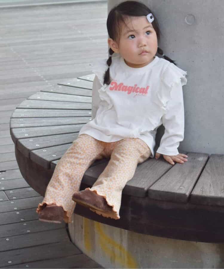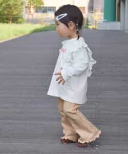 フレアパンツでシルエットがとっても可愛いです。肌触りも良くてしっかりした生地なので秋冬楽しめます。うしろポケットのワンポイントまで可愛くて360°どこから見てもとにかく可愛いです。1歳9ヶ月 / 身長80cm / 10kg / 90cm着用でウエストも丈もぴったりでした。#PR