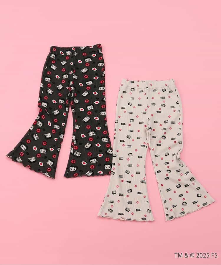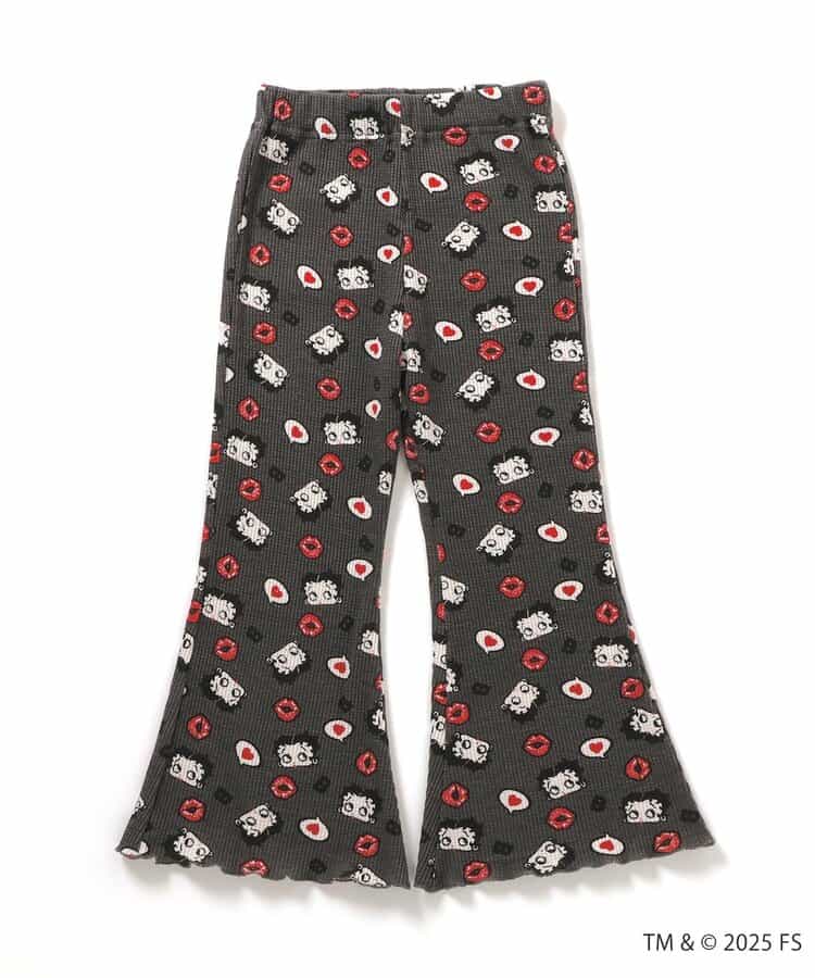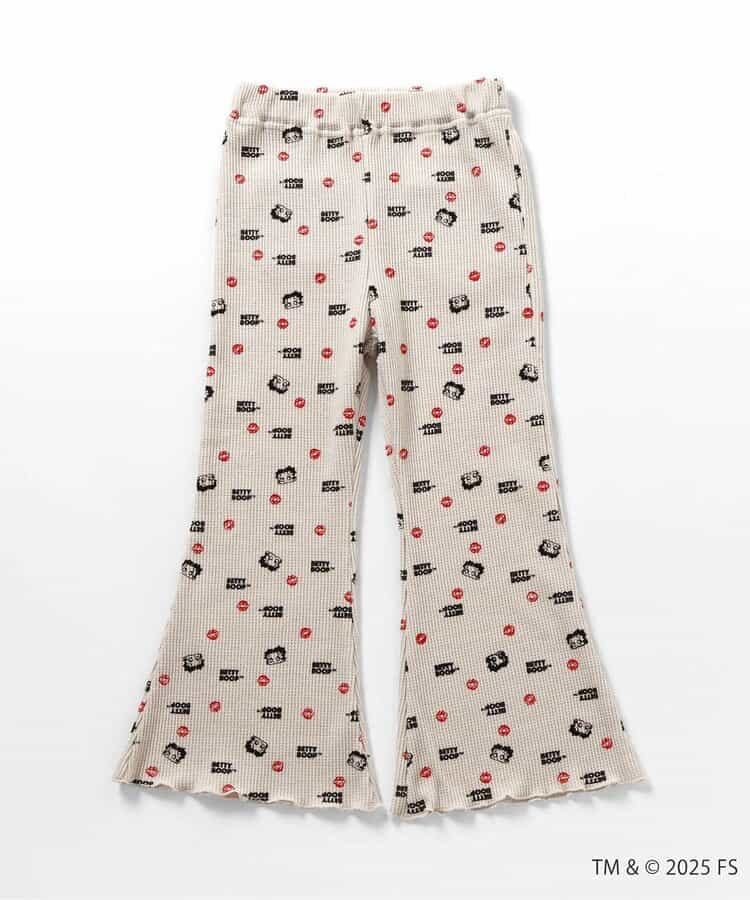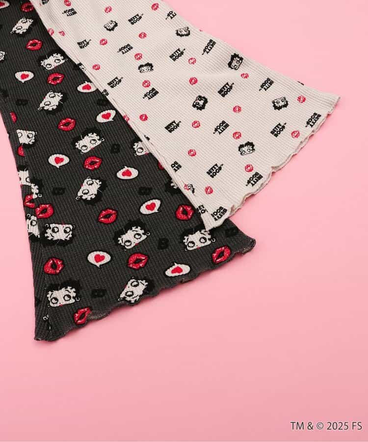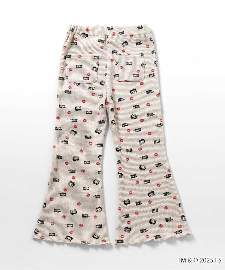 【9/5(金)お昼12時~販売】 【Betty Boop™】 ベティーちゃんの総柄がとびきりキュート♪トレンド感たっぷりのフレアパンツが登場! 柔らかなワッフル生地で履き心地もバツグン。動きやすさとおしゃれを両立したパンツです♪ カラーはブラックとホワイトの2色展開◎ どちらも大人っぽいコーデにぴったりで、甘すぎないデザインが魅力です。 姉妹でおそろいコーデもおすすめです♪