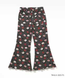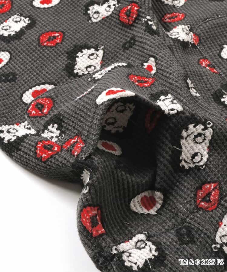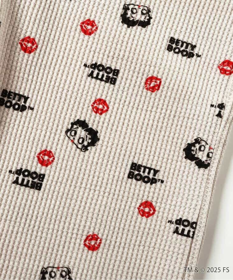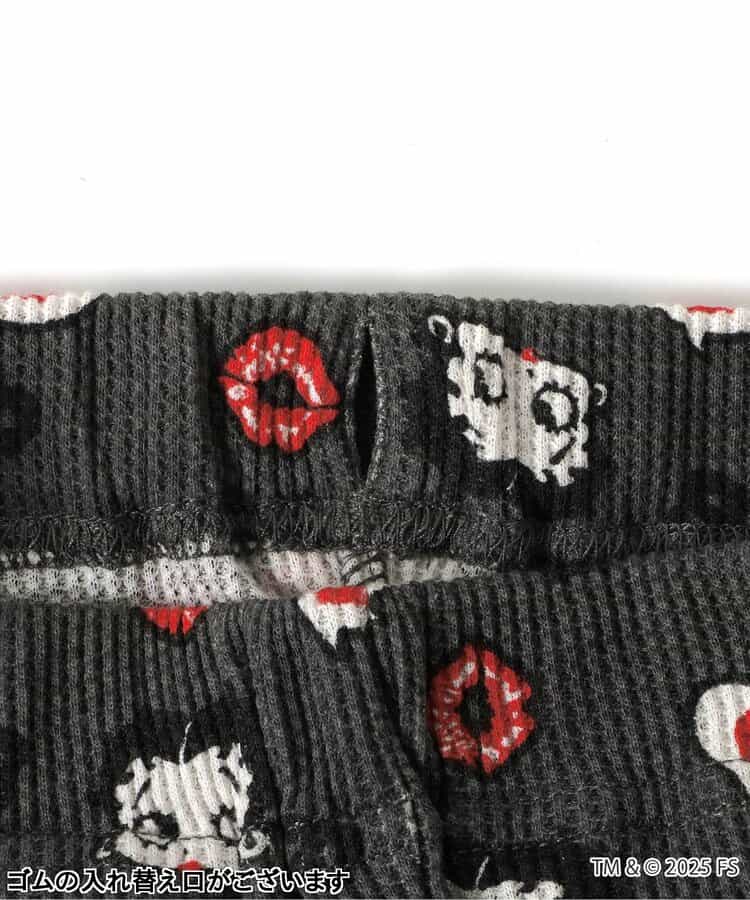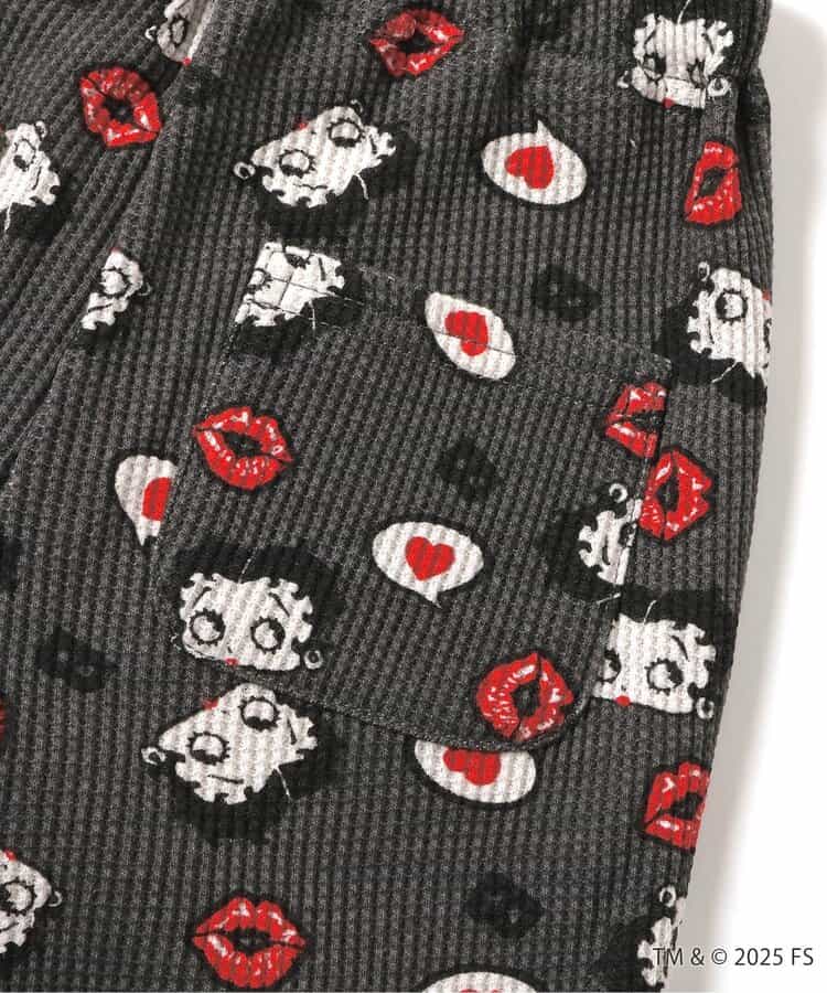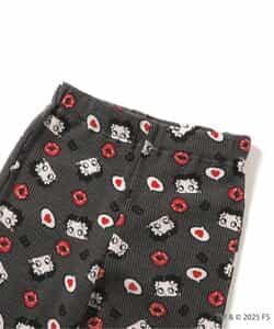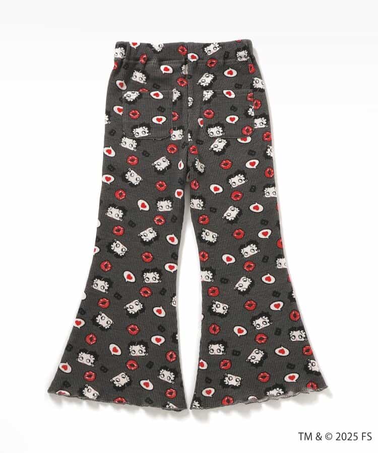 【9/5(金)お昼12時~販売】 【Betty Boop™】 ベティーちゃんの総柄がとびきりキュート♪トレンド感たっぷりのフレアパンツが登場! 柔らかなワッフル生地で履き心地もバツグン。動きやすさとおしゃれを両立したパンツです♪ カラーはブラックとホワイトの2色展開◎ どちらも大人っぽいコーデにぴったりで、甘すぎないデザインが魅力です。 姉妹でおそろいコーデもおすすめです♪