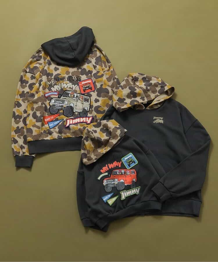 ※入荷状況により販売日が前後する場合がございます。 【BREEZE×Jimny】 SUZUKIの人気車種『Jimny』とBREEZEのスペシャルコラボアイテムが登場! イラストはウシオダヒロアキ氏作! カモフラ柄に、オリジナルイラストがインパクト大! さらに刺繍ワッペンがちりばめられた、遊び心満点のデザイン♪ 親子で楽しめるキッズサイズ&大人サイズ展開で、リンクコーデにもぴったり。普段のお出かけはもちろん、キャンプやアウトドアイベントにも大活躍間違いなし! お気に入りのジムニーと一緒に、おしゃれに出かけよう♪