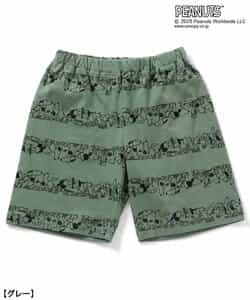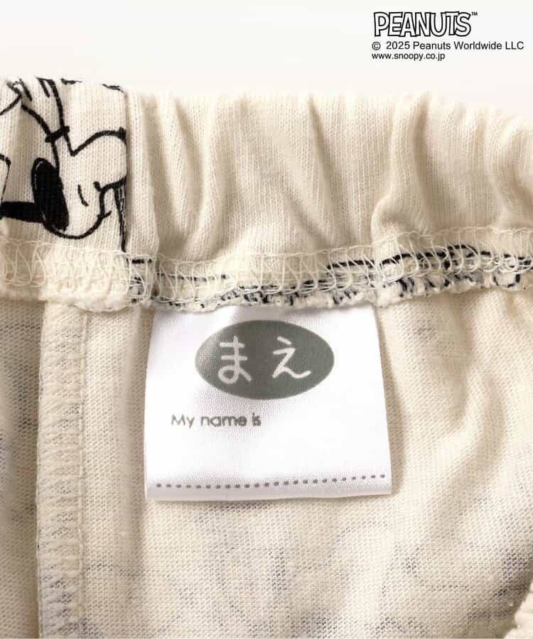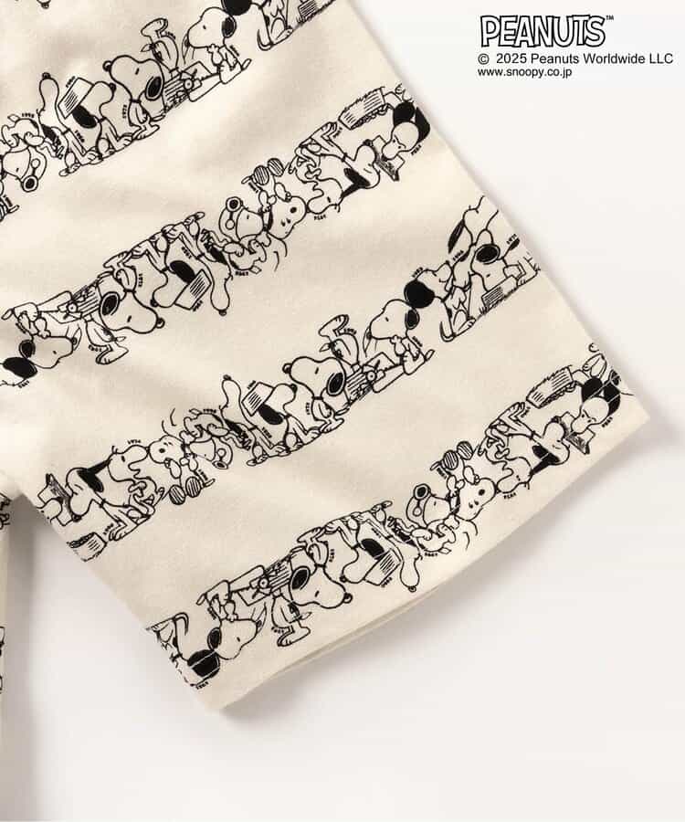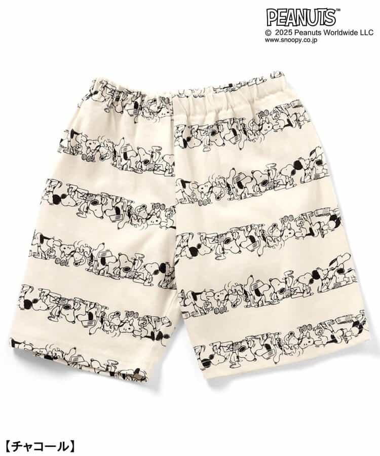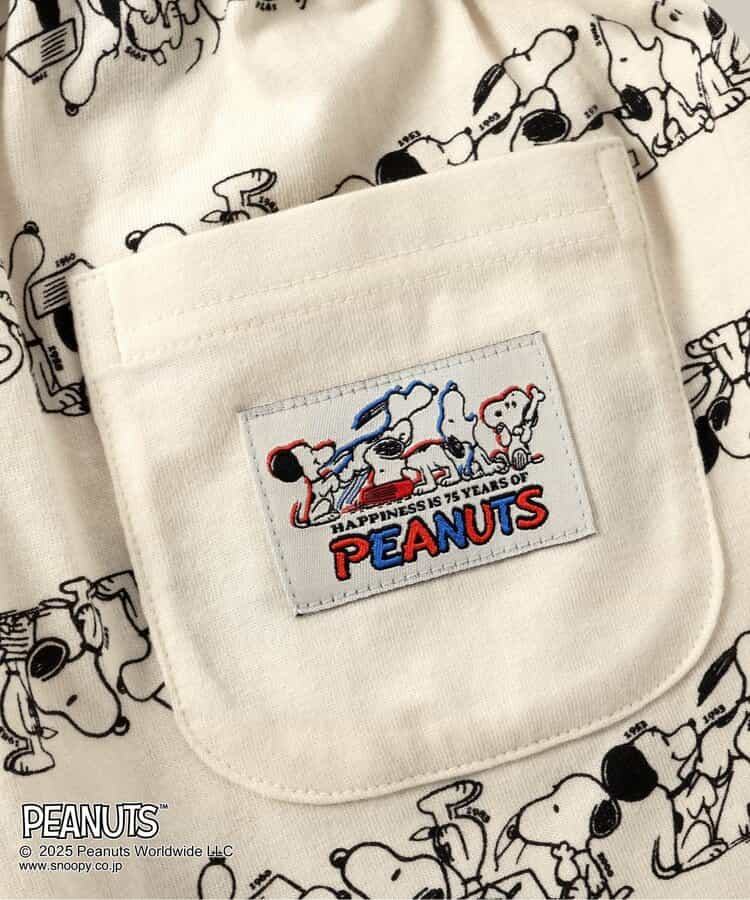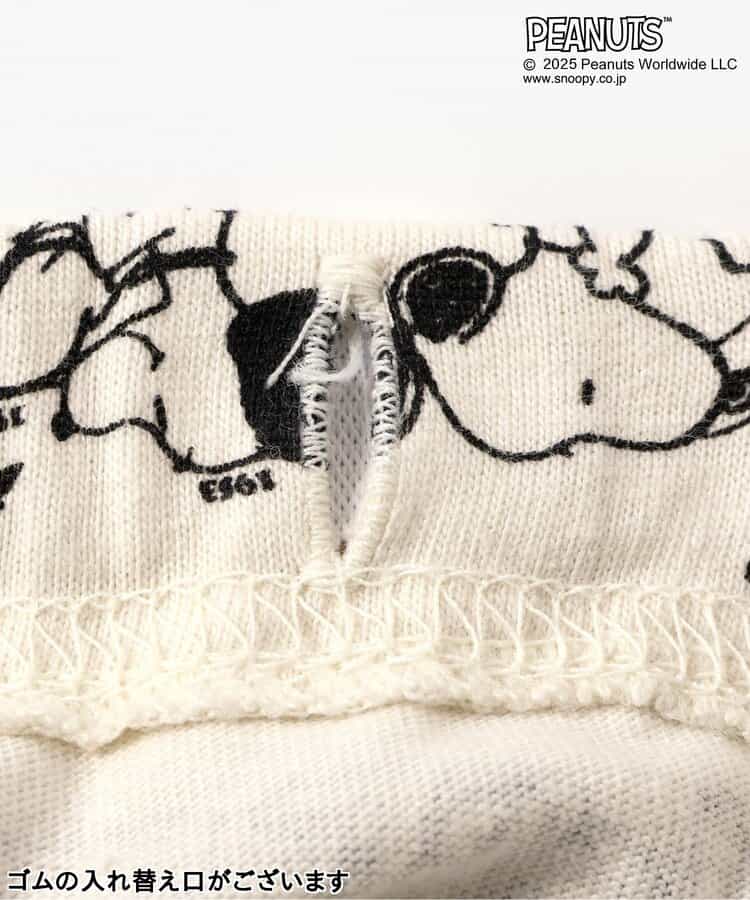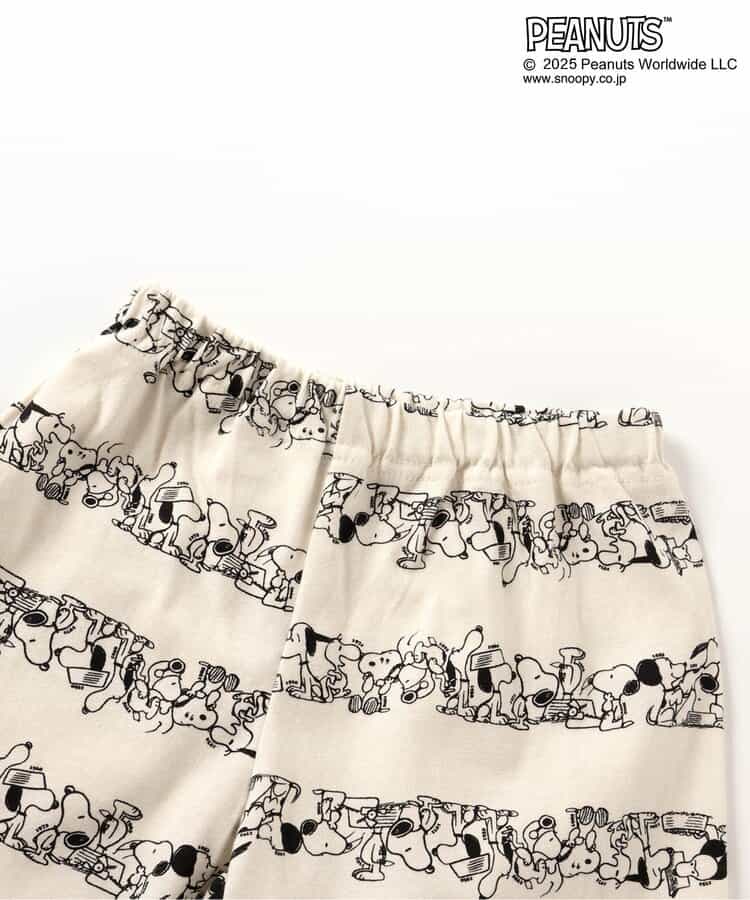 パンツにはスヌーピーが大集合したボーダー柄をあしらったデザインで、全体でPEANUTSの世界観を楽しめる1着◎