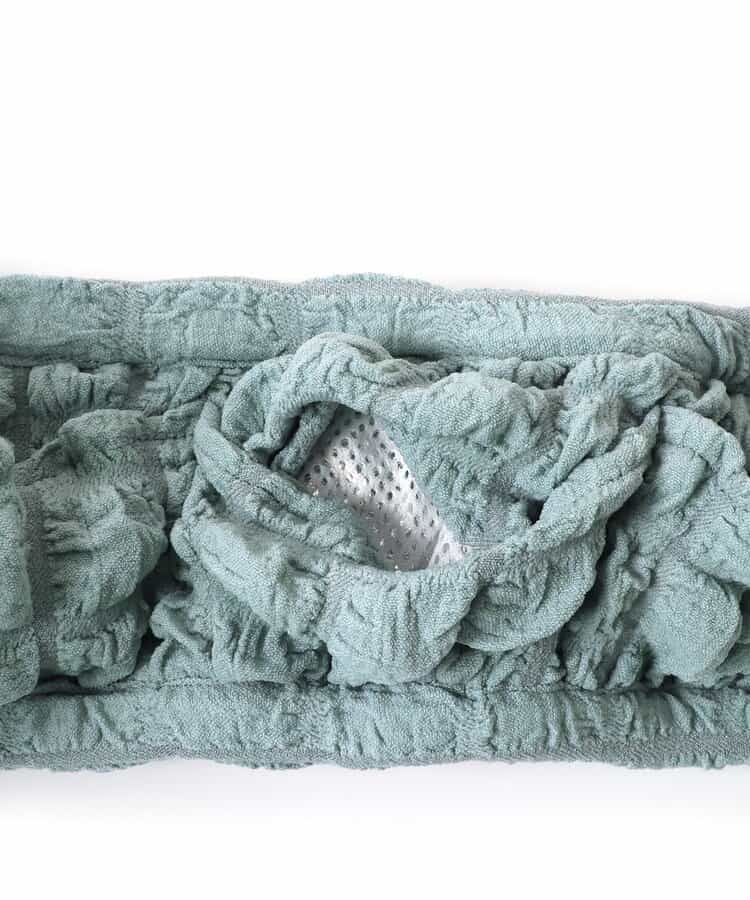 40℃を上限に洗濯機で洗濯、デリケートアイテムモード、ネット使用、漂白剤禁止、色物は同系の色と一緒に、洗濯後直ちに取出し、タンブル乾燥不可、日陰で吊り干し、アイロン禁止、商業ドライクリーニング不可