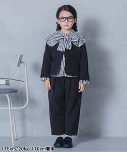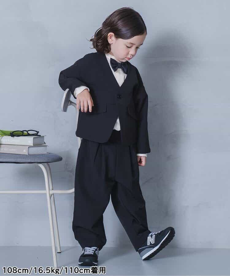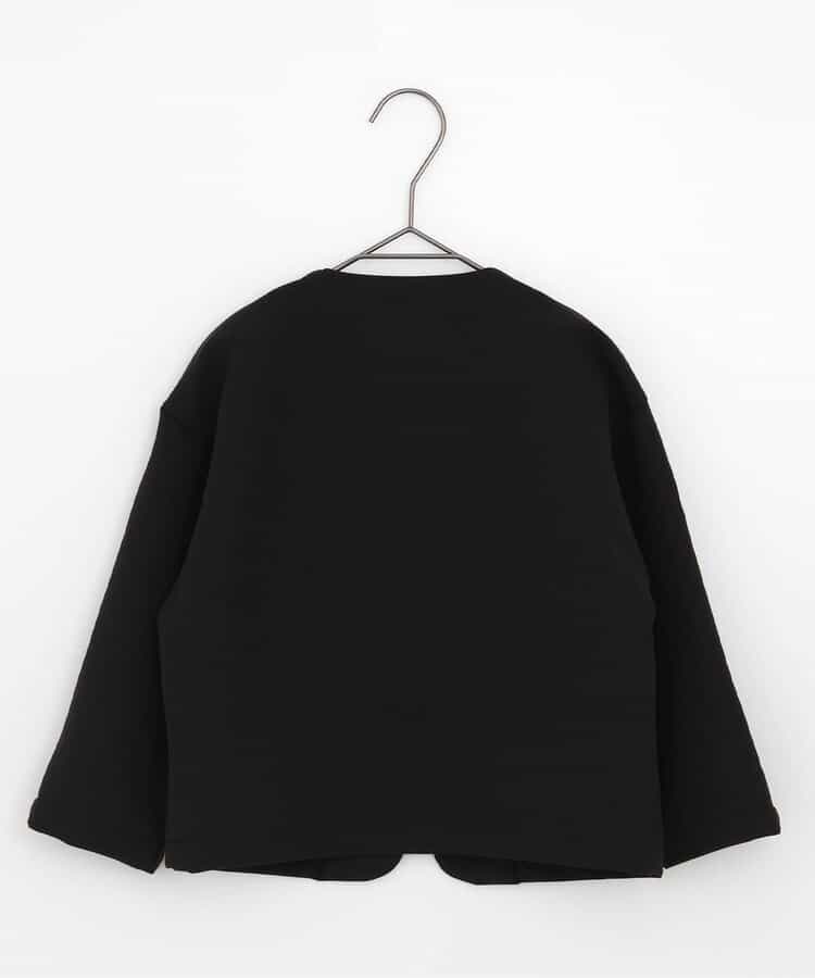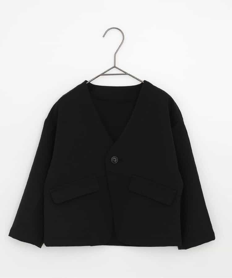 セレモニーにぴったりのフォーマルスーツジャケット。ノーカラーですっきりしたデザインが固くならずにおしゃれ。シンプルだけど切替位置がさりげなく個性的でセンス良く見せられます。ストレッチ素材なので固い服が苦手な子もストレスなく着られます。入園入学・卒園卒業・結婚式や発表会などさまざまなシーンで活躍します。同じデザインのタックボリュームパンツとセットで着るのがおすすめ。