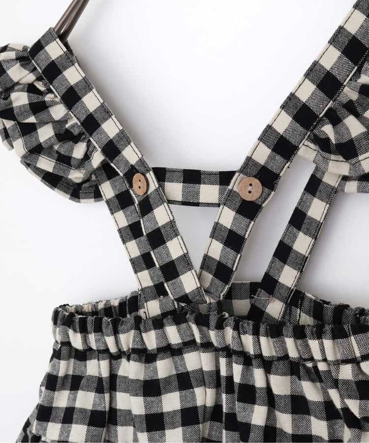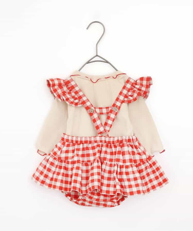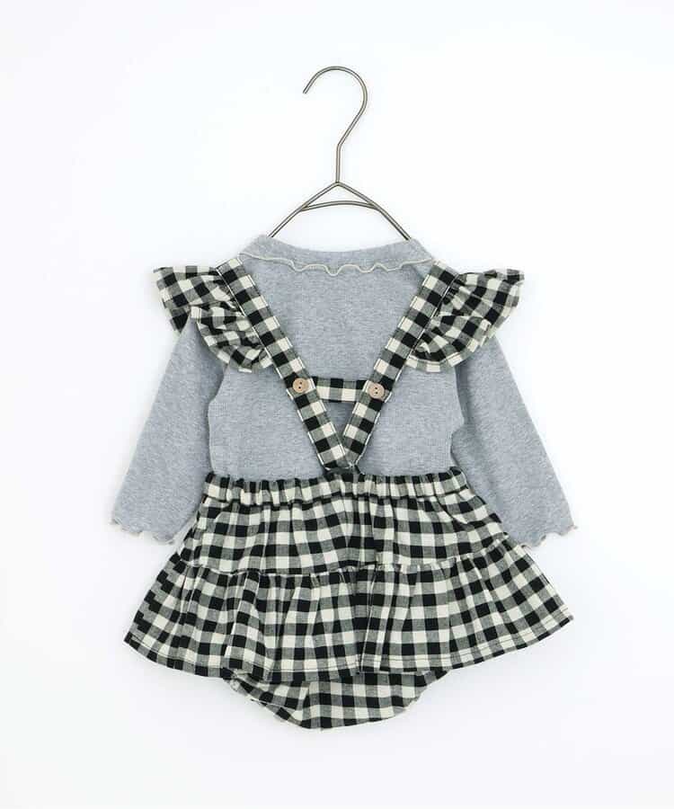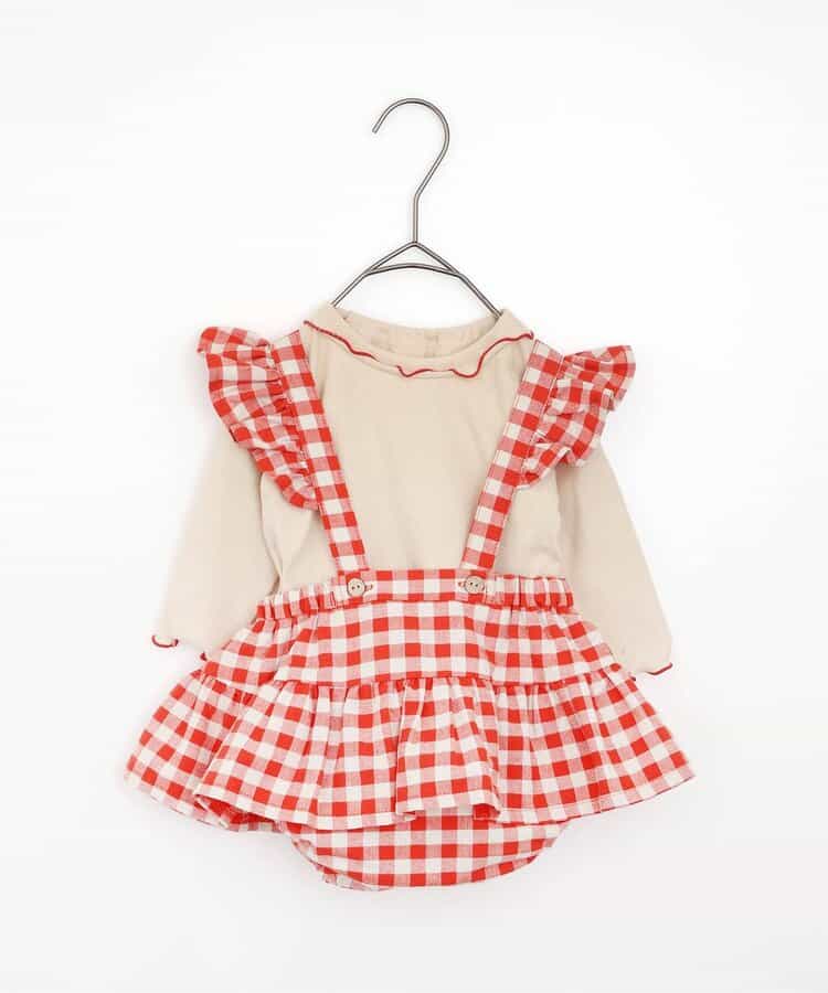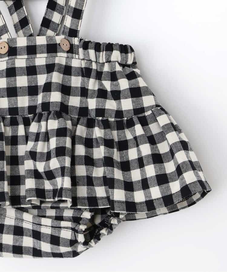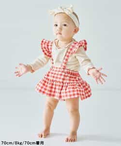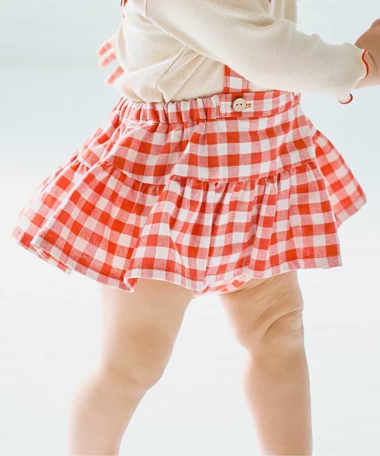 チェックのスカートブルマとメロウロンパスのセット。ブルマのサスペンダーは取り外しOKで長さ調節も可能。ロンパースの襟はゴムで着脱しやすくなっています。ロンパスとブルマはそれぞれ単品使いもできるのがうれしいポイント。、コーディネートに迷わないセットで、普段着にもベビーギフトにもおすすめです。同じデザインのキッズアイテムやベビーのオーバーオールとリンクコーデも楽しめます。<お取り扱いのご注意>この商品はカジュアルで、素朴な外観を強調する為、敢えて、紡織糸の太さが途中所々違う糸を使用しています。これは糸の特徴であり多少のネップ等は、自然な風合いを表現しています。他の製品では味わえない雰囲気をお楽しみ下さい。