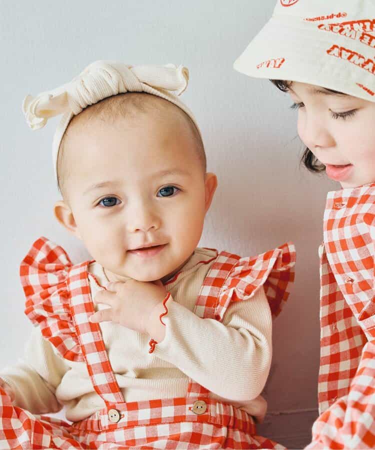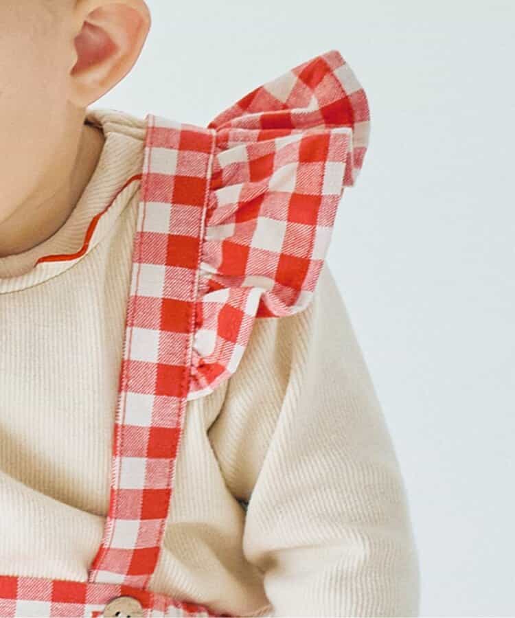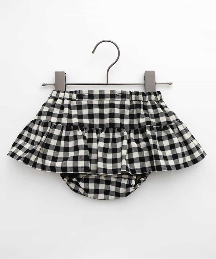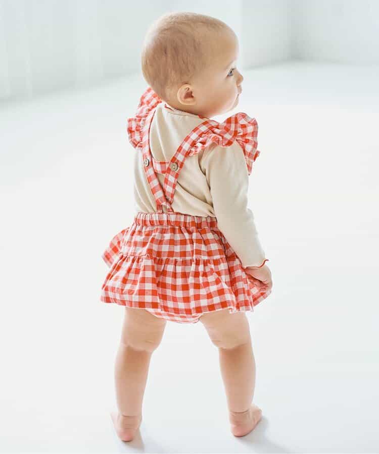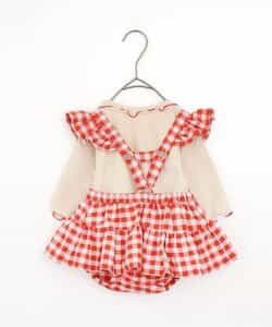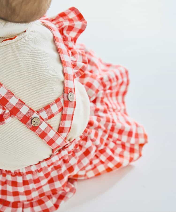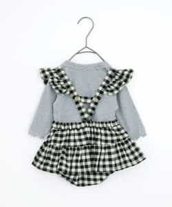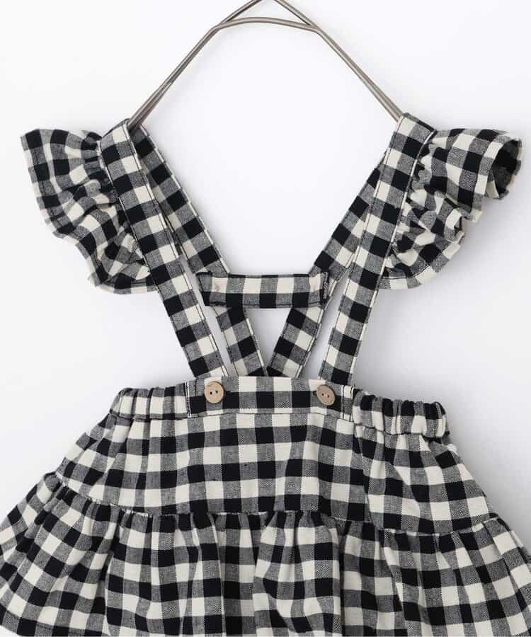 チェックのスカートブルマとメロウロンパスのセット。ブルマのサスペンダーは取り外しOKで長さ調節も可能。ロンパースの襟はゴムで着脱しやすくなっています。ロンパスとブルマはそれぞれ単品使いもできるのがうれしいポイント。、コーディネートに迷わないセットで、普段着にもベビーギフトにもおすすめです。同じデザインのキッズアイテムやベビーのオーバーオールとリンクコーデも楽しめます。<お取り扱いのご注意>この商品はカジュアルで、素朴な外観を強調する為、敢えて、紡織糸の太さが途中所々違う糸を使用しています。これは糸の特徴であり多少のネップ等は、自然な風合いを表現しています。他の製品では味わえない雰囲気をお楽しみ下さい。