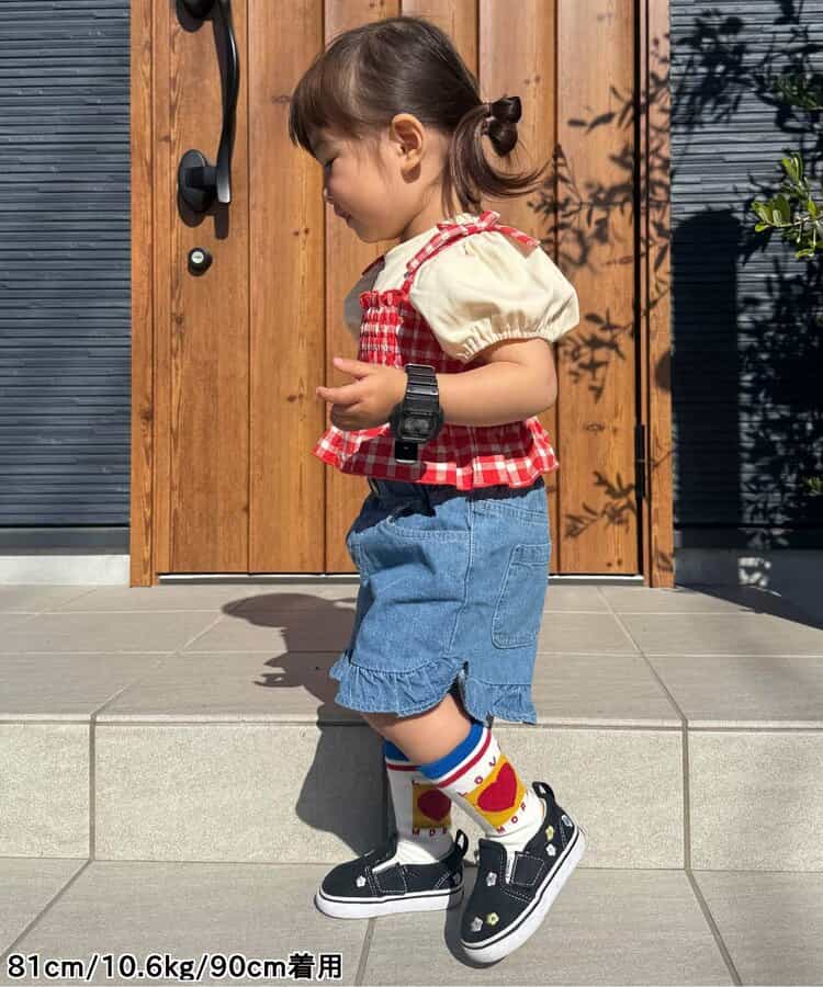 身長75cmの娘に90cmを購入しました。 意外とちょうど良く着れたので、長く着れそうでよかったです。 春は長袖に合わせても可愛いので、今からでも着れそうで嬉しいです。 ひらひらとギンガムチェックがすごく可愛いです!
