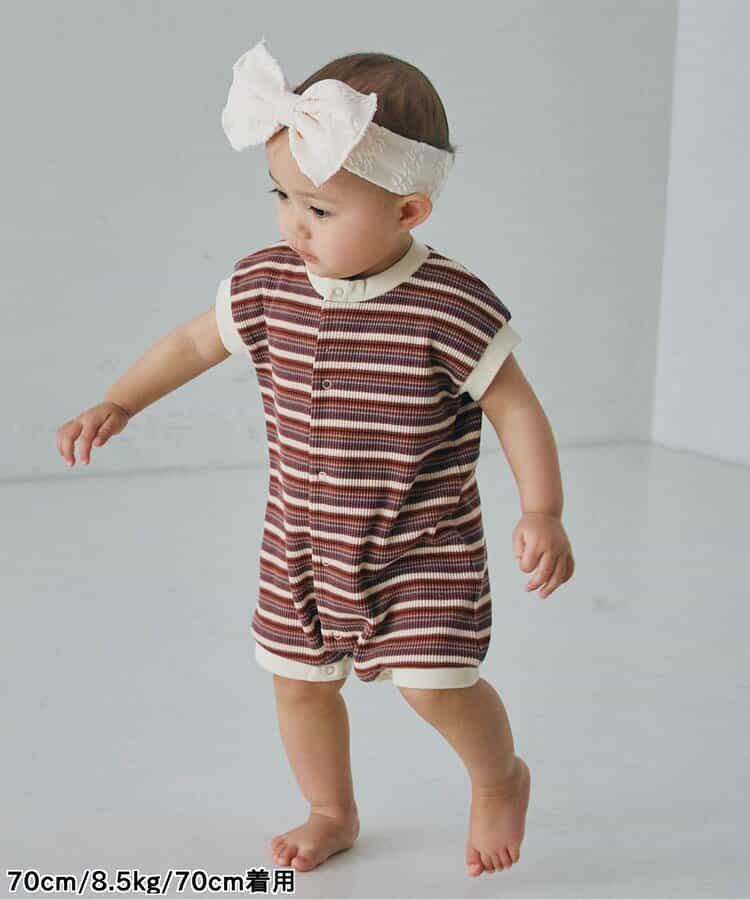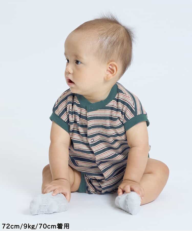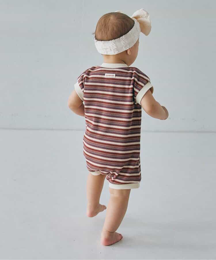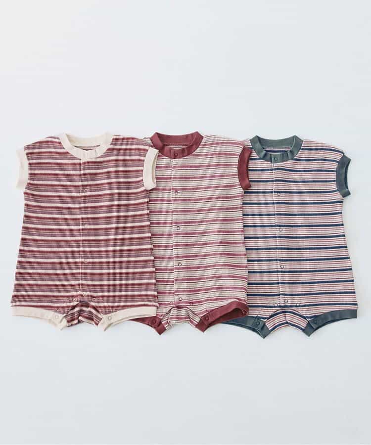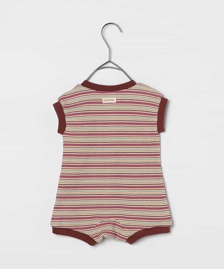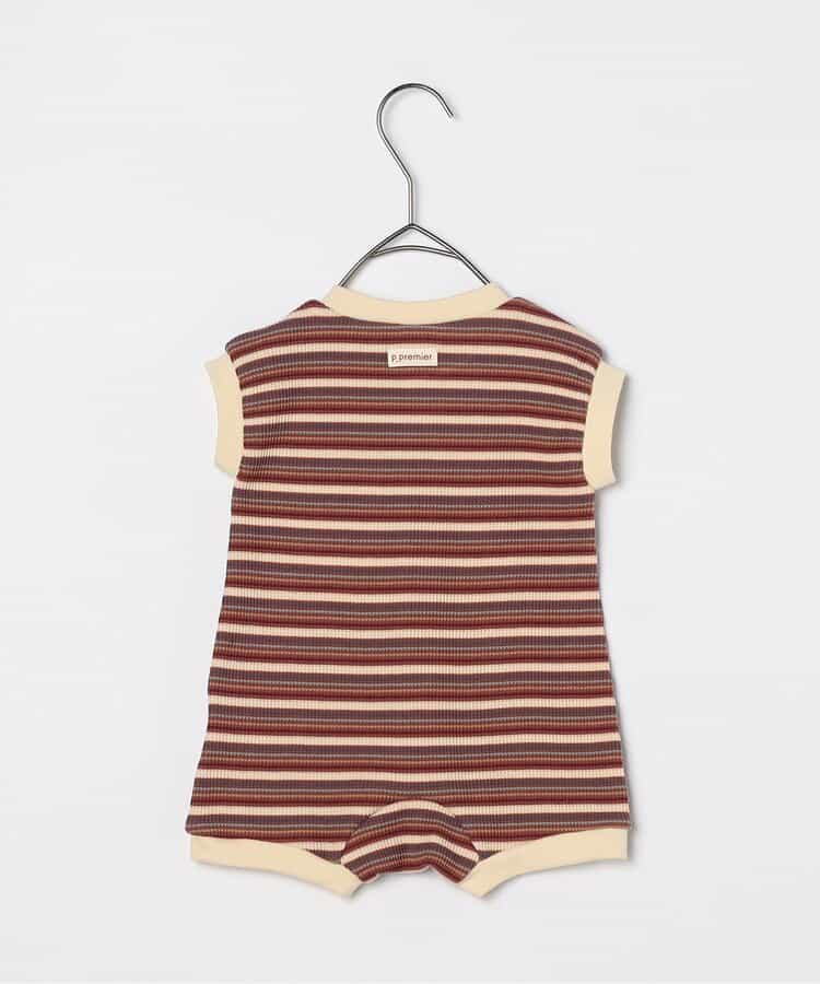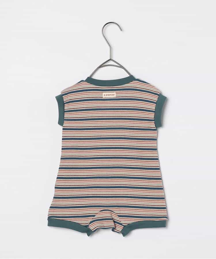 p.premierらしい配色がキュートなマルチボーダーシリーズ。肩が隠れる袖丈のノースリーブの前開きロンパースです。生地は綿・ストレッチの薄手のボーダーワッフル素材。ワッフル生地ですが薄手なので夏まで着られます。同じデザインのキッズのノースリーブトップス・ハーフパンツ・フレアパンツもご用意しているので、セットアップとして着たり、きょうだいでリンクコーデも楽しめます。※こちらの商品は返品不可商品です。