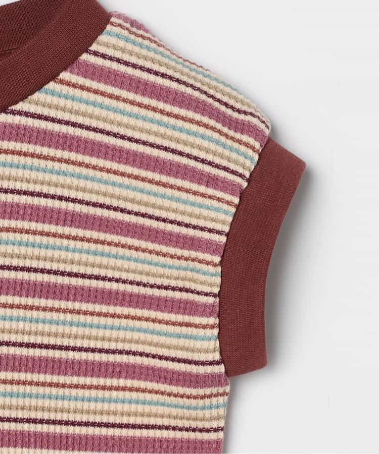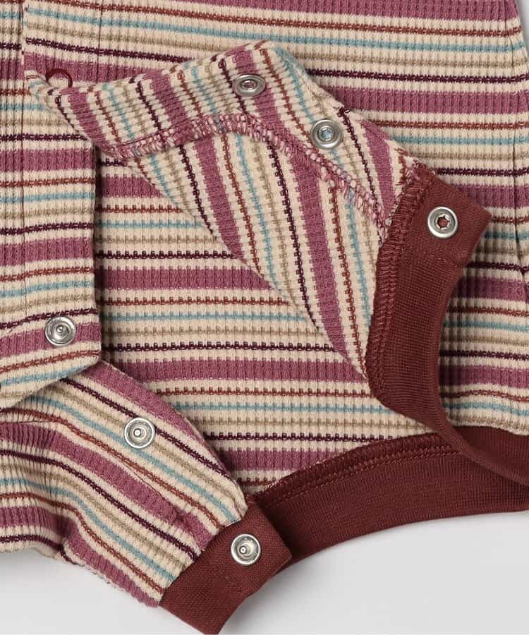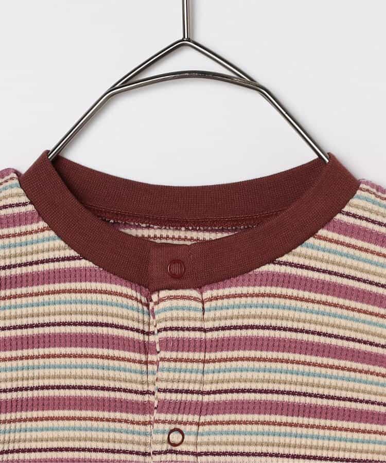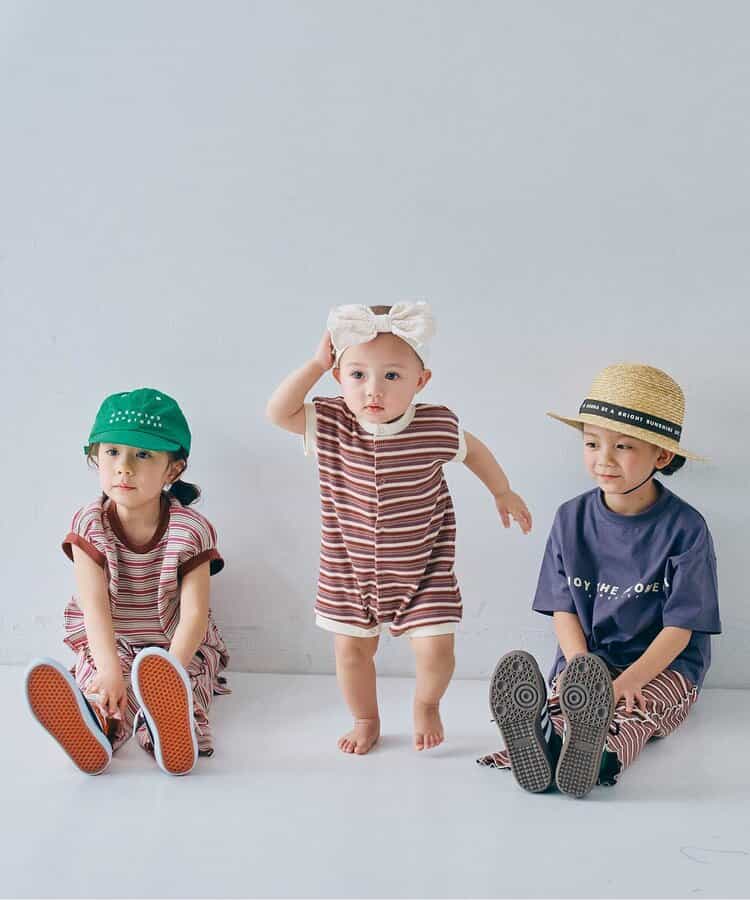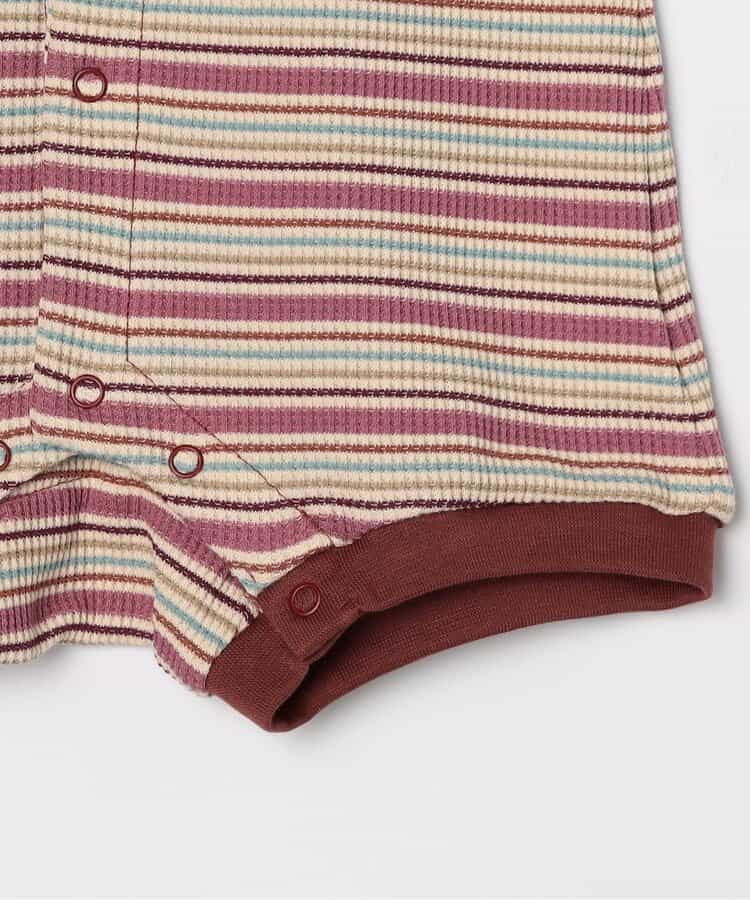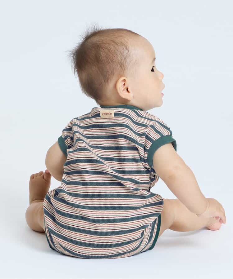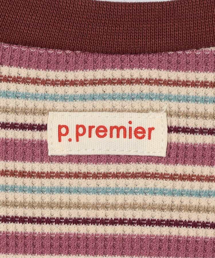 p.premierらしい配色がキュートなマルチボーダーシリーズ。肩が隠れる袖丈のノースリーブの前開きロンパースです。生地は綿・ストレッチの薄手のボーダーワッフル素材。ワッフル生地ですが薄手なので夏まで着られます。同じデザインのキッズのノースリーブトップス・ハーフパンツ・フレアパンツもご用意しているので、セットアップとして着たり、きょうだいでリンクコーデも楽しめます。※こちらの商品は返品不可商品です。