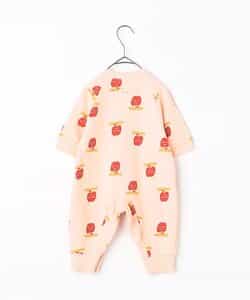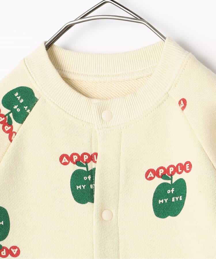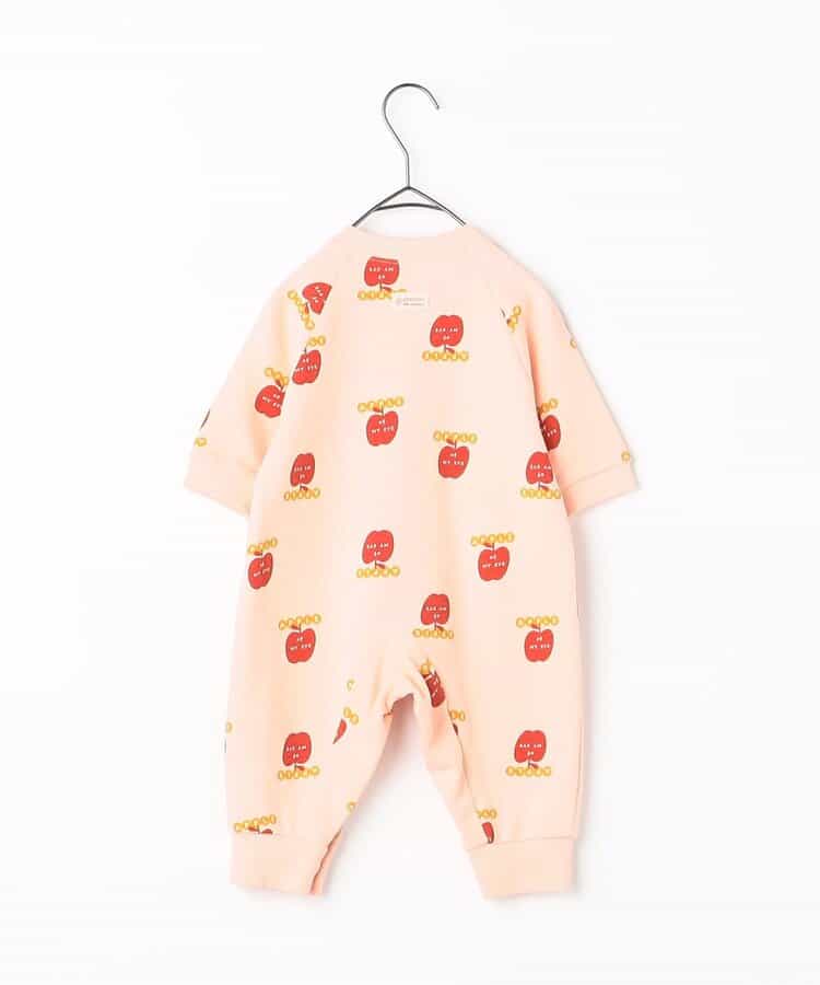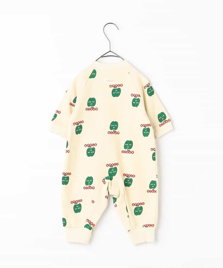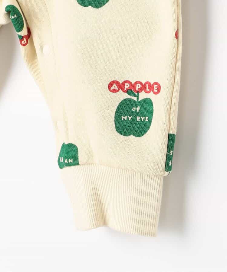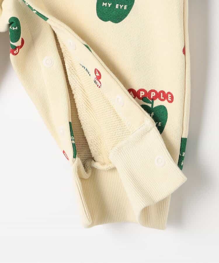 ちょっぴり古着っぽさも感じられる、リンゴとロゴの総柄がカラフルでかわいい綿100%のトレーナーカバーオール。リンゴ柄には「目に入れてもいたくない」というメッセージが込められいます。着用時に足が寒くないように、昨年のデザインより2cmほどパンツ部分を長めにしています。前あきのボタンは付け外ししやすいプラスチックスナップを採用。キッズのトレーナーとリンクコーデもたのしめます。【おすすめのリンクアイテム】イロチ買いしたい総柄トレーナー>>