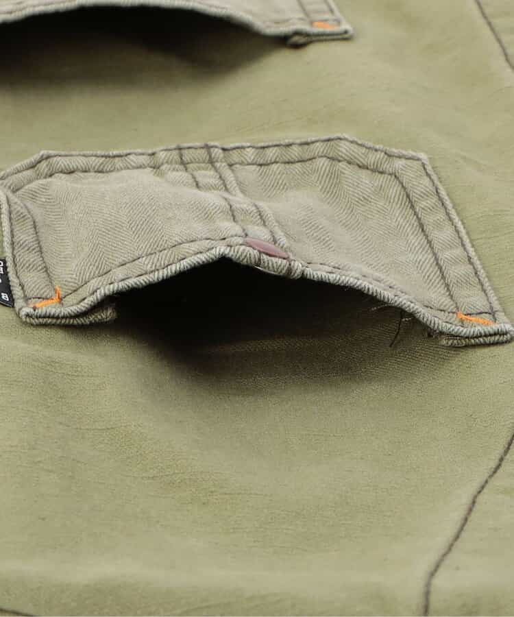 この商品はユーズド感を出す為、製品洗い・製品染め・ブリーチ(脱色)・生地切れ・糸切れ等の2次加工を施しております。