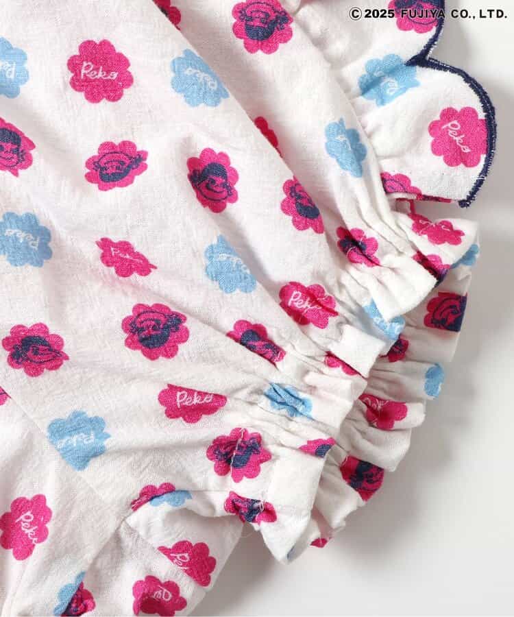 まるでミルキーの包み紙のようなサイドのスカラップ風のフリルが、赤ちゃんらしいやわらかなシルエットを引き立ててくれます。