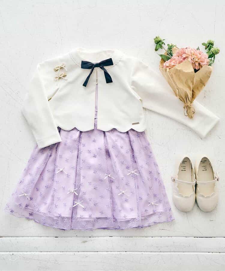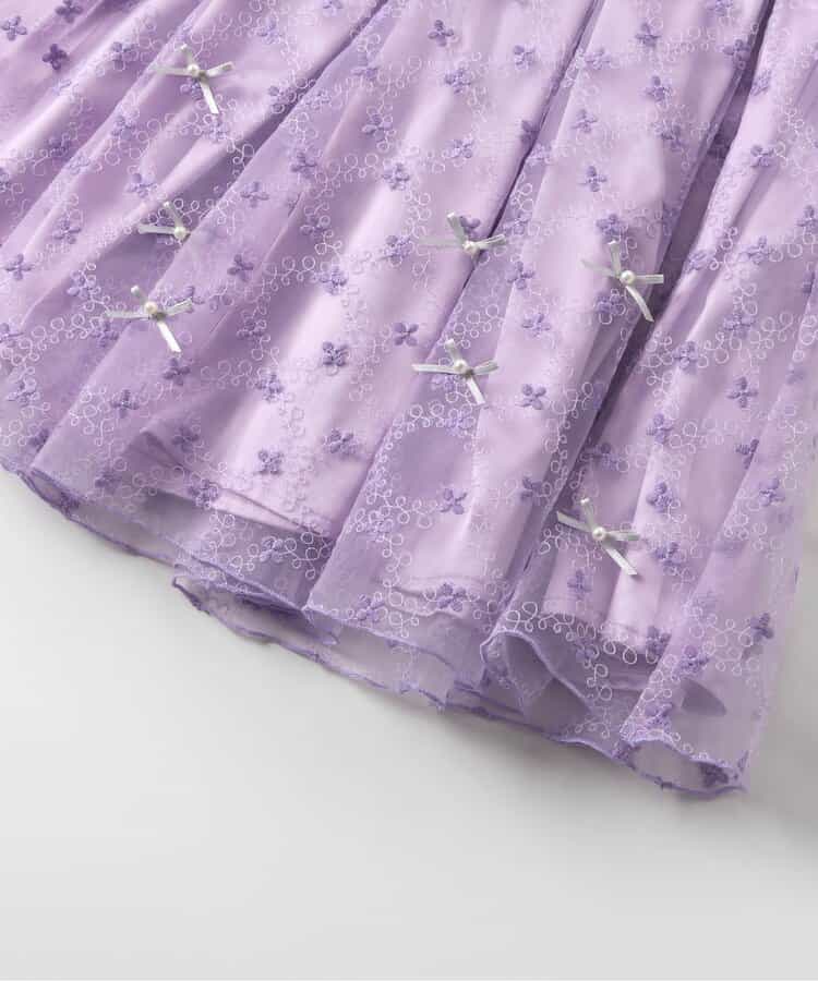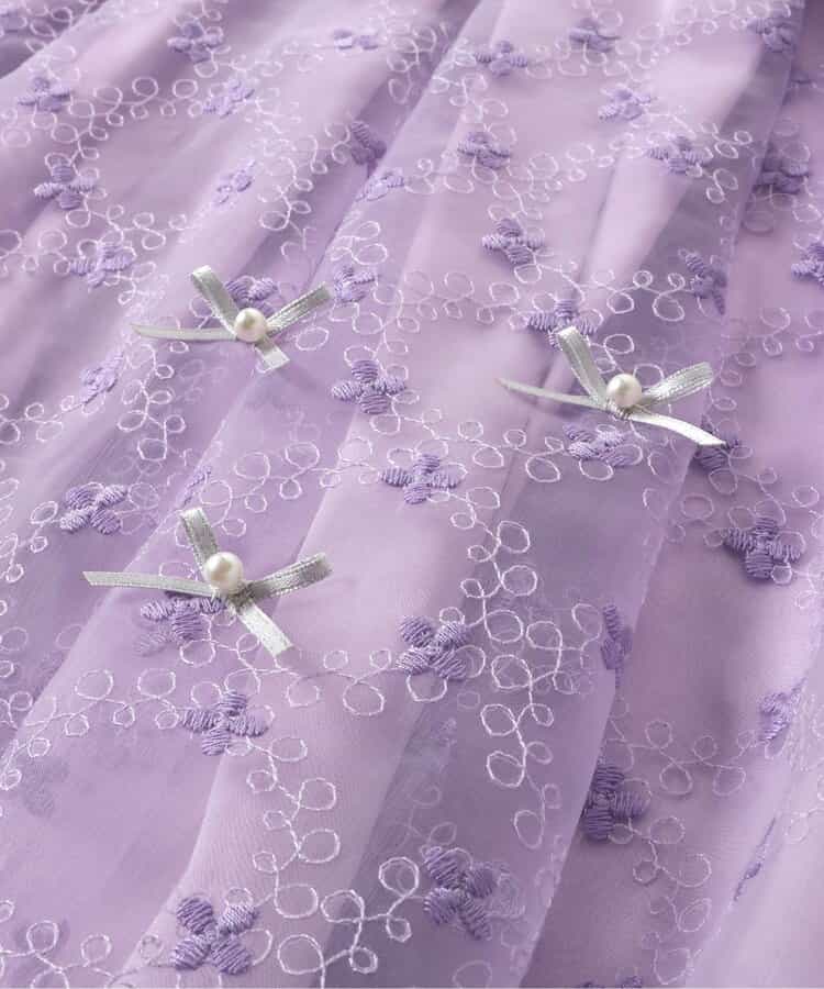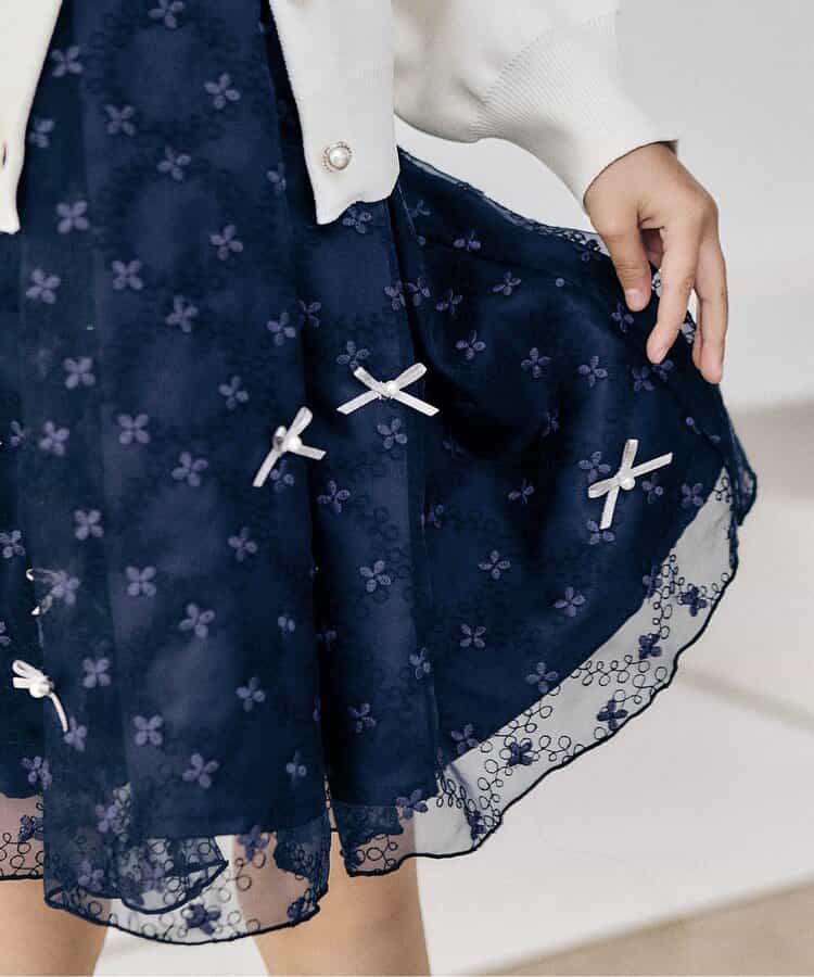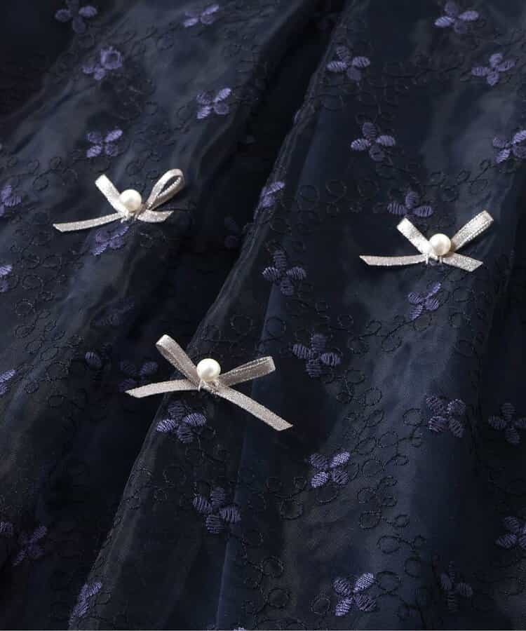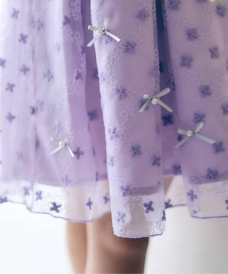シンプルな無地のトップス部分に、お花の刺繍とリボンがかわいいチュールスカートが乙女心をくすぐります。