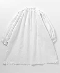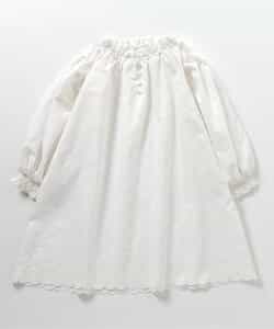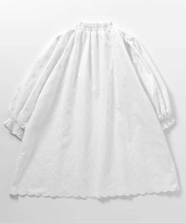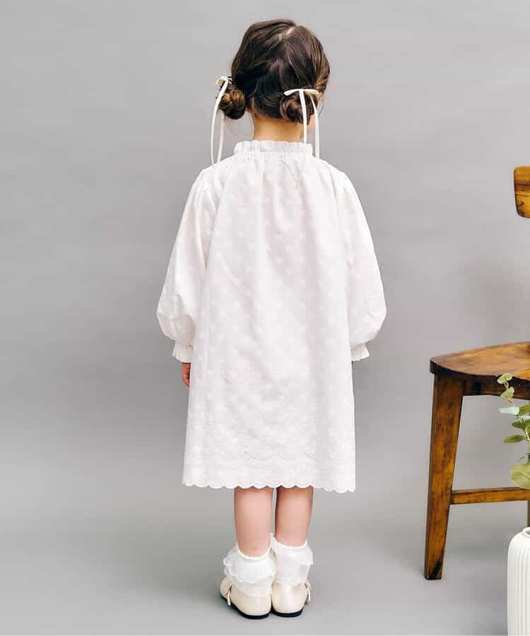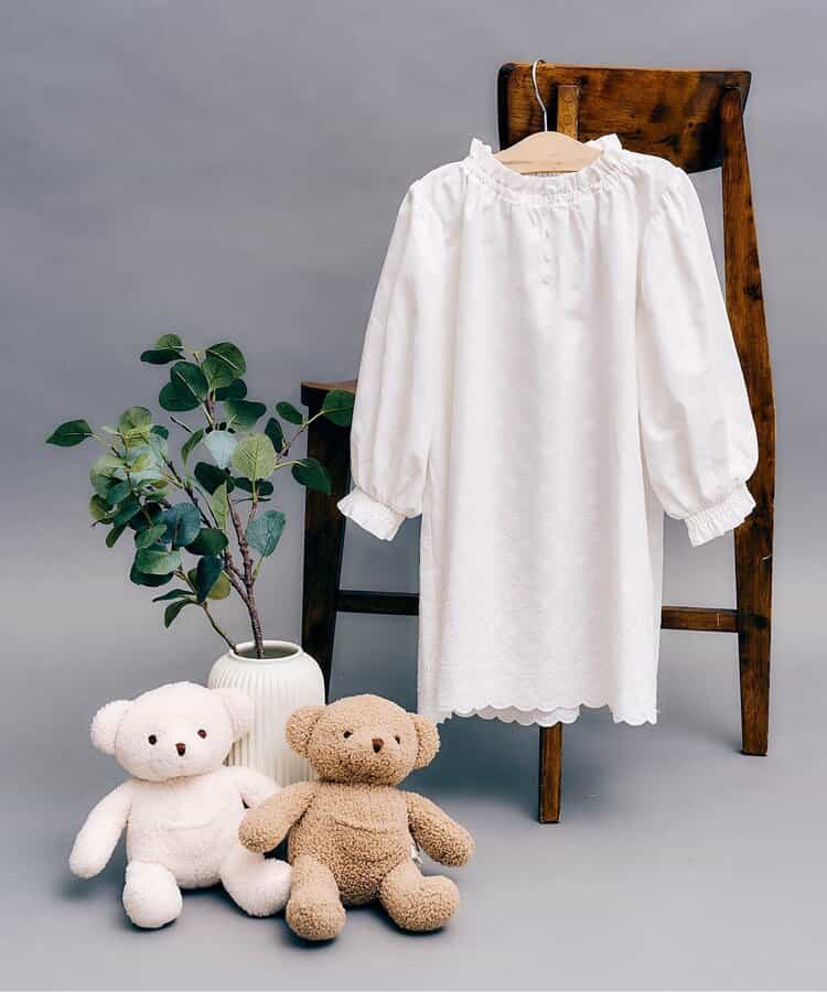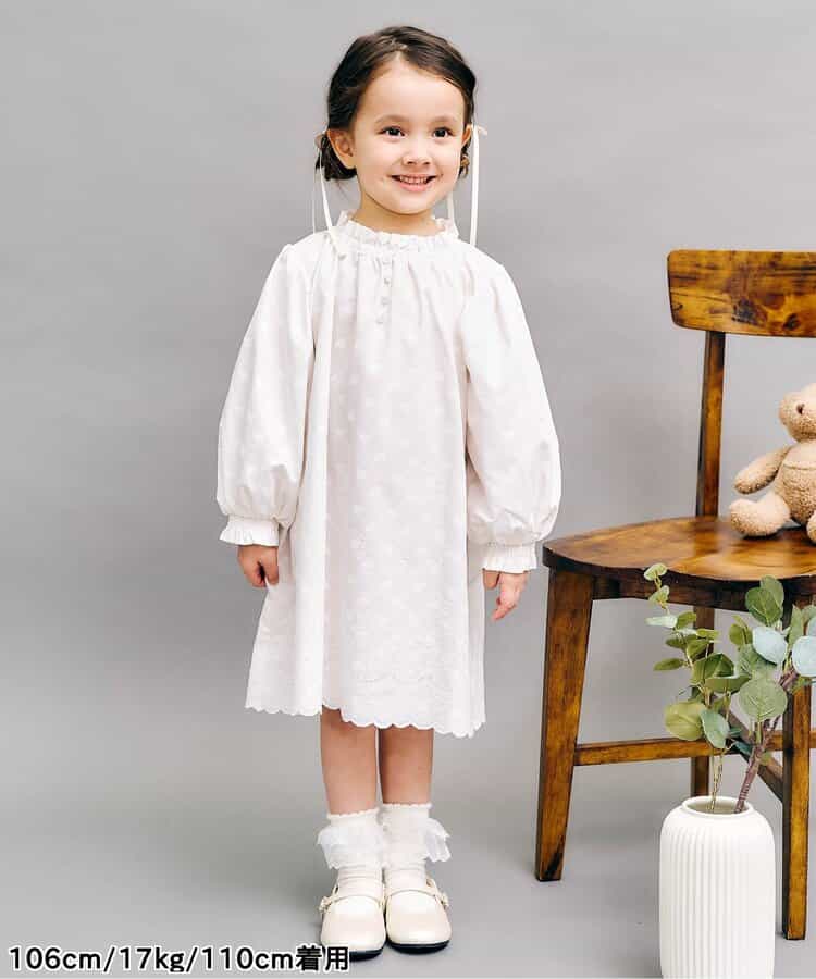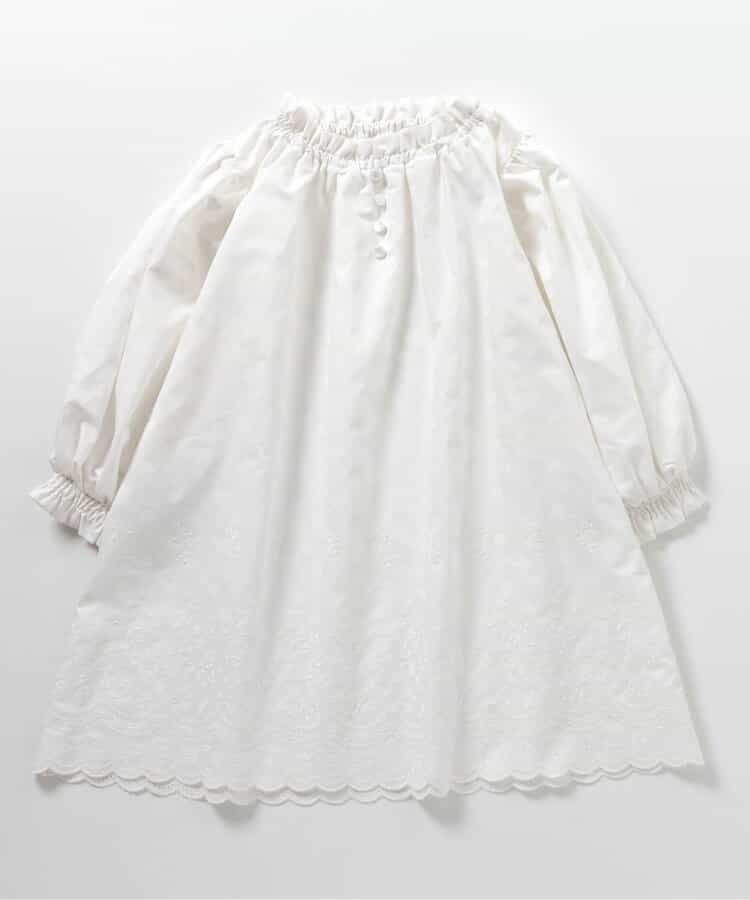 1枚でキュートな真っ白なワンピースが登場*クマさん柄の刺繍とふんわりとした袖のシルエットがかわいい♪裾のスカラップや、襟元と袖口はギャザーでフリルになっていてガーリーな雰囲気を演出してくれます*