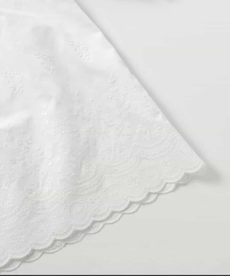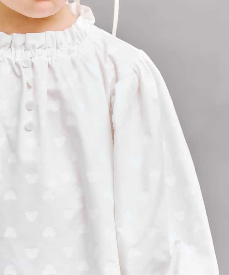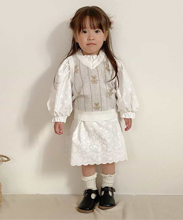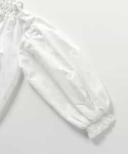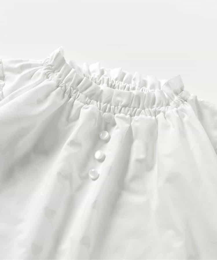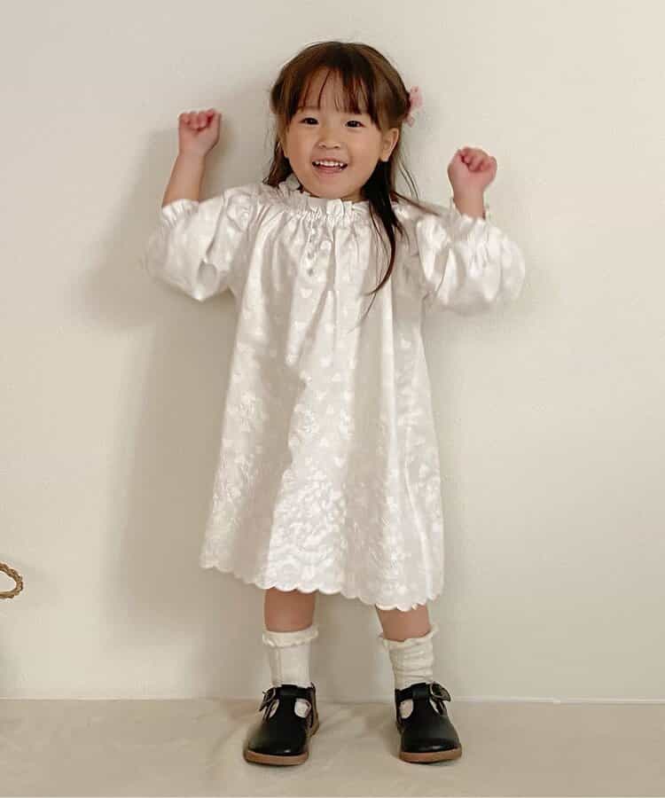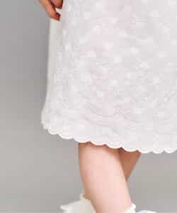 1枚でキュートな真っ白なワンピースが登場*クマさん柄の刺繍とふんわりとした袖のシルエットがかわいい♪裾のスカラップや、襟元と袖口はギャザーでフリルになっていてガーリーな雰囲気を演出してくれます*