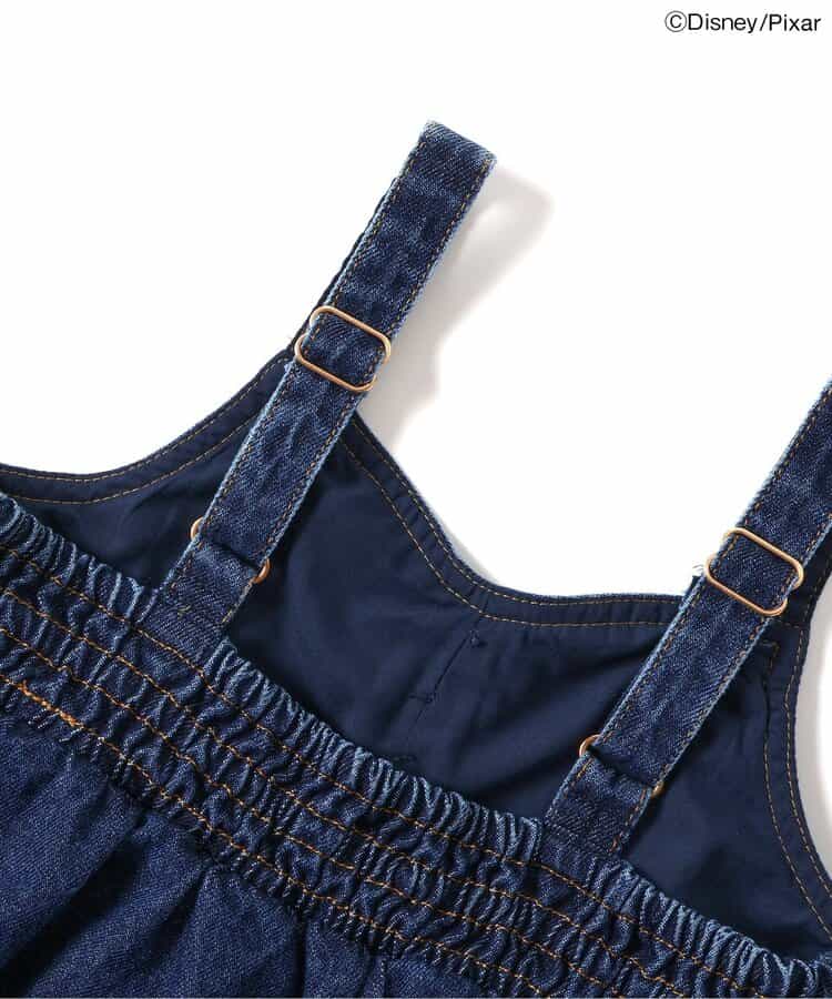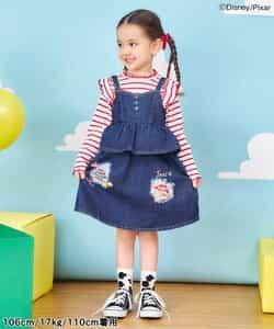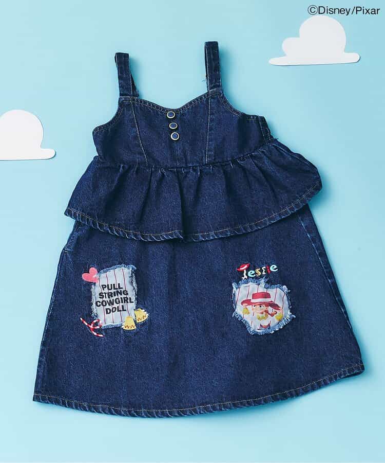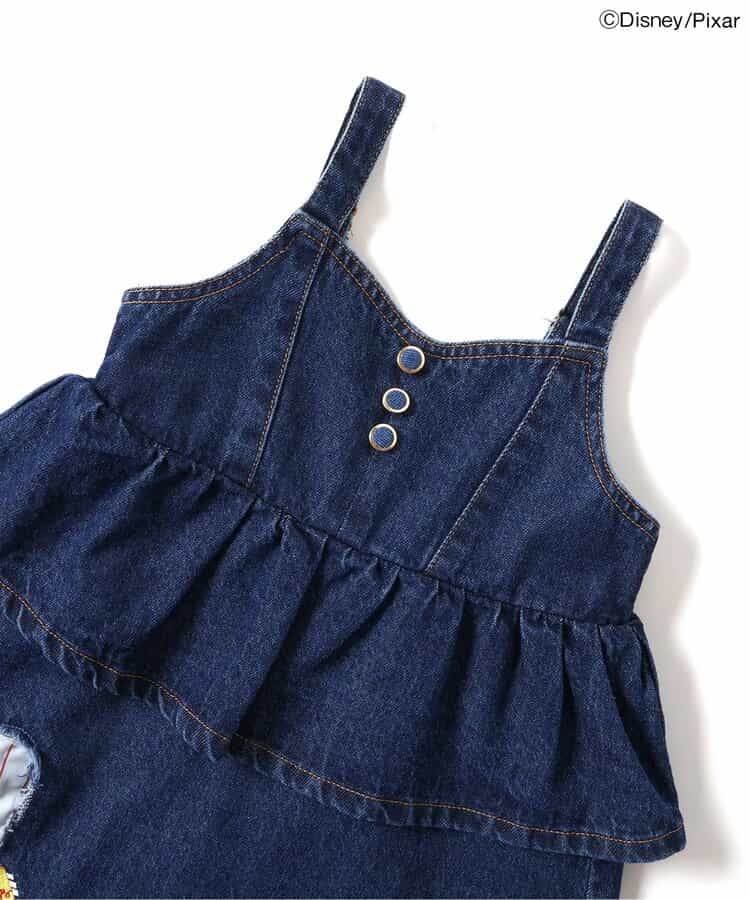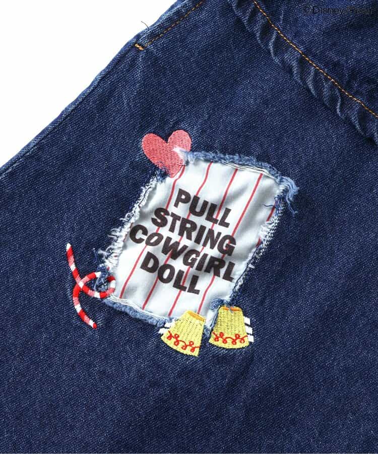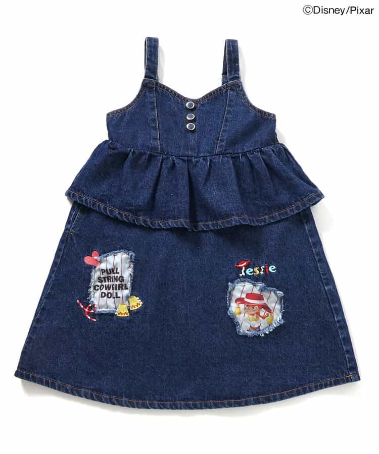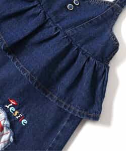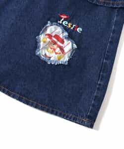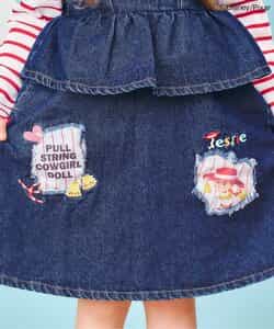 ジェシーモチーフのデニム生地のジャンパースカートは、ポップでカジュアルながらもギャザーがたっぷりなシルエットでガーリーな印象に♪古着風のダメージ加工からのぞくジェシーや、かわいいモチーフの刺繍がポイント!ショルダーは調節可能、左右ポケット付きで機能性も◎バックはゴムになっているので、お着替えもしやすいのもうれしいポイントです。インナーを変えればシーズン関係なく着ていただけます。おそろいのデニムパンツもあるので、お友達やきょうだいとリンクコーデもオススメ!