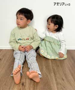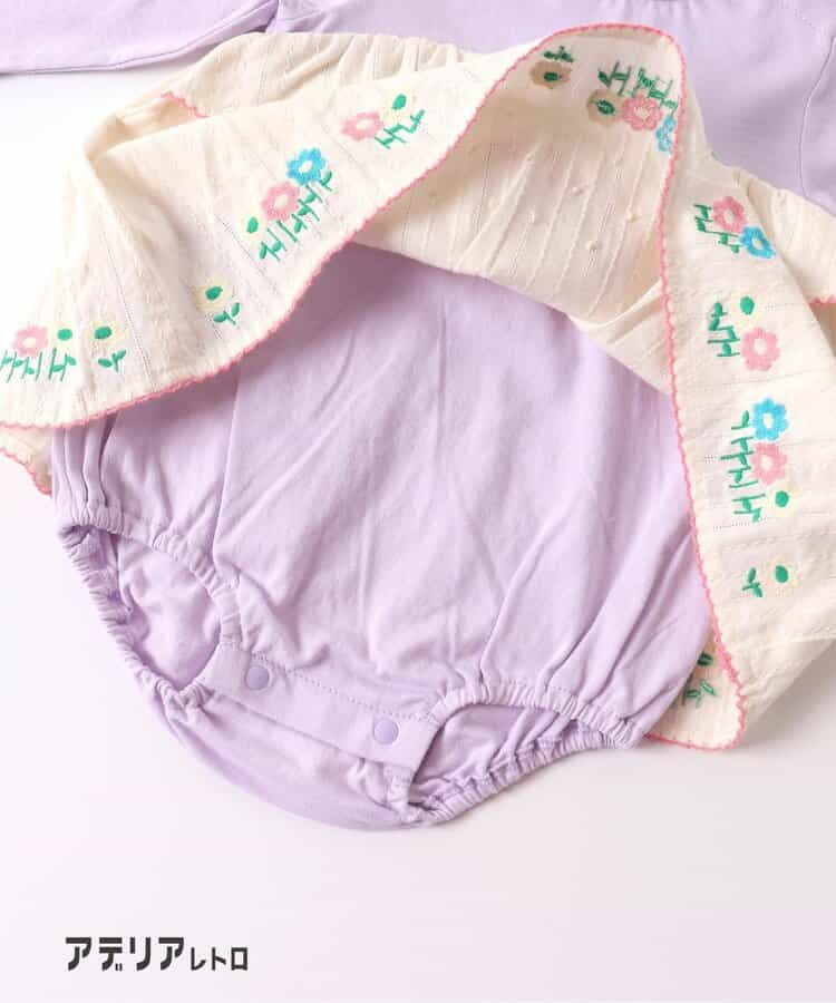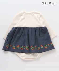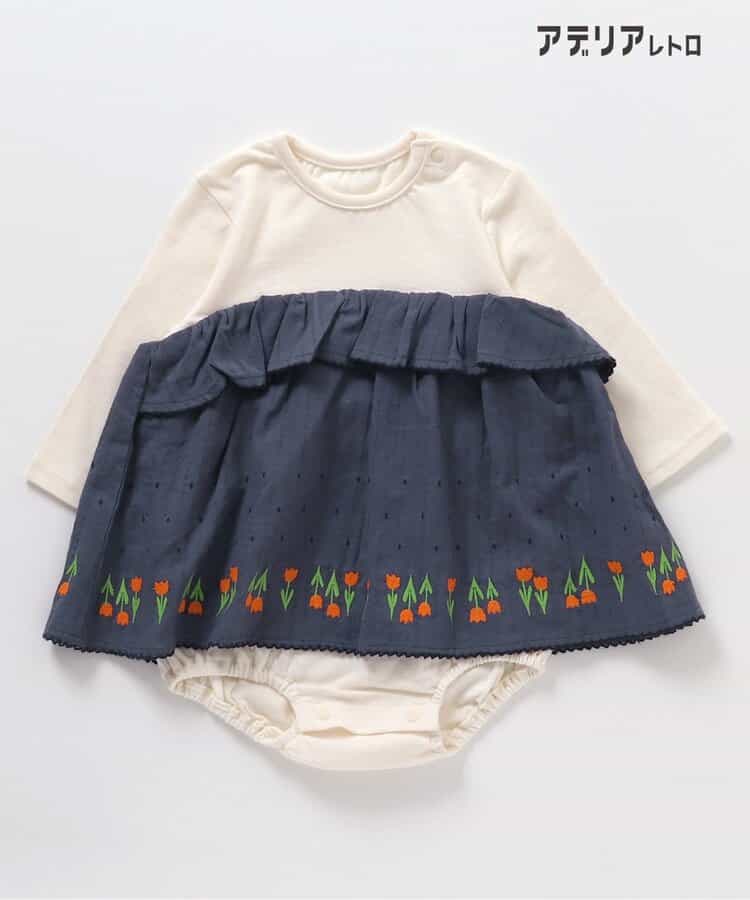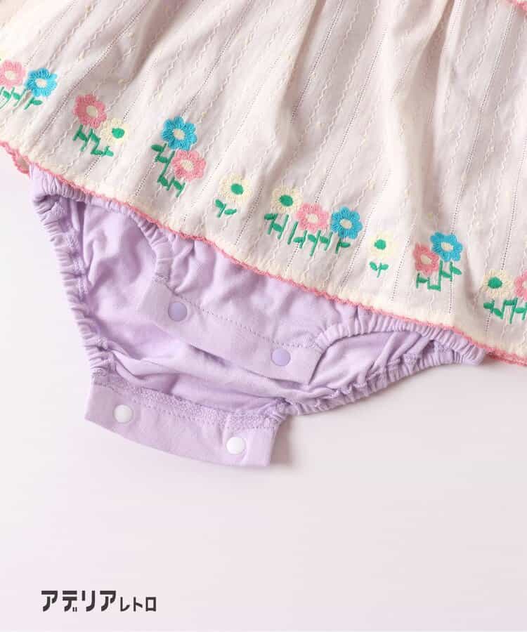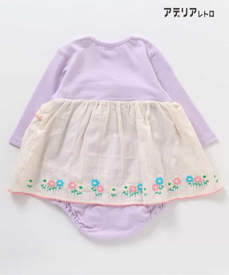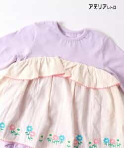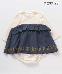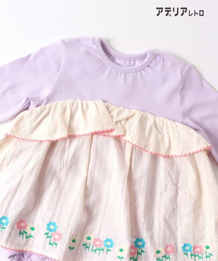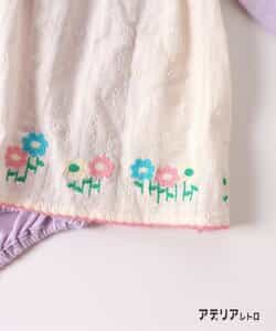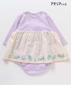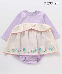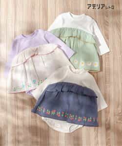 【アデリアレトロ×アプレレクール】なつかしくてあたらしい、大人気のアデリアレトロとアプレレクールのコラボレーションアイテムが登場♪前にフリルのついたボリュームのあるカバーオール。裾部分にはアデリアレトロで人気の花ざかり、ラプソディー、コレックがそれぞれ刺繍で表現されています。ストライプドビーという表面感のある上品な生地を使用し、裾には配色の刺繍まで!アプレレクールの「かわいい」を詰め込んだイチオシのアイテムです◎ お揃いのドッキングTシャツとぜひ合わせてチェックしてください。