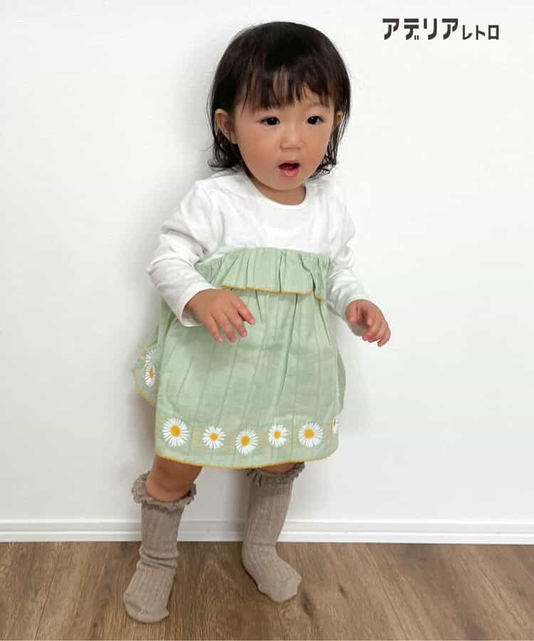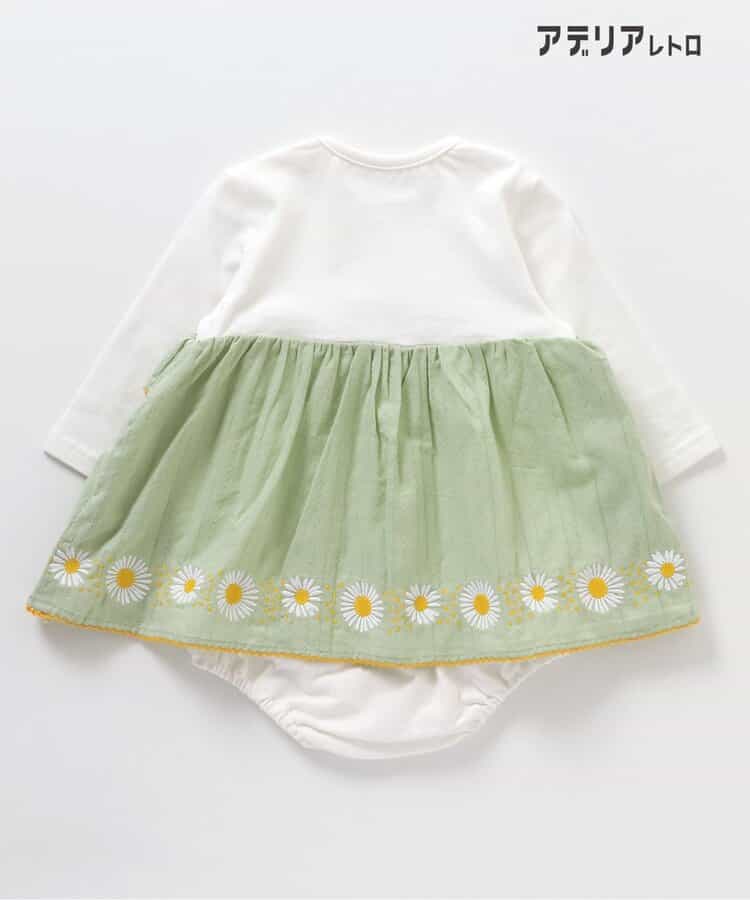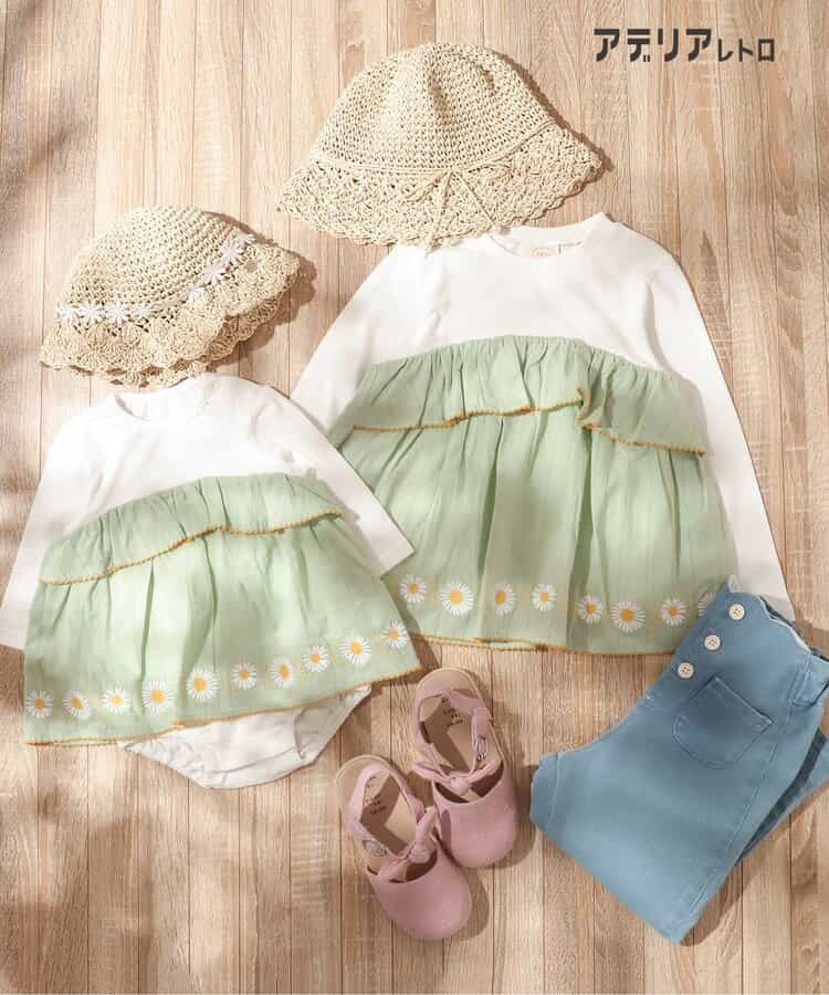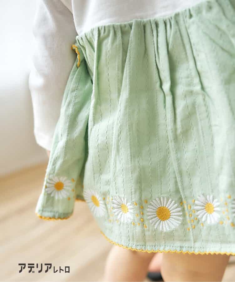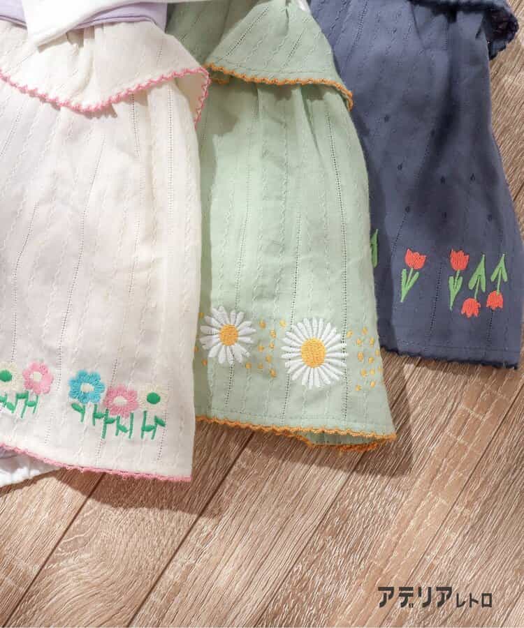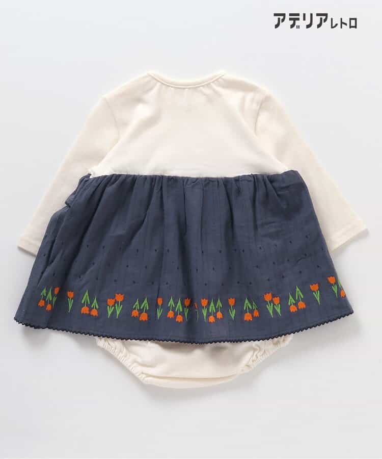 【アデリアレトロ×アプレレクール】なつかしくてあたらしい、大人気のアデリアレトロとアプレレクールのコラボレーションアイテムが登場♪前にフリルのついたボリュームのあるカバーオール。裾部分にはアデリアレトロで人気の花ざかり、ラプソディー、コレックがそれぞれ刺繍で表現されています。ストライプドビーという表面感のある上品な生地を使用し、裾には配色の刺繍まで!アプレレクールの「かわいい」を詰め込んだイチオシのアイテムです◎ お揃いのドッキングTシャツとぜひ合わせてチェックしてください。