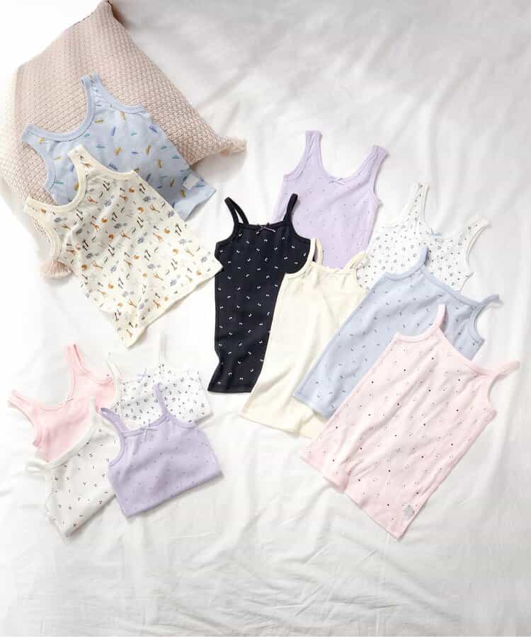 毎日着るものだからインナーだってもっとかわいく。apres les coursのインナーシリーズ*嬉しいプチプラ価格と綿100%でお肌にも優しく着心地もGOOD♪深あきデザインなので肌着が表に見えないのがうれしいポイントです◎何枚でも持っておきたいナチュラルな無地のデザインにハートやりぼん、お花柄が可愛い総柄の計5色展開。通園通学やちょっとしたお出かけにもおすすめです♪