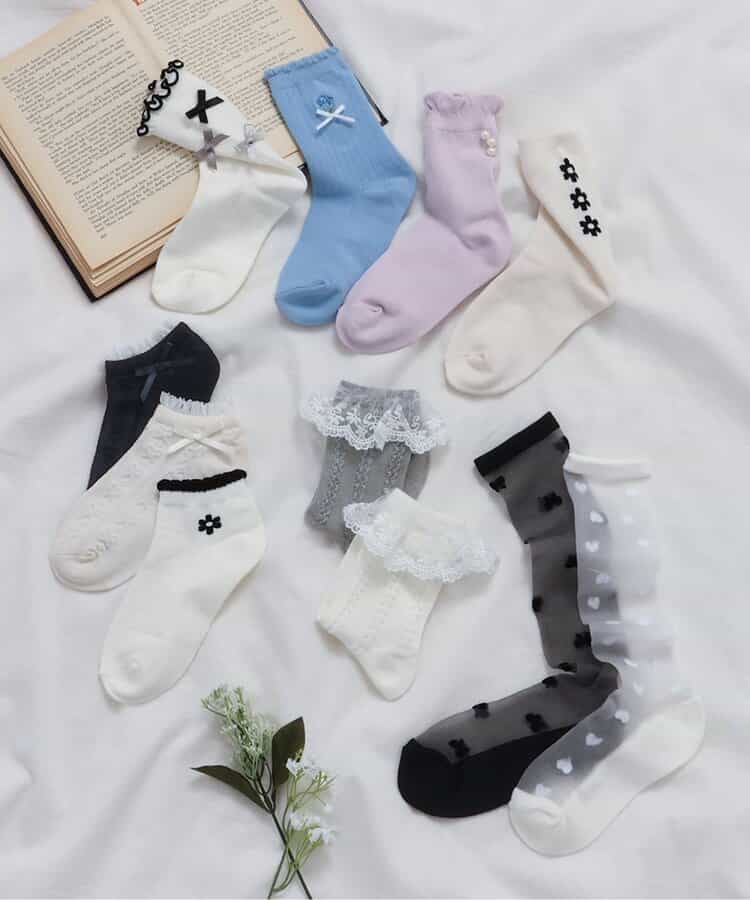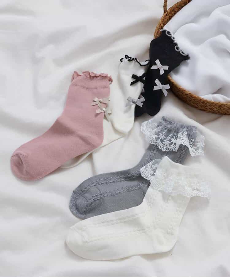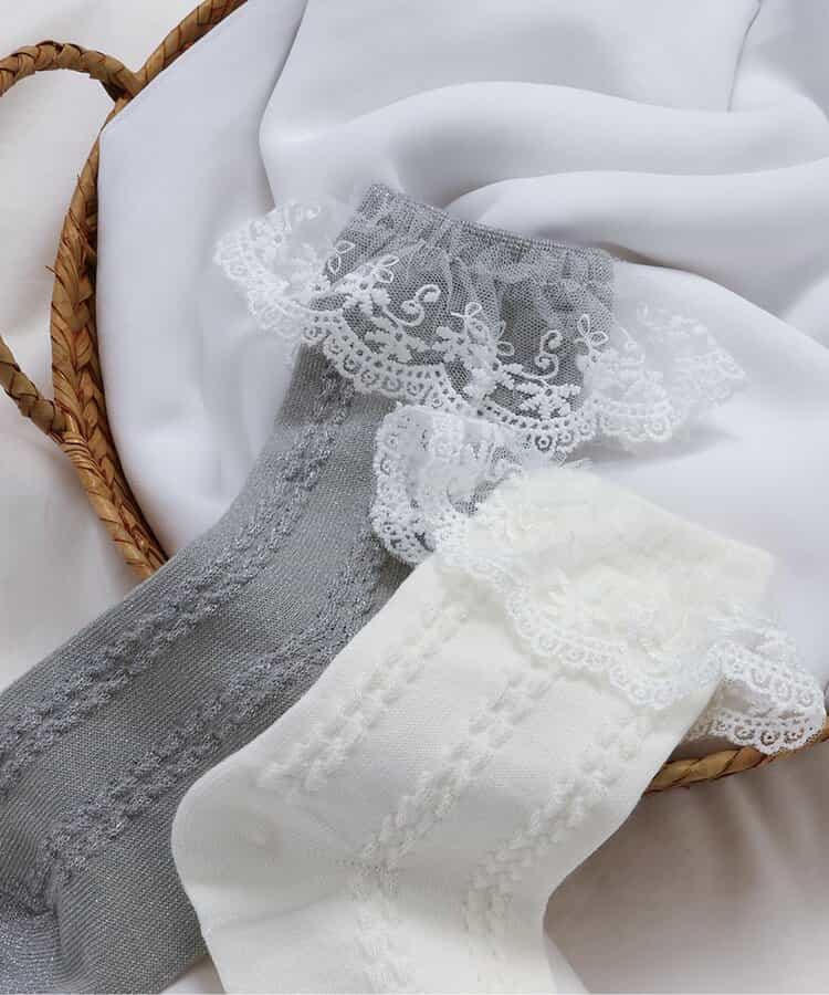 apres les cours(アプレレクール)のタイツ・ソックス「スカラップレースソックス」は、足元からおしゃれになれるデザイン。おようふくとのスタイリングも楽しんで。