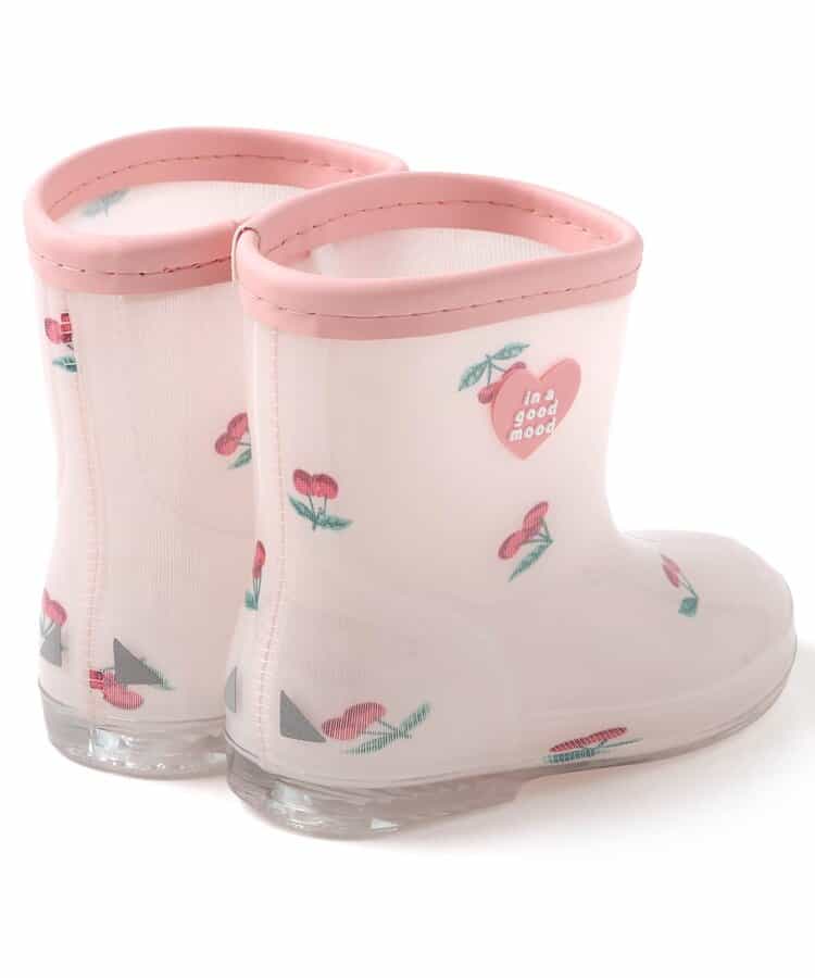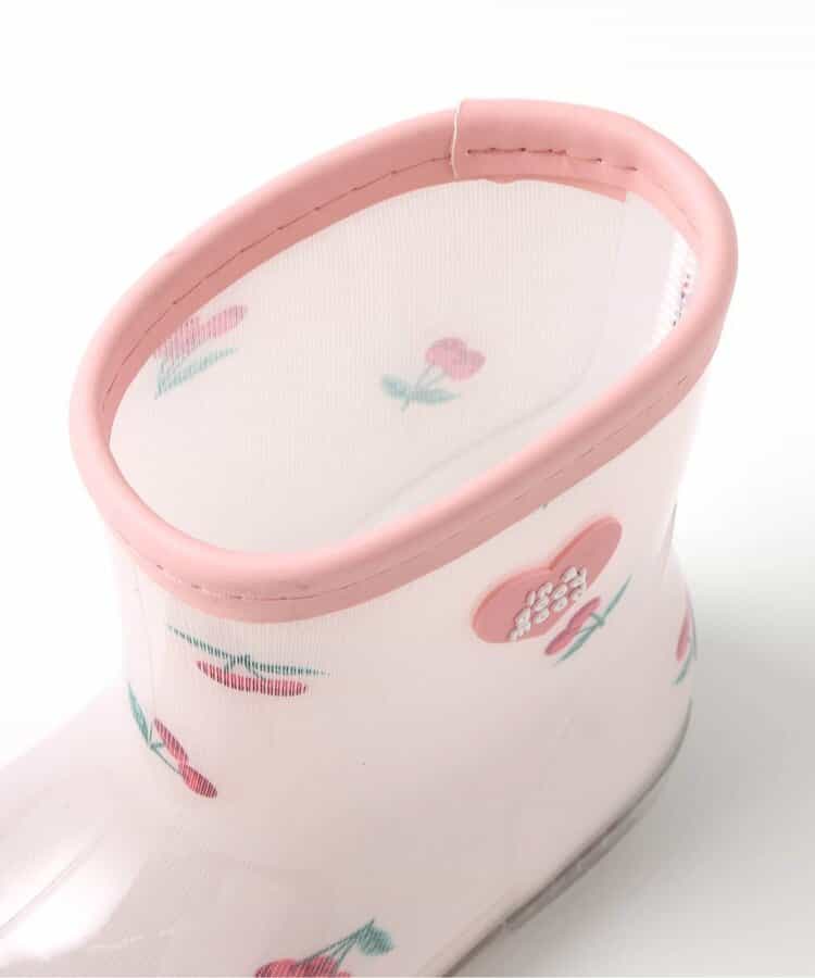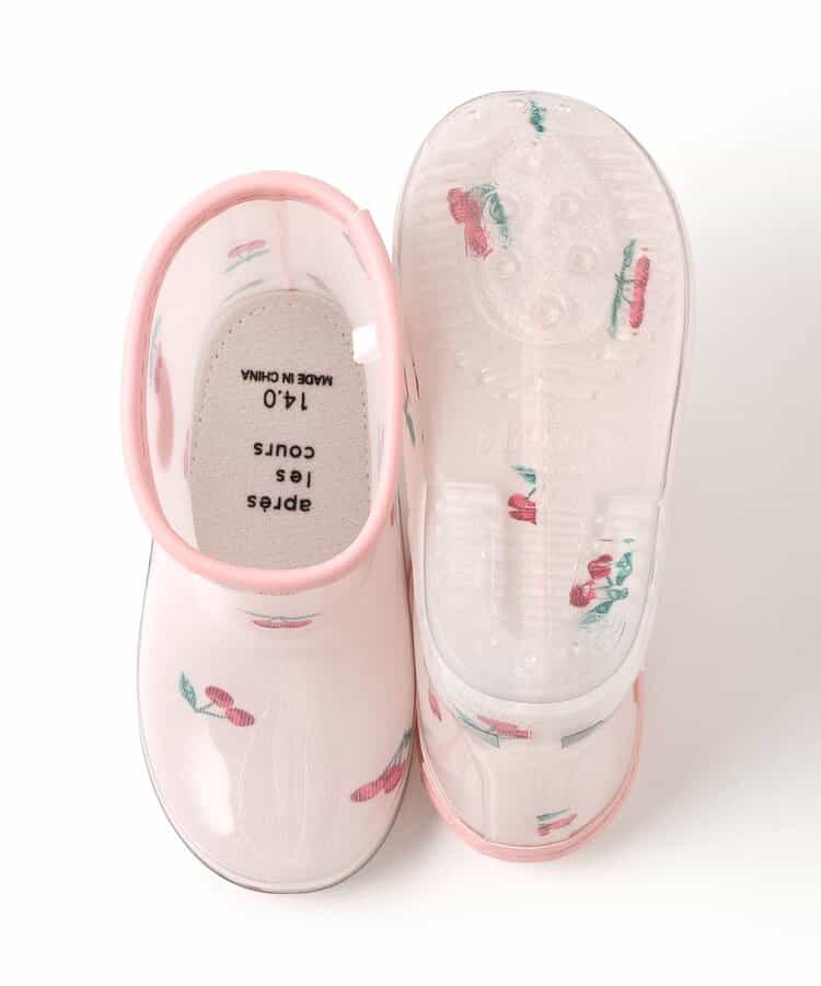 apres les cours(アプレレクール)のレイングッズ「花・ハート・さくらんぼ・恐竜柄柄レインシューズ」は、雨の日でも気持ちが明るくなるような楽しいデザイン。お気に入りのレイングッズでお出かけしよう♪