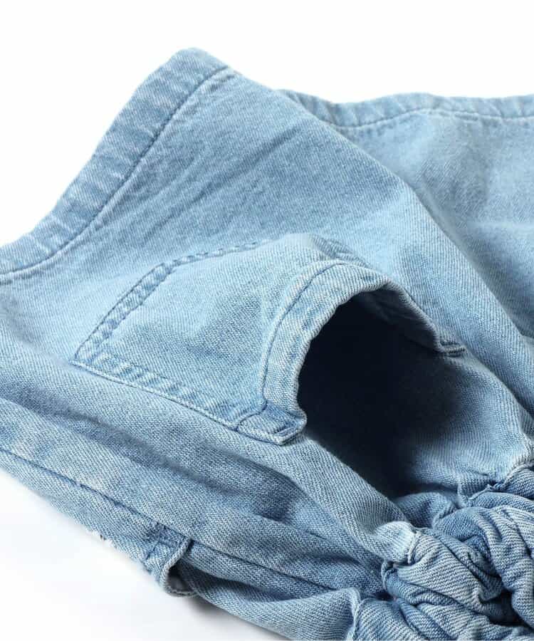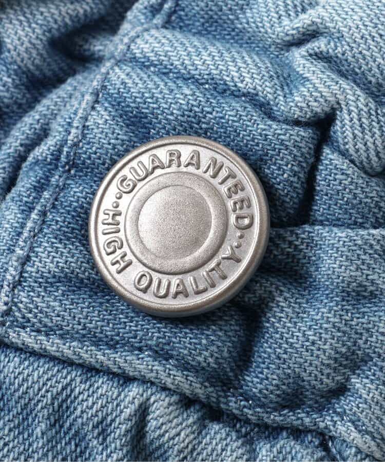 この商品はユーズド感を出す為、製品洗い・製品染め・ブリーチ(脱色)・生地切れ・糸切れ等の2次加工を施しております。