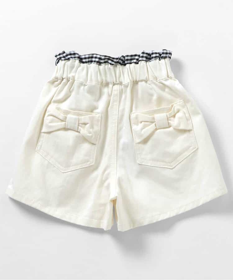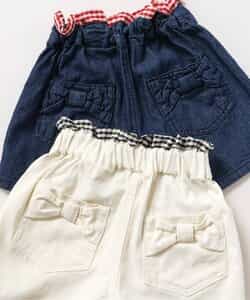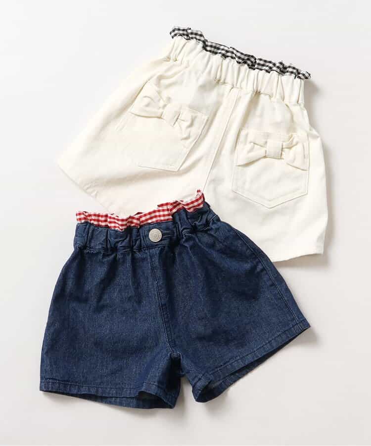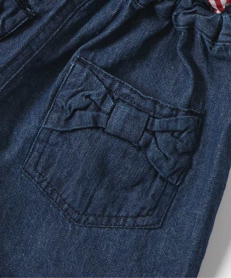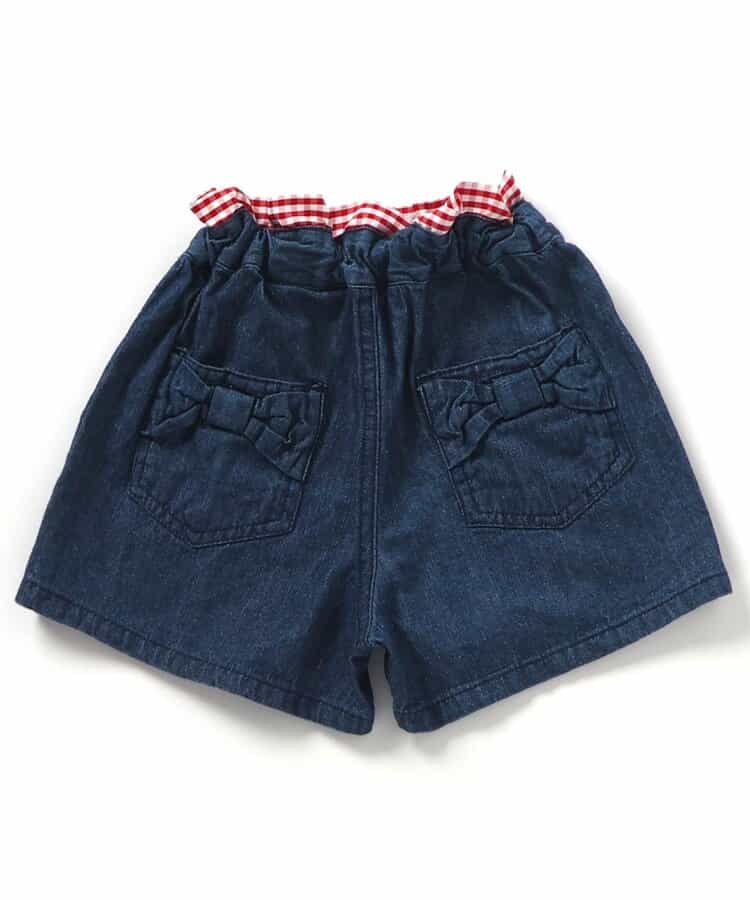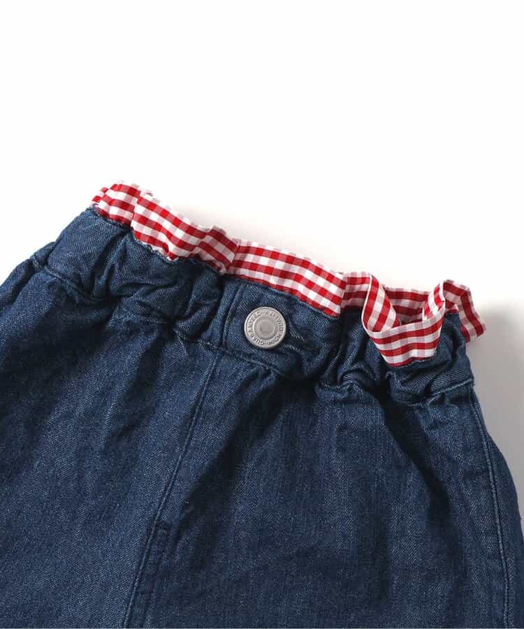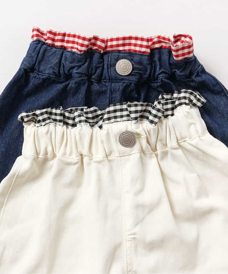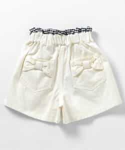 お尻ポケットのリボンがキュート♪ウエストはギンガムチェックのフリルが付いているのでトップスをインしたコーデもおすすめ!WEBでしか手に入らない限定アイテムです。<お取り扱いのご注意>この商品はユーズド感を出す為、製品洗い・製品染め・ブリーチ(脱色)・生地切れ・糸切れ等の2次加工を施しております。製品の特性上1枚ずつの加工となり、多少の歪み・シワ・色の出方・風合い・サイズ等1枚ごとに微妙に違います。尚、着用や洗濯を繰り返すことにより加工が徐々に進行し、あたり・ほつれなどが表れます。以上の点をご留意の上、他の製品では味わえない雰囲気をお楽しみ下さい。