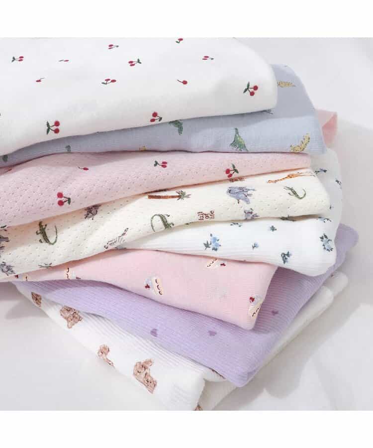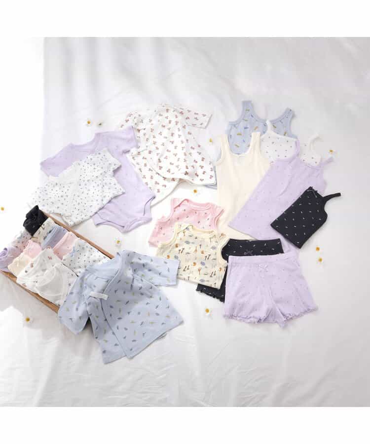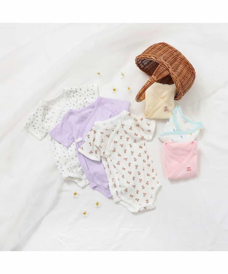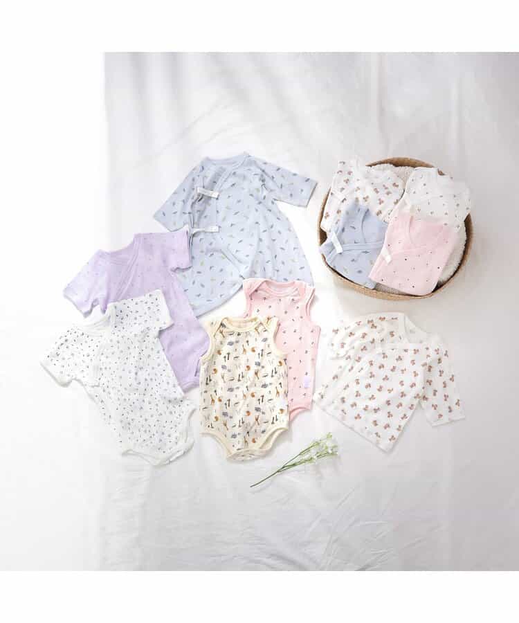 apres les cours(アプレレクール)の肌着「ベビー半袖リブグレコ肌着 総柄・ワンポイント」は、やさしい色合いとデザインでベビーギフトや出産祝いにもおすすめ*