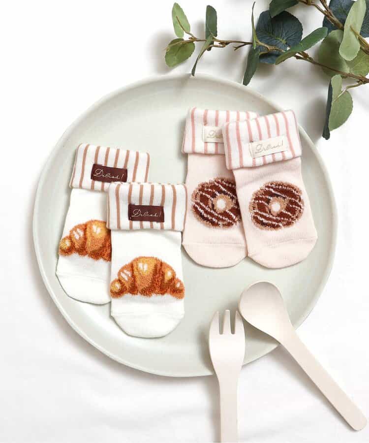 apres les cours(アプレレクール)のタイツ・ソックス「おやつ柄ベビーソックス」は、足元からおしゃれになれるデザイン。おようふくとのスタイリングも楽しんで。靴下のSS・S・10-12cm・13-15cm、タイツの70-80cm・80-90cm・90-100cmには基本的に靴下に滑り止め加工がございます。(一部除外あり)