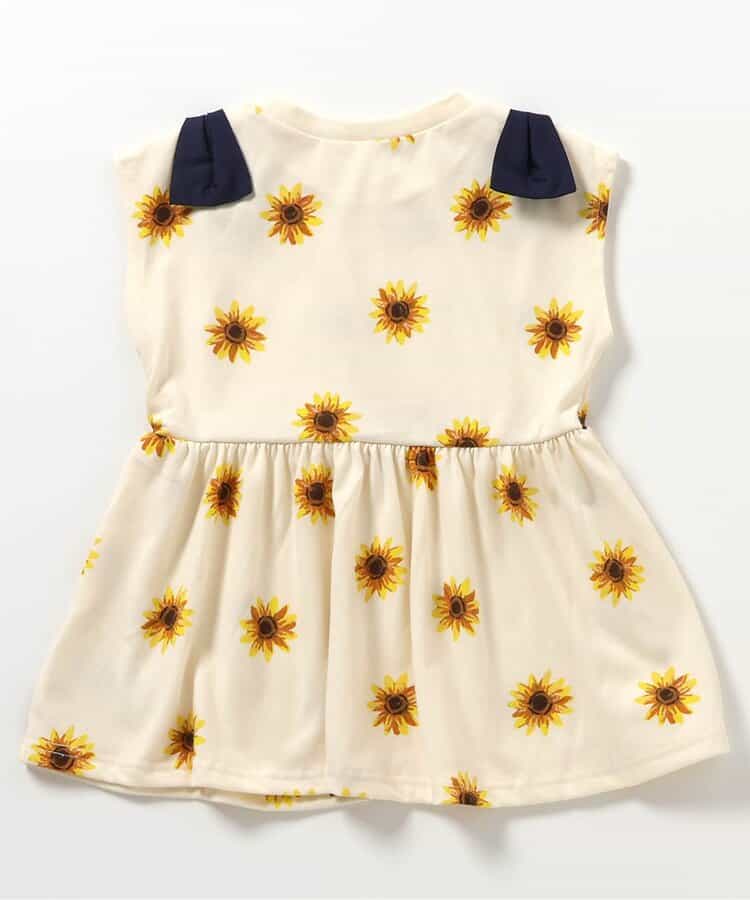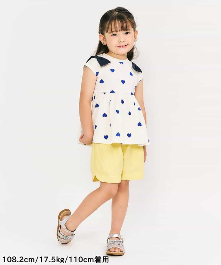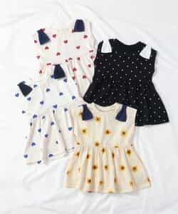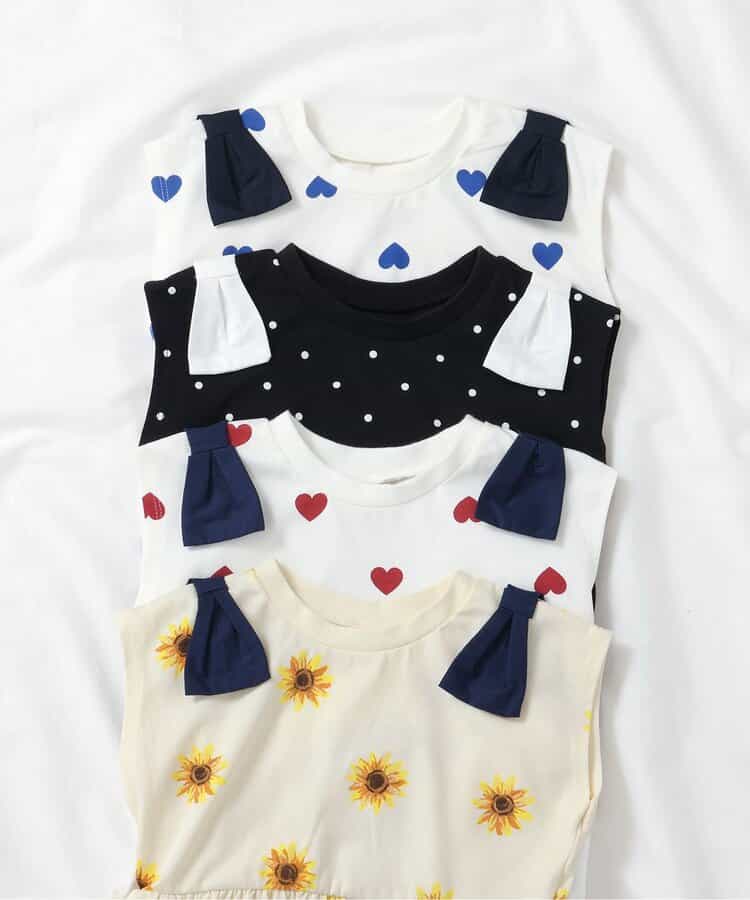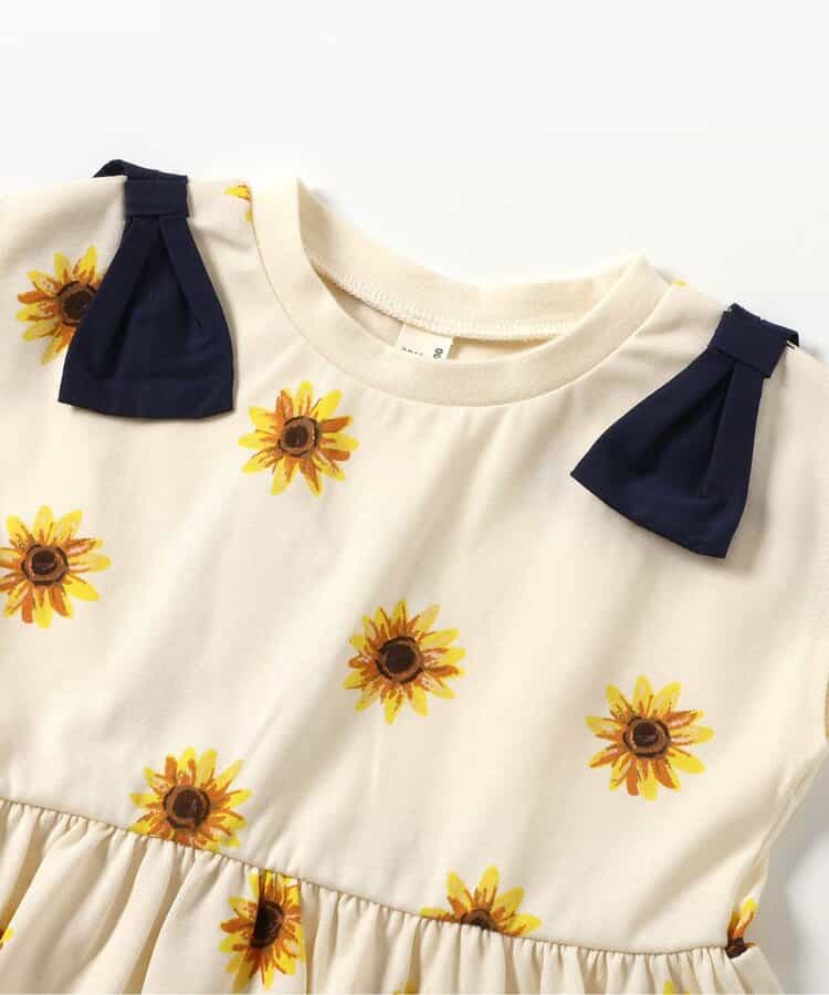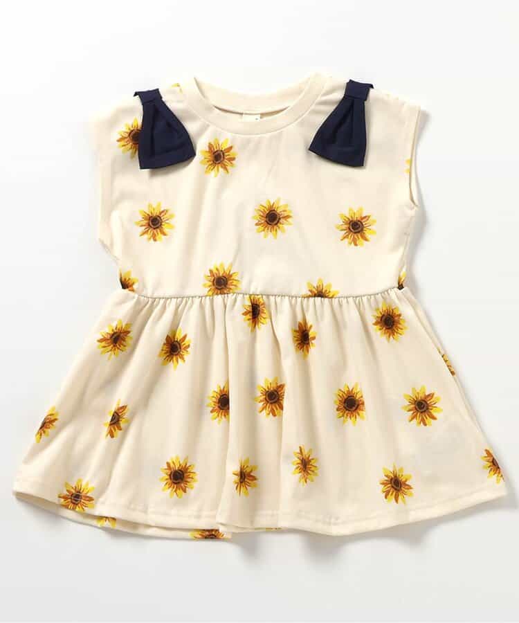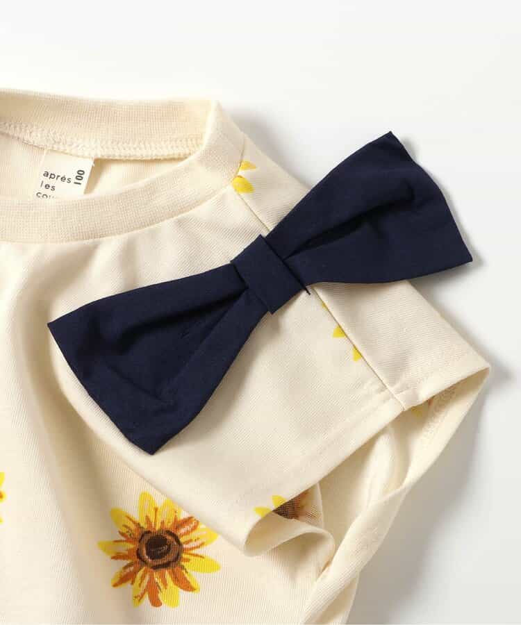 《 apres les cours:夏、あいする? 》肩リボンがワンポイントでカワイイ接触冷感素材の夏トップス♪定番人気の、ドット柄やハート柄夏らしさ満載のひまわり柄。ウエストが切り替えデザインになっていて裾に向かってふわっと広がるシルエットがカワイイ1枚。1枚でさらっと着ても、おしゃれなお出かけコーデが完成します*接触冷感素材で夏の通園通学やおでかけも快適でこの夏ヘビロテしたいトップスです。 ▼ワンピースタイプも販売中▼お揃いの「肩リボン花びらスリーブヒロインワンピース」はこちら >> <お取り扱いのご注意>この商品は着用中の摩擦や洗濯により毛羽の乱れ、毛羽脱落、毛玉が生じることが有ります。できるだけ美しくご利用頂く為に次のことにご留意下さい。○毛玉は毛玉取り器またはハサミで丁寧にカットして下さい。○毛羽が他に付着した際はテープやブラシで除去して下さい。○他の製品とは洗わず、単独でお洗濯して下さい。○タンブル乾燥はお避け下さい。