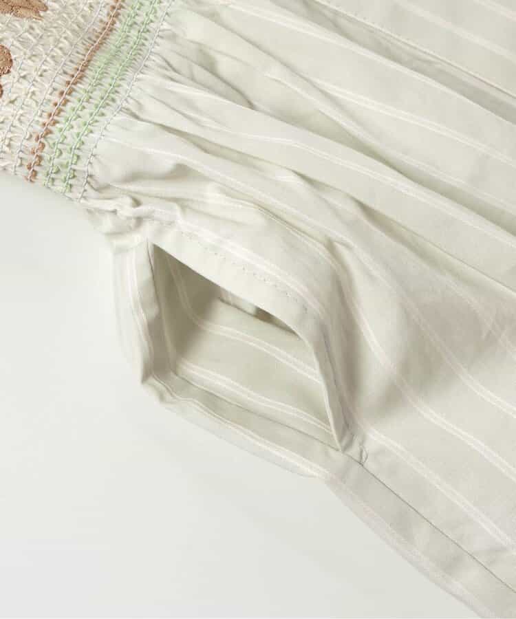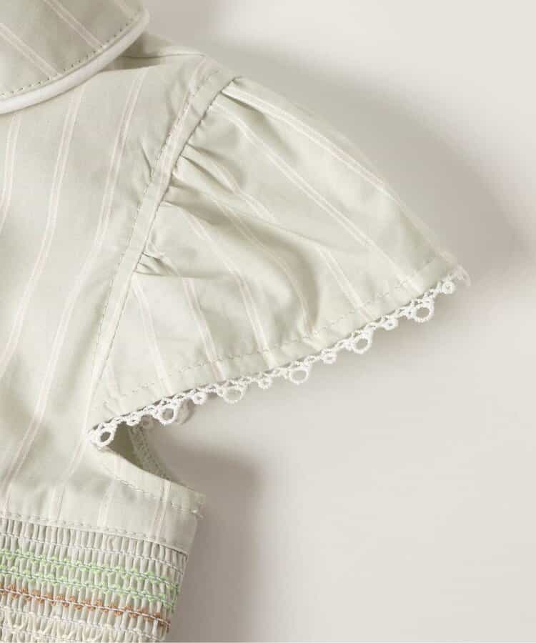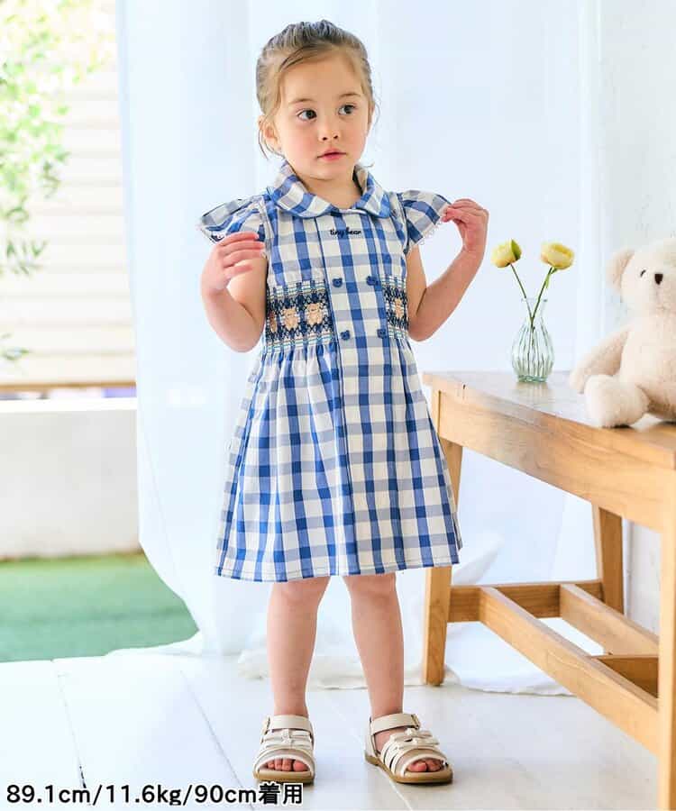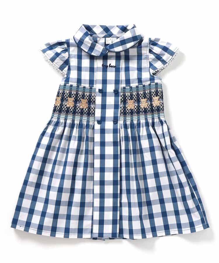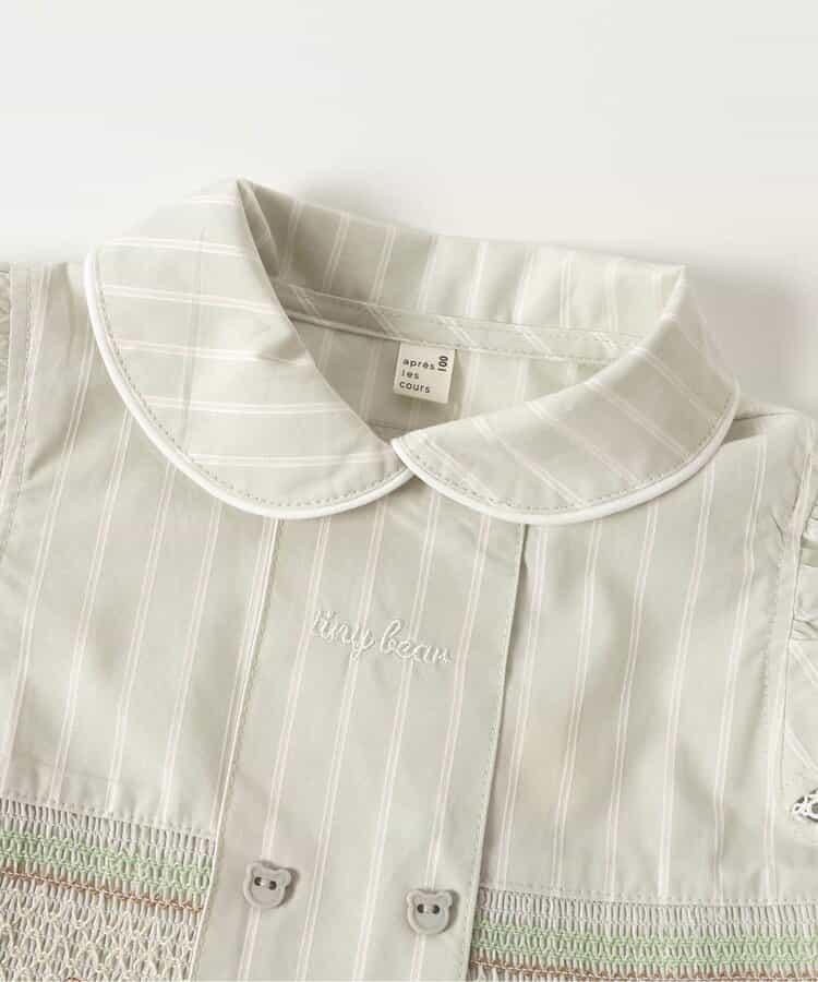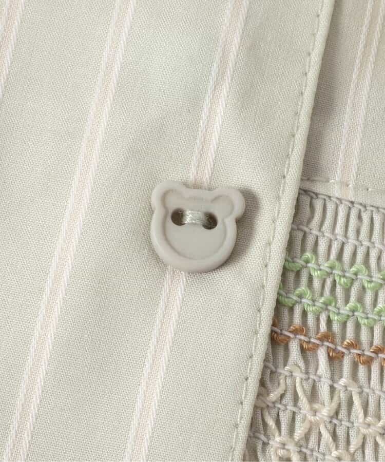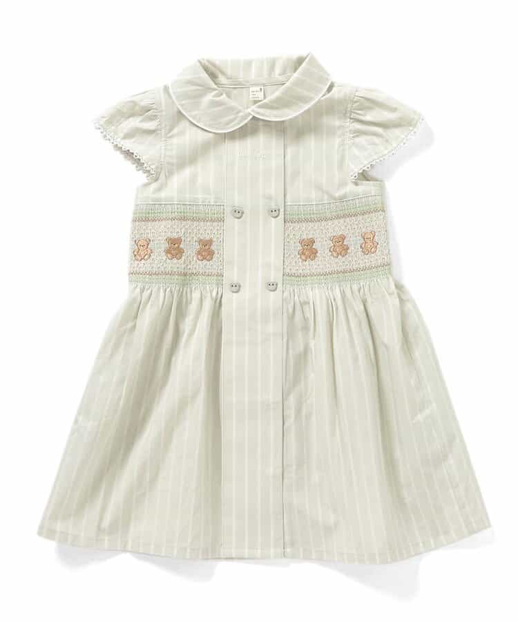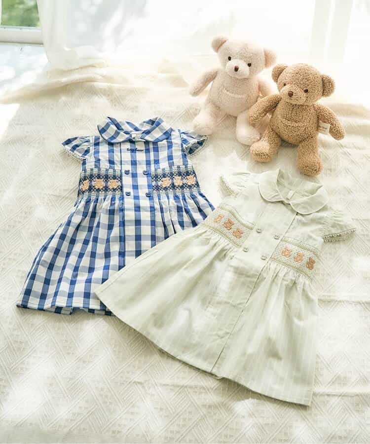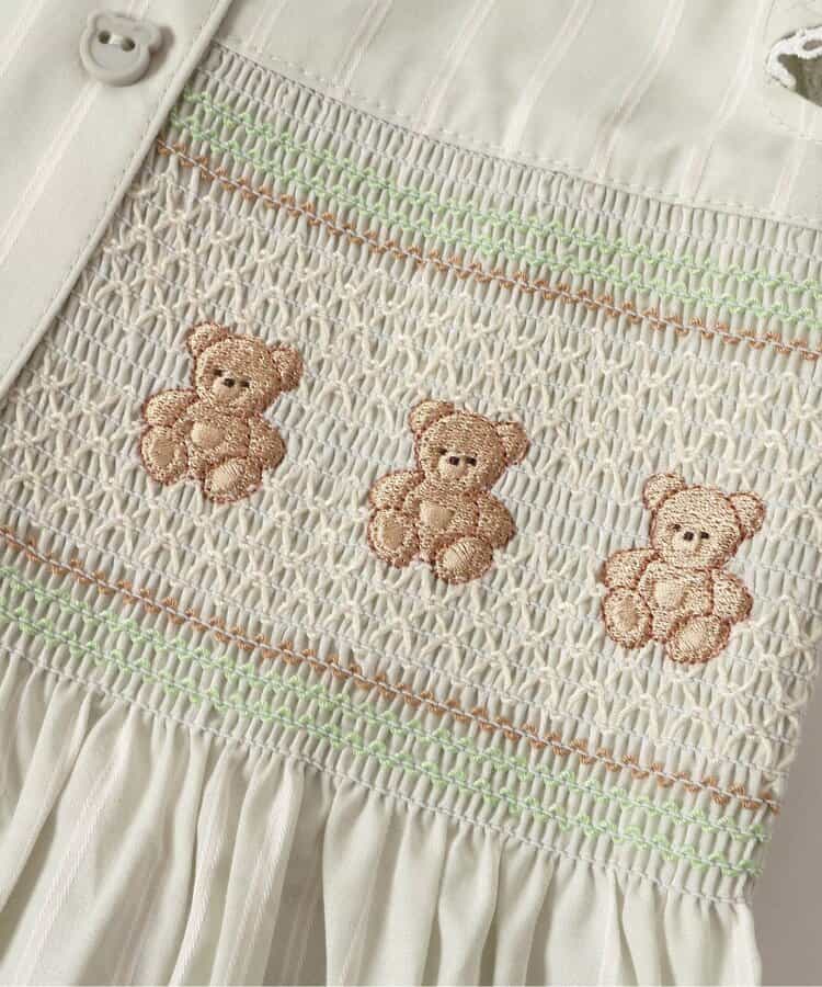 胸元はタイニーベアがちょこんと座っているスモッキング刺繍デザイン。