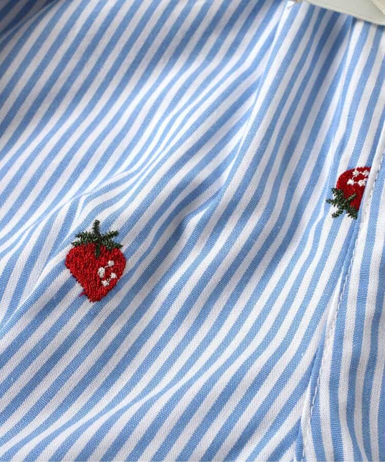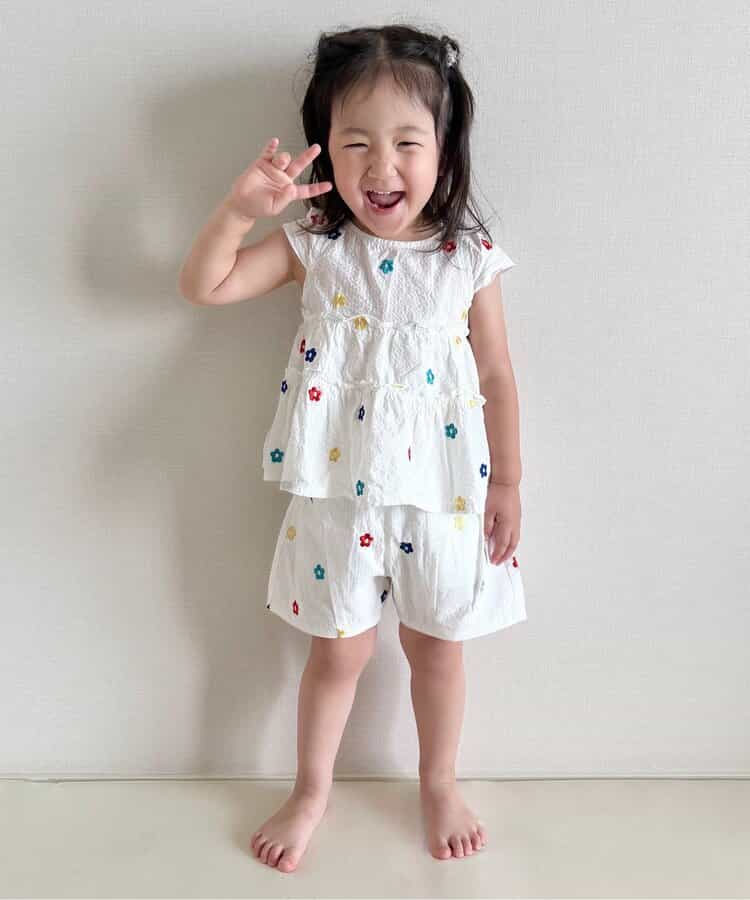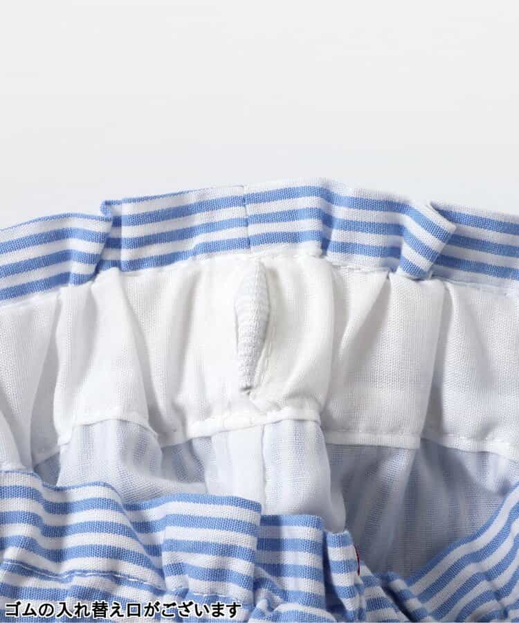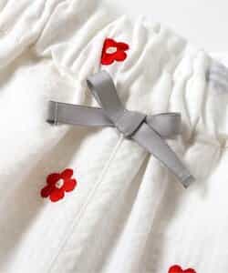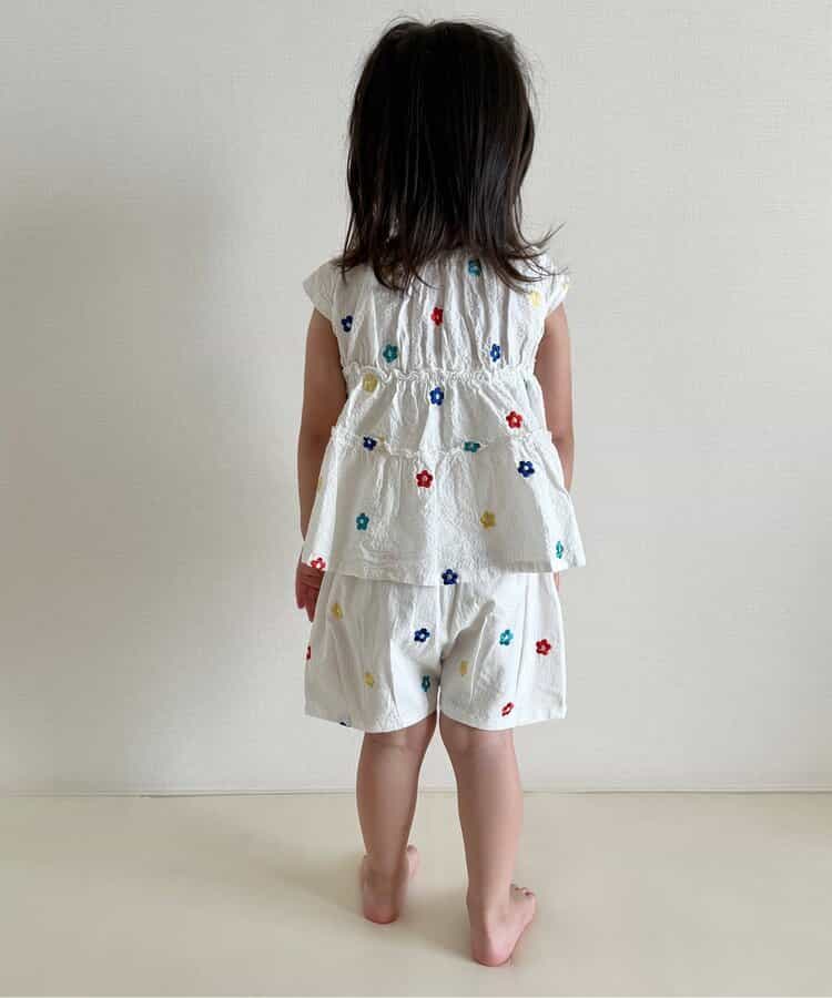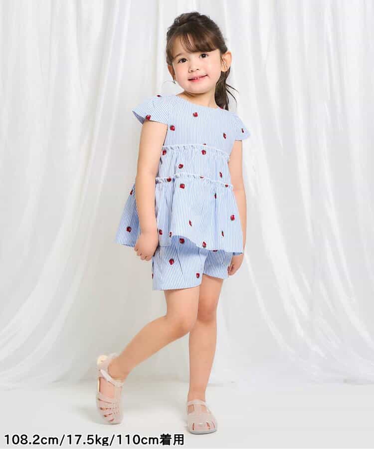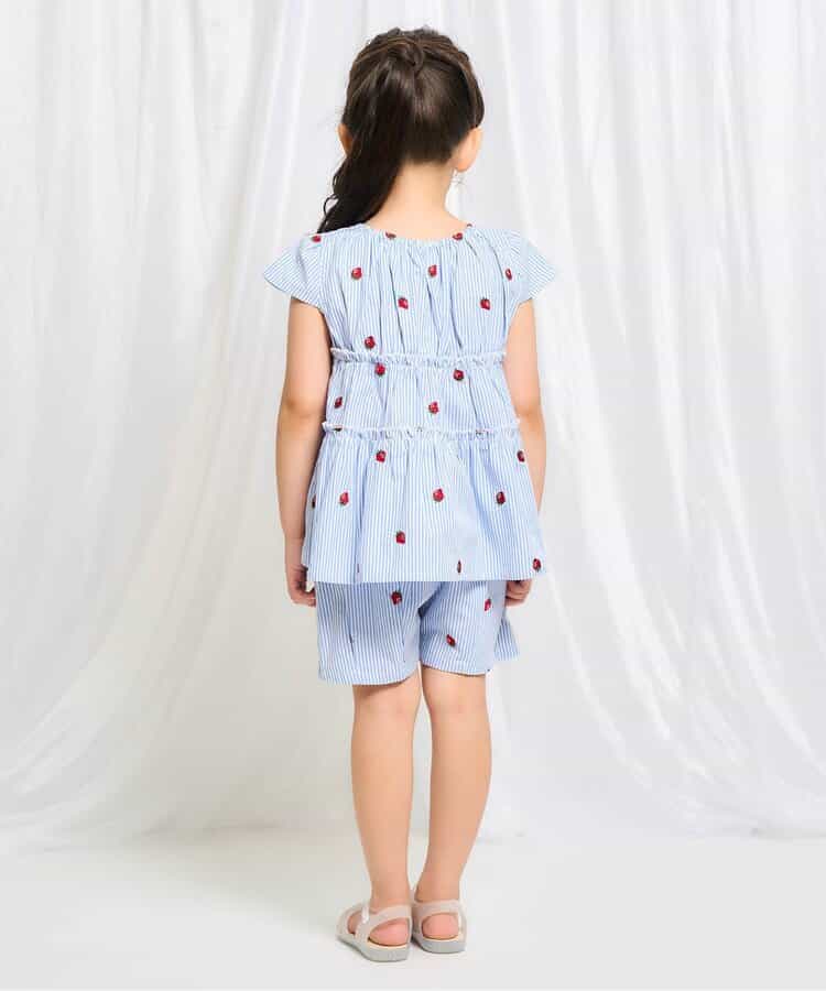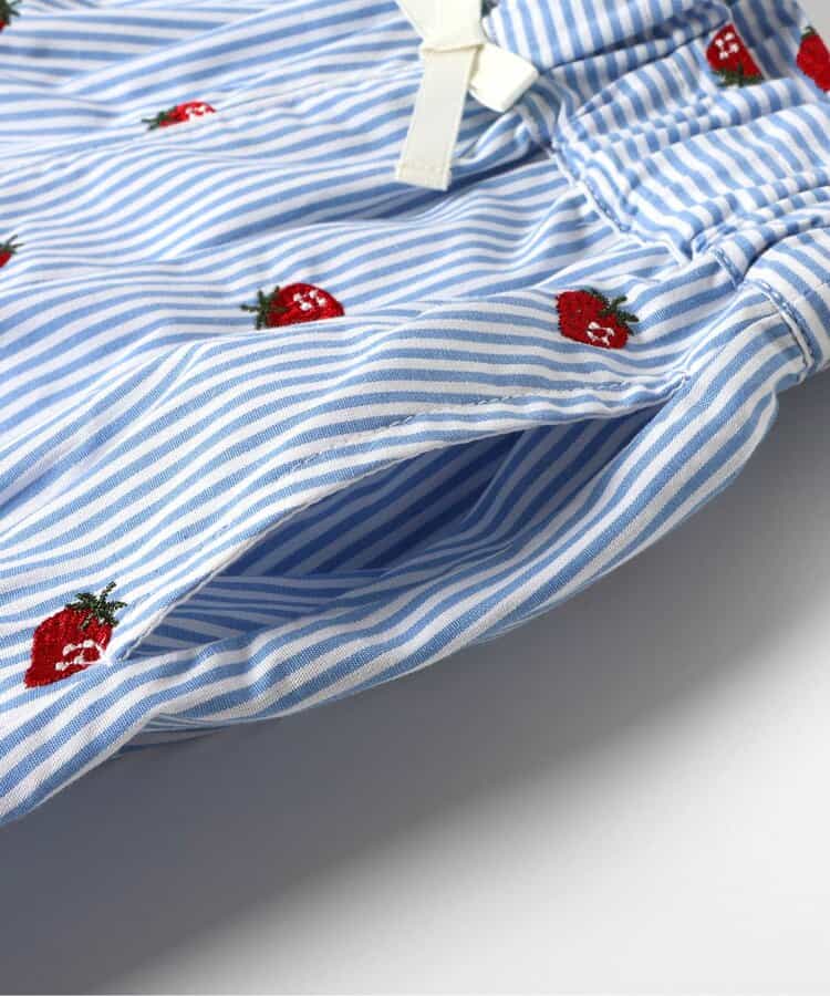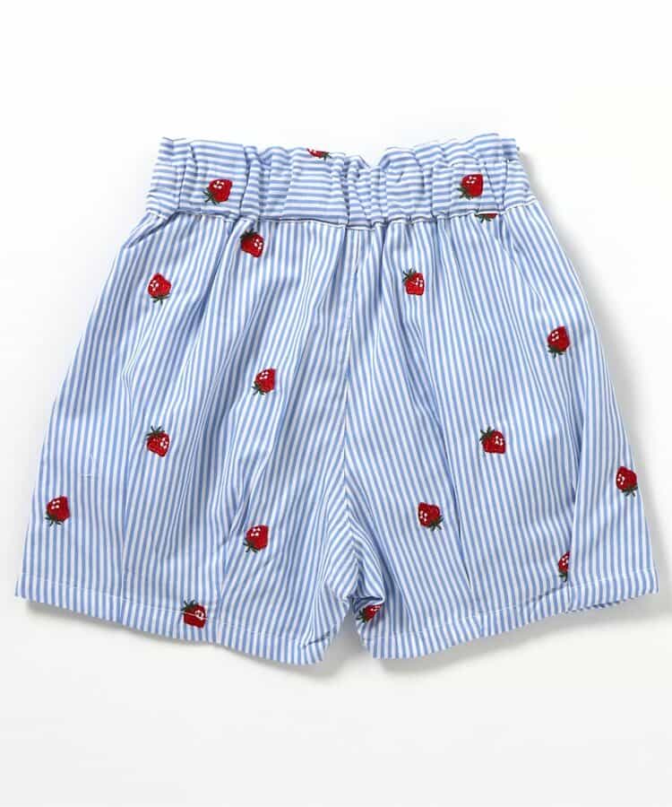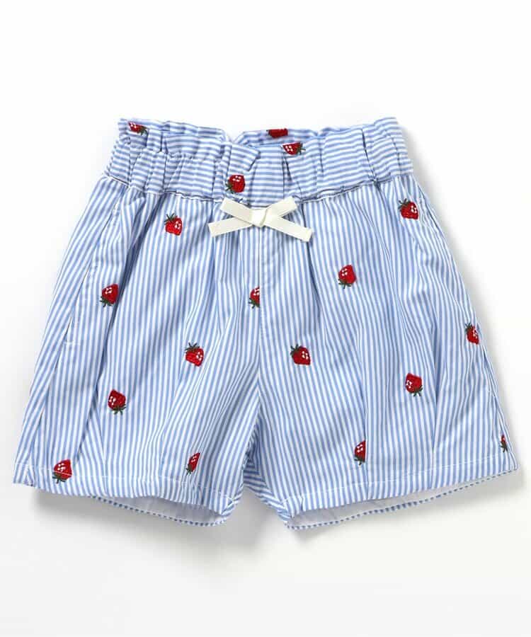 タックがはいったバルーンシルエットのショートパンツ。夏らしいカラーで爽やか♪シンプルなトップスとあわせても、かわいいコーデに仕上がります。お揃い柄のチュニックと合わせてセットアップも楽しめます♪(ストライプ)すっきりブルーのストライプにいちごで甘さをプラスオン。おねえさんにもおすすめのカラー♪(アイボリー)カラフルなお花刺繡が元気いっぱいgirlにぴったり★日焼けしたお肌にも合うパッと明るく見せてくれるカラー!お揃いの「3柄ティアード刺繍チュニック」はこちら >>