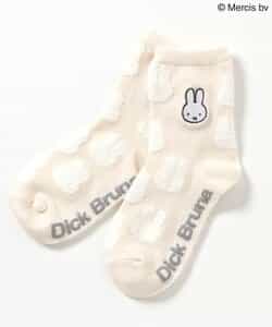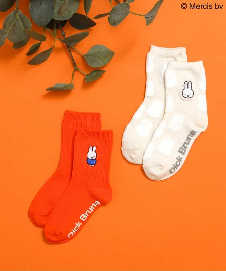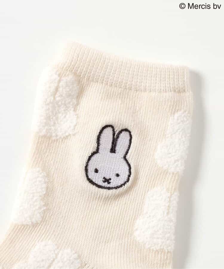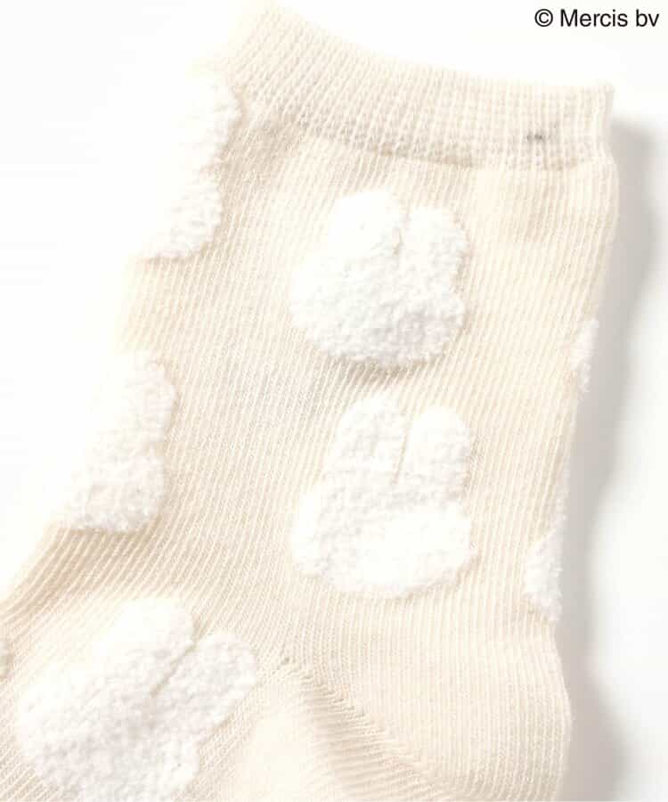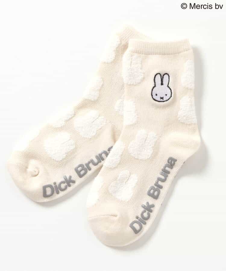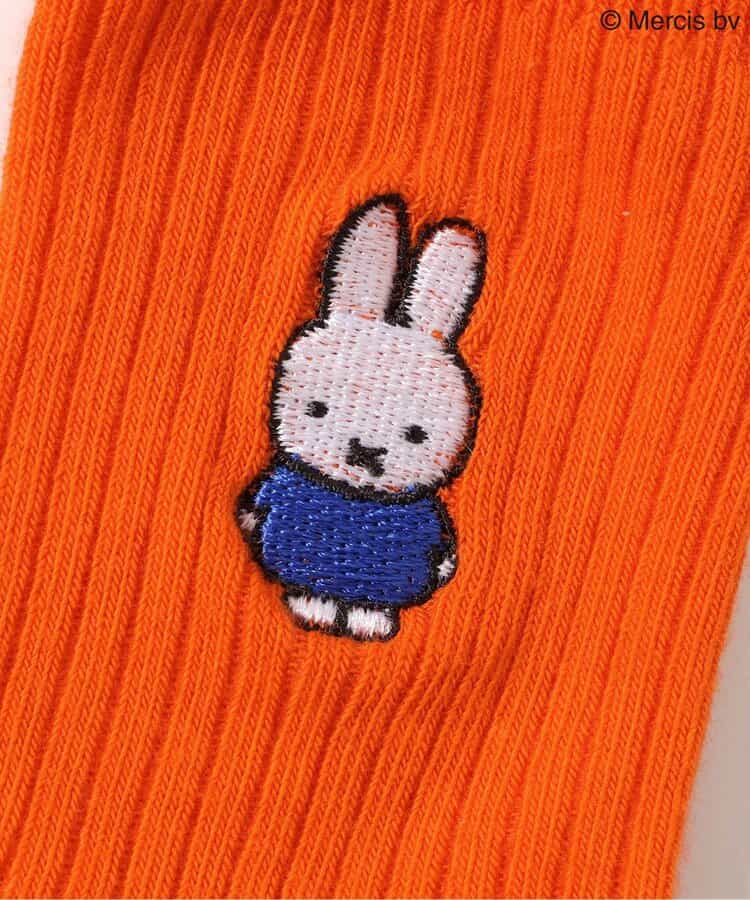 ≪子供服 apres les coursの「ディック・ブルーナ」コレクション≫ミッフィーの刺繍がポイントのソックス。もこもこした総柄のミッフィーがかわいいアイボリーとコーデのアクセントになるオレンジの2色展開。転倒防止対策の滑り止めもついています。パンツやスカートなどどんなコーデにも合わせやすいシンプルなデザインです。