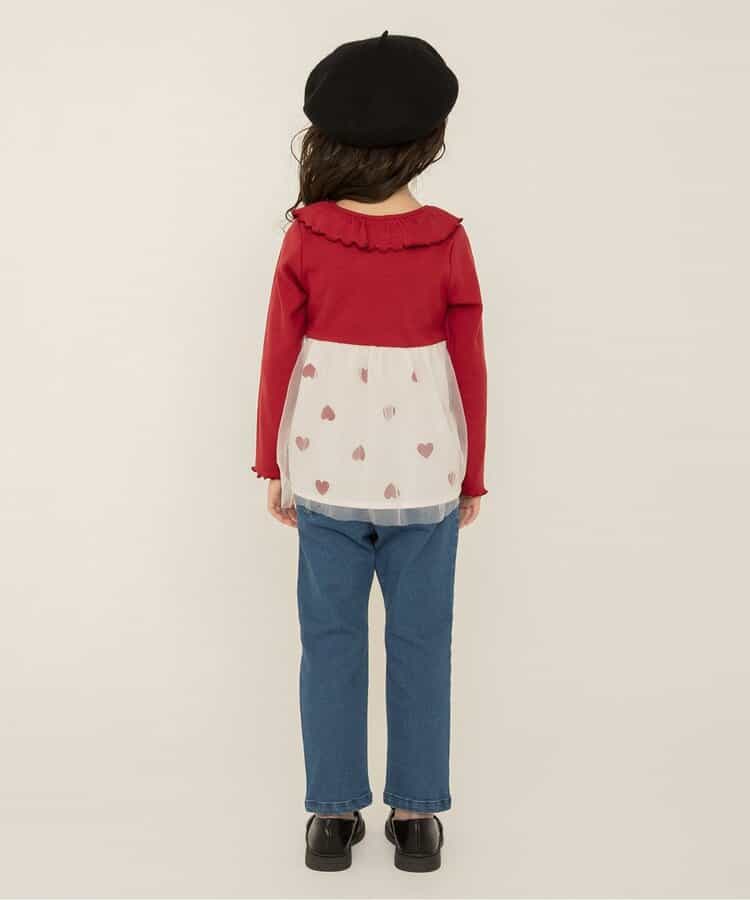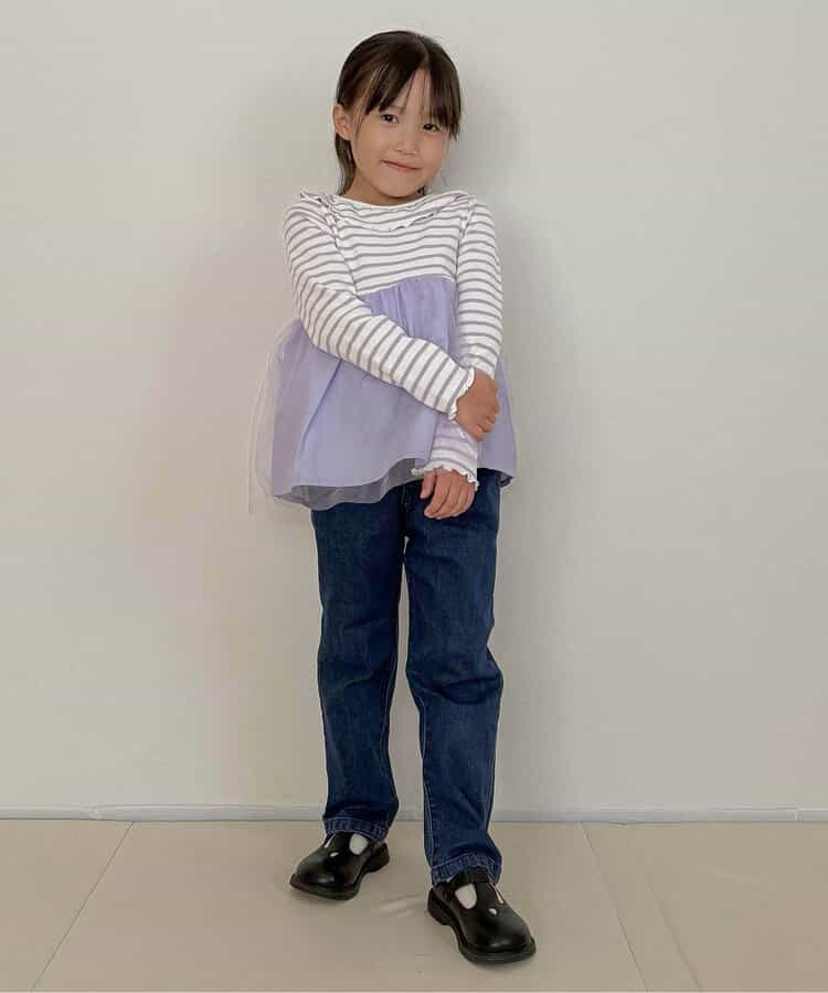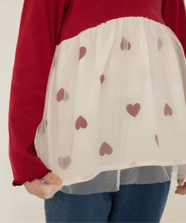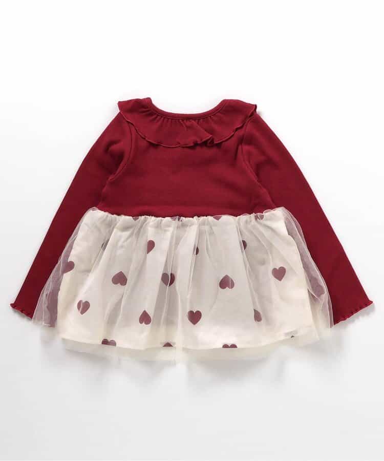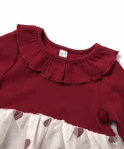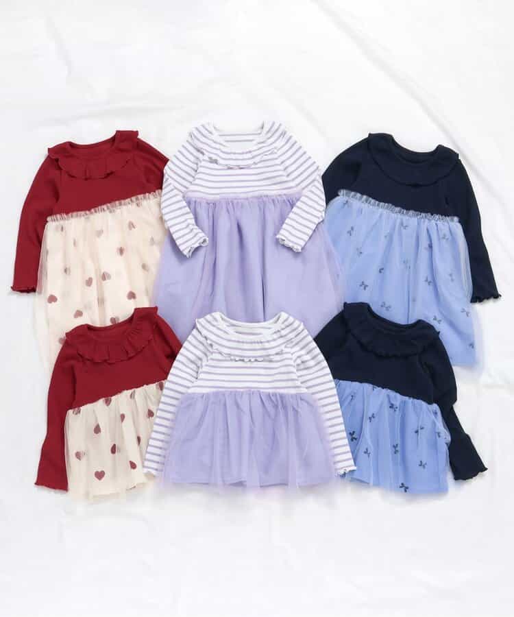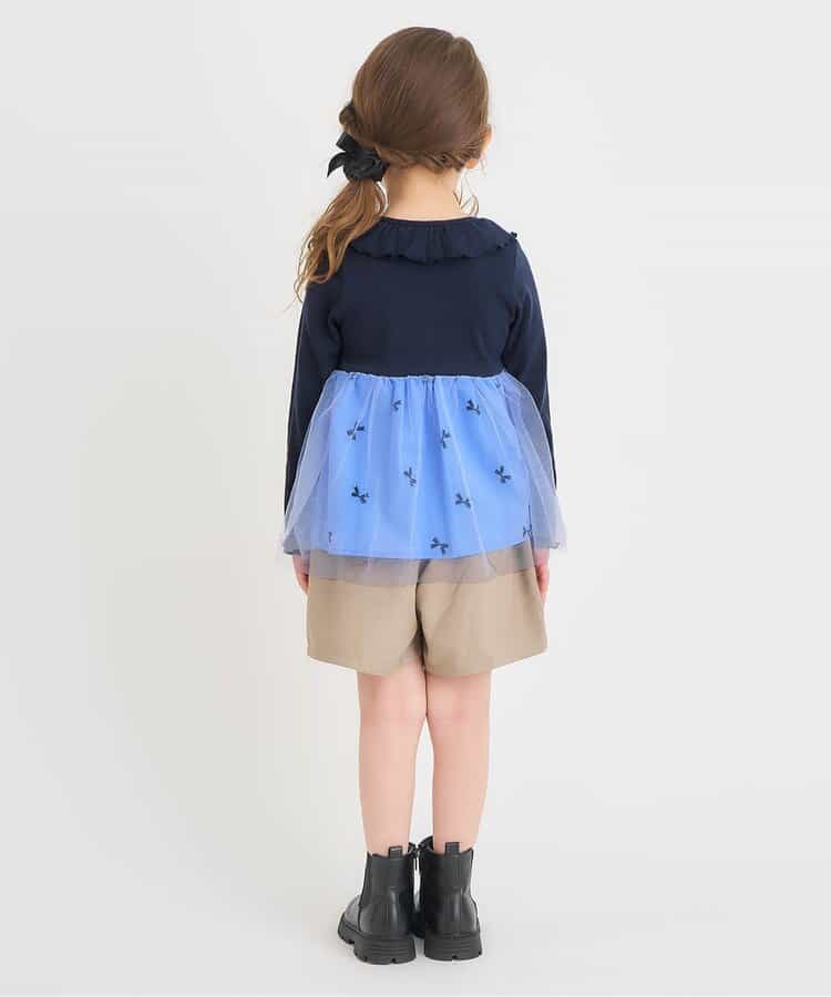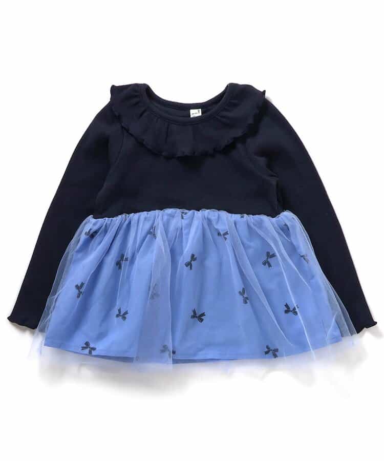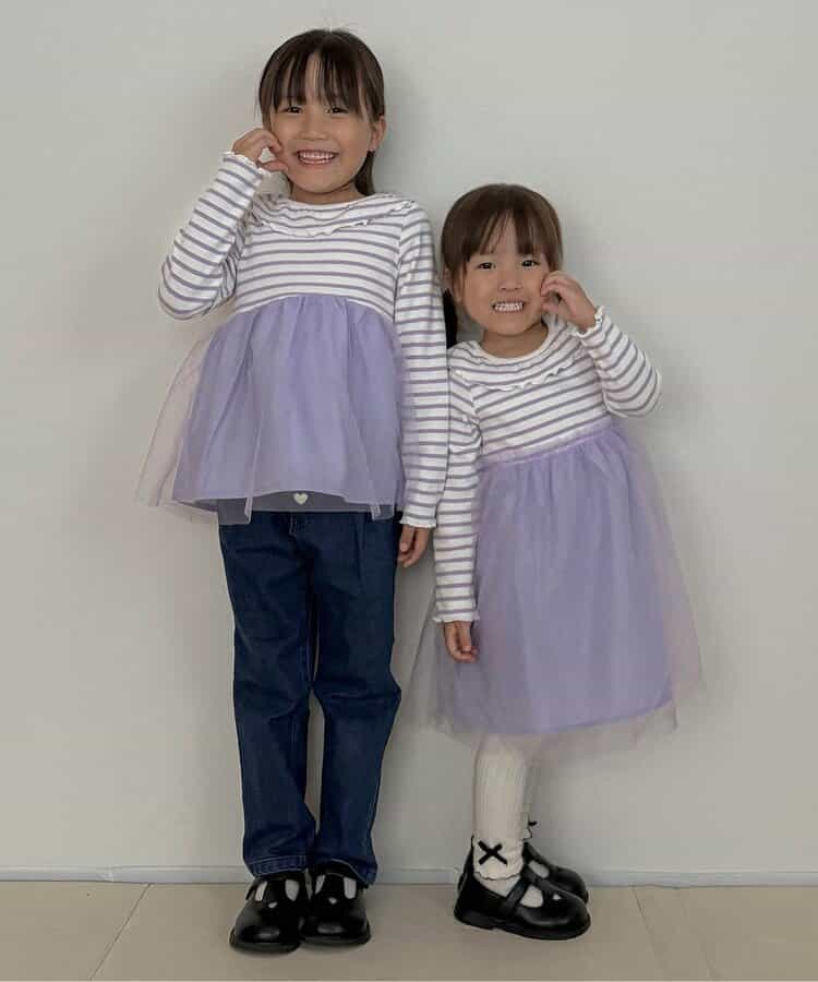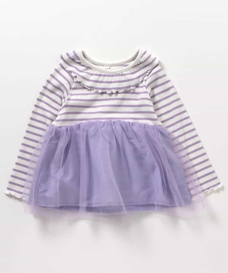 程よいフィット感がありシルエットが綺麗です。 身長76cm、8.5kgの娘で80sizeを着用しており、ヒップの2/3ぐらいの丈感で、お袖は手が半分ほど隠れる丈感です。 ウエストからふわっと広がるチュールがほんと可愛いです!! 首周りは少しゆったりしています。 身頃部分はTシャツ素材で肌触りがよく、伸縮性があり動きやすそうです。 #PR
